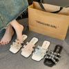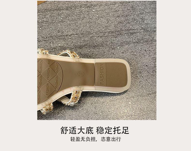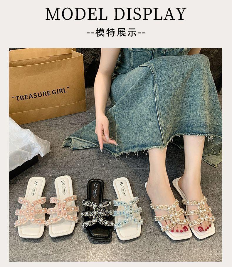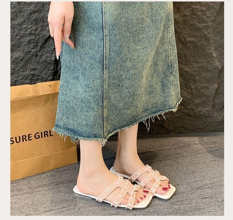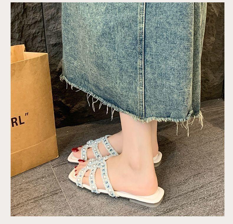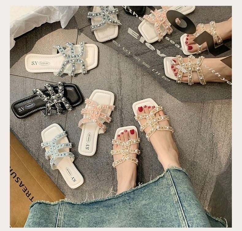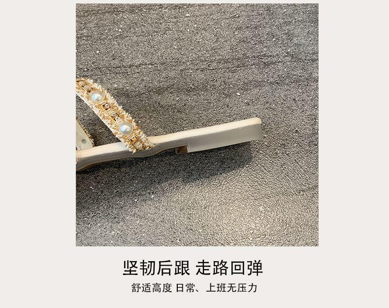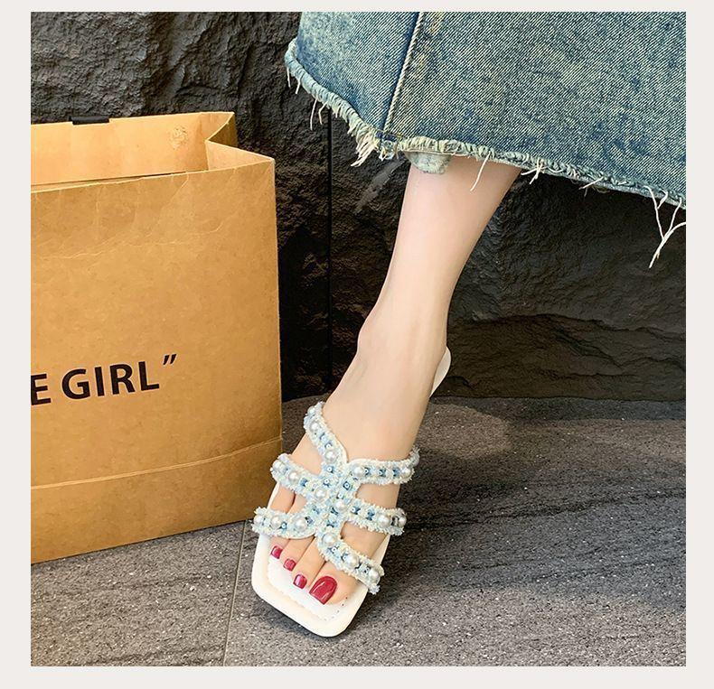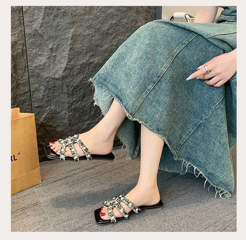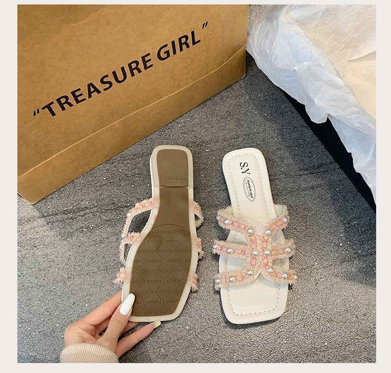 2025 Verano Nuevo Estilo Pequeño Chanel Zapatillas Planas para Mujer para Exterior Suela Suave Estilo Hada Versátiles Perlas Sandalias de Playa Mujer
