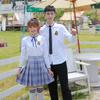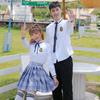 Women's Lace White Long Sleeve + Blue Grey Paid Dress, Men's lace white long sleeve + black trousers + black tie