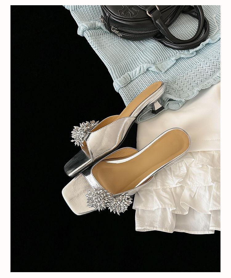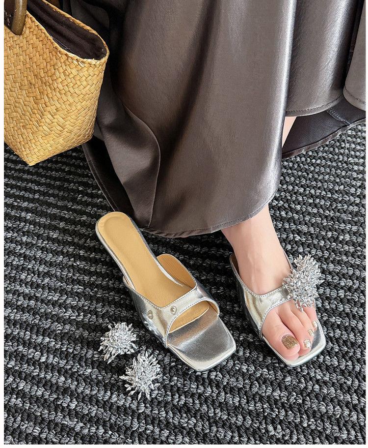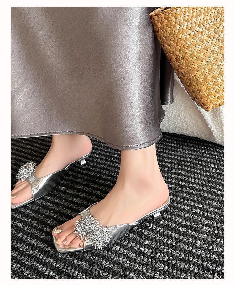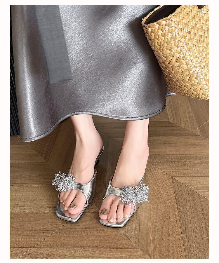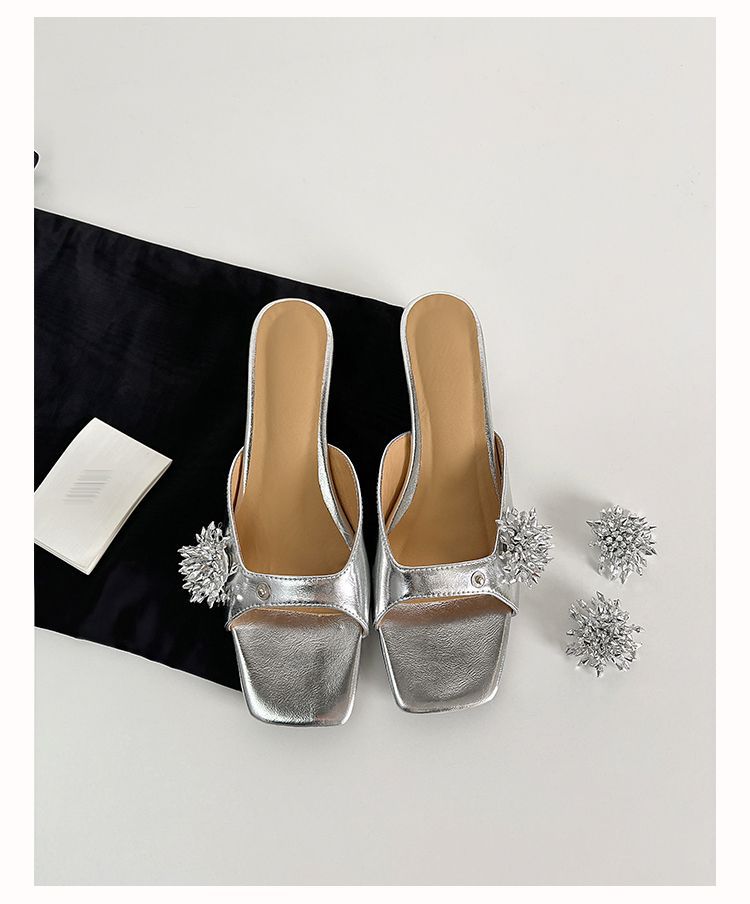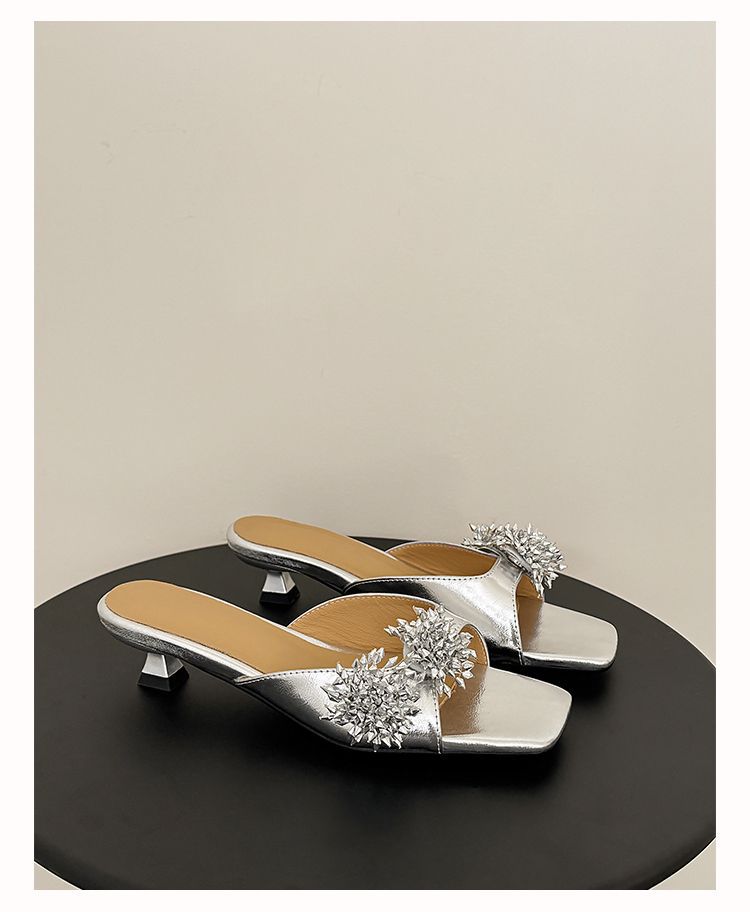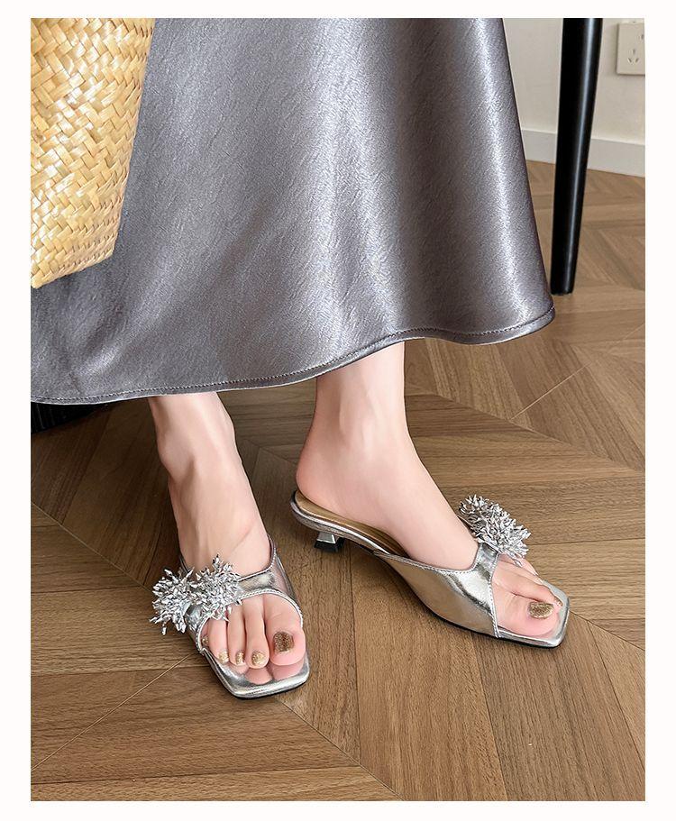 Hermosas Sandalias Florales Plateadas de Estilo Francés para Mujer 2025 Verano Nuevo Versátil Ultra-Cómodo Punta Cuadrada Punta Abierta Sandalias de Tacón Alto