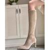 Botas de tacón alto puntiagudas de ante color albaricoque para mujer, nuevas botas finas elásticas de otoño 2024, pero con tacón grueso hasta la rodilla.