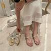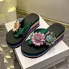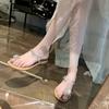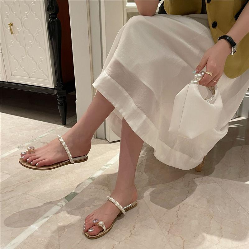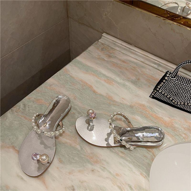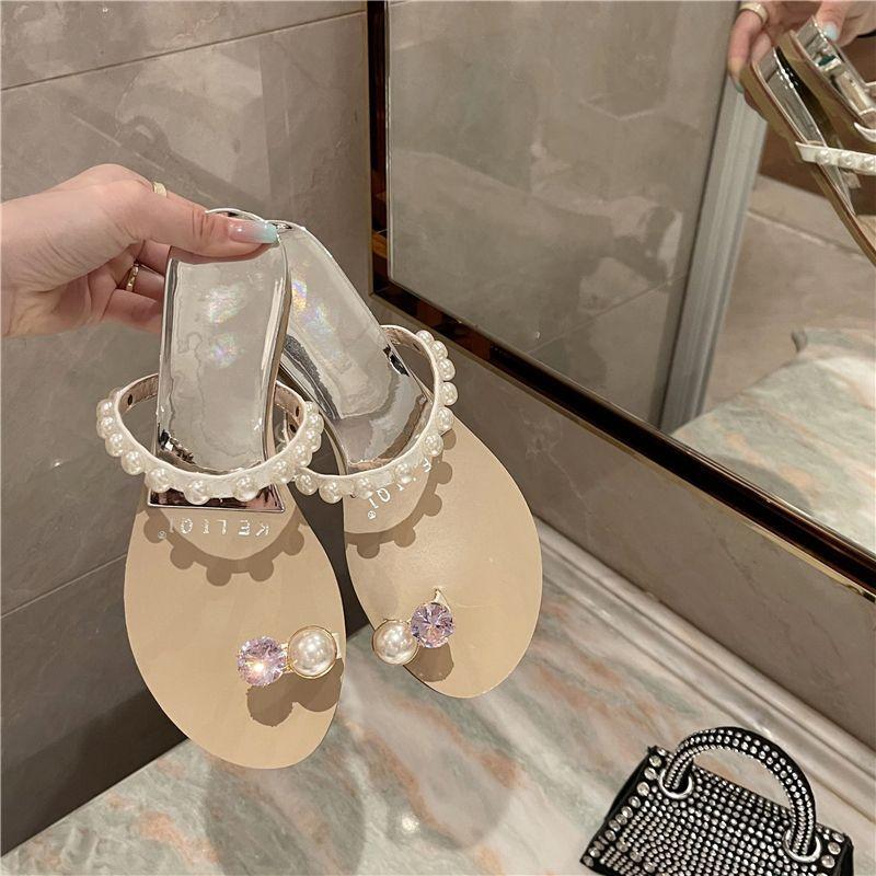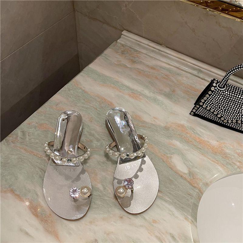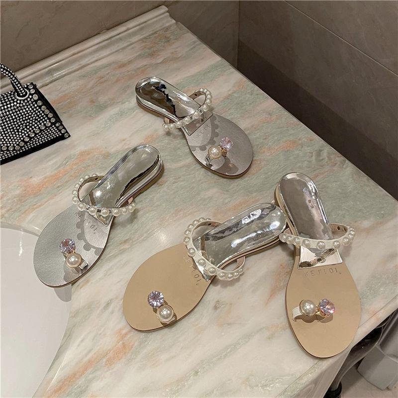 Sandalias Planas Tipo Tanga con Perlas de Estrás Francés para Mujer, Pantuflas de Cuña para Playa para Mujer 2025 Verano Nuevo para Exterior