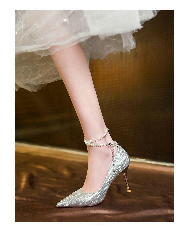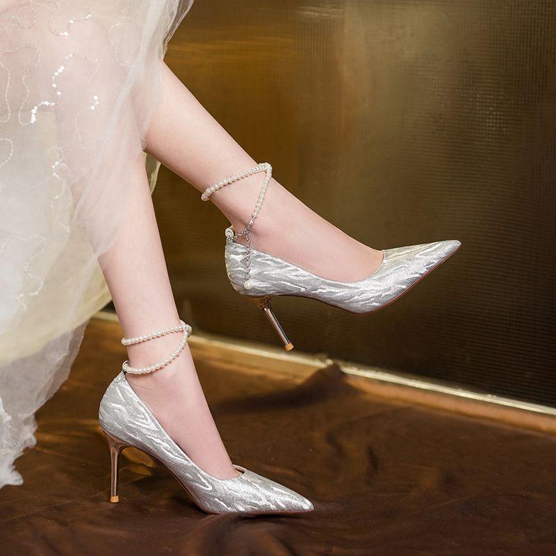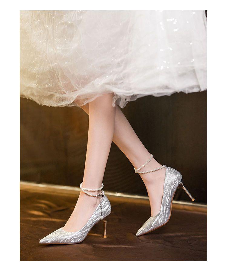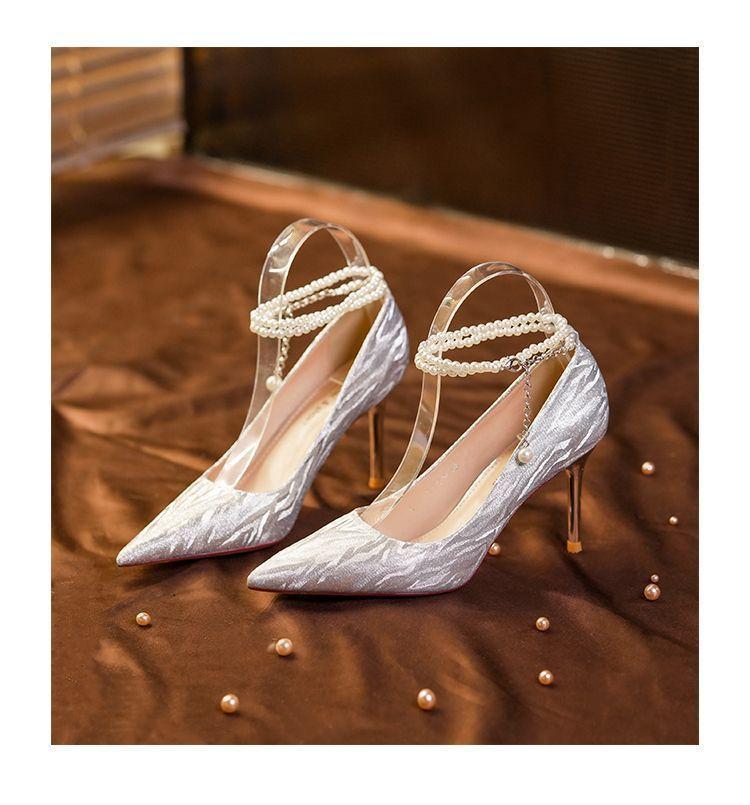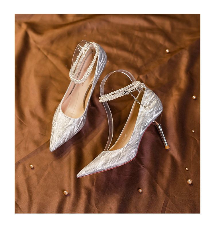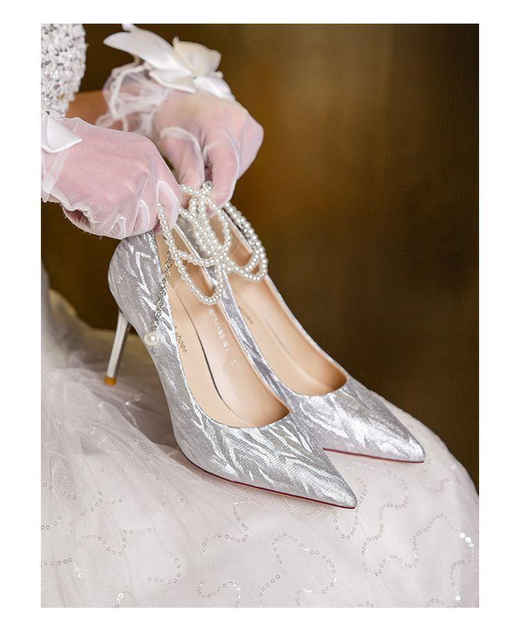Zapatos Individuales Plateados Zapatos de Dama de Honor para Mujer 2025 Nuevo Estilo Punta Afilada Boca Baja Perla Brillante Tacones Altos para Mujer