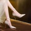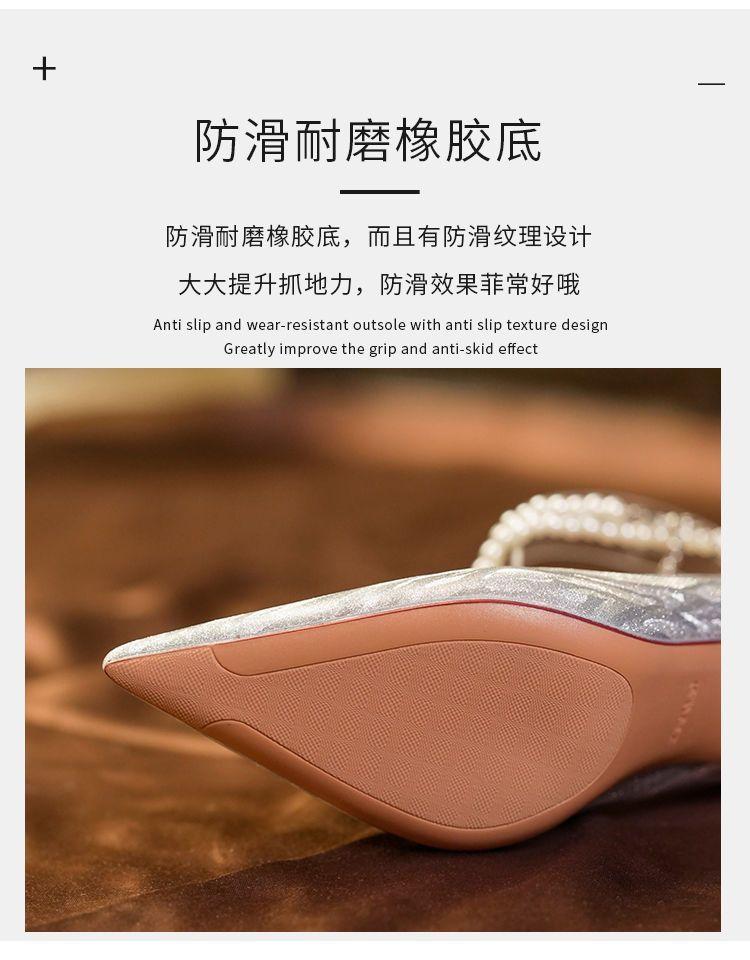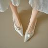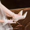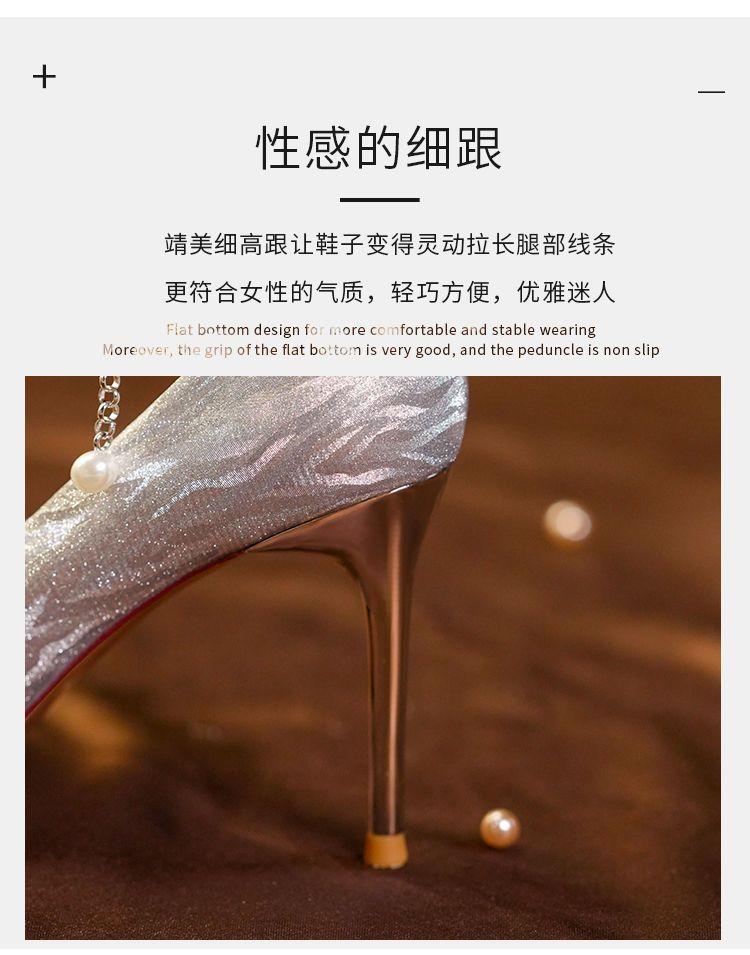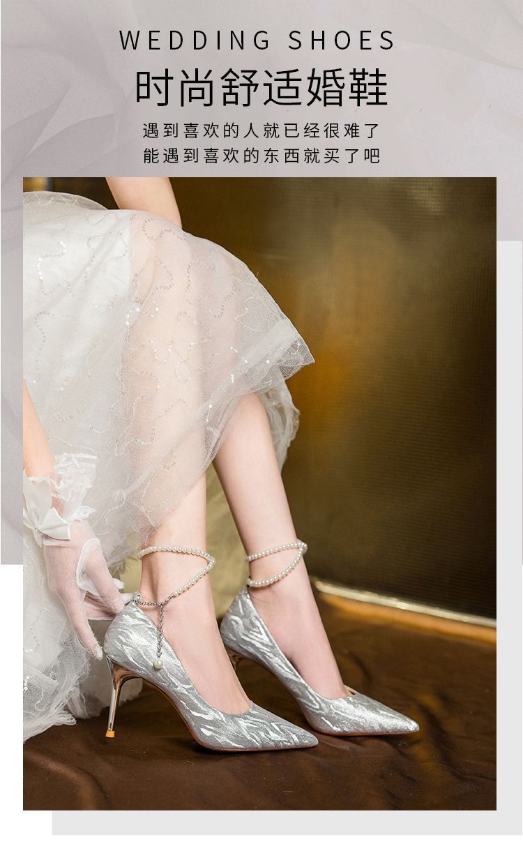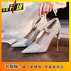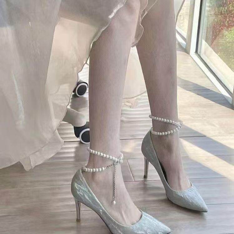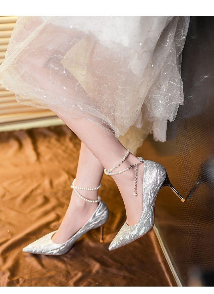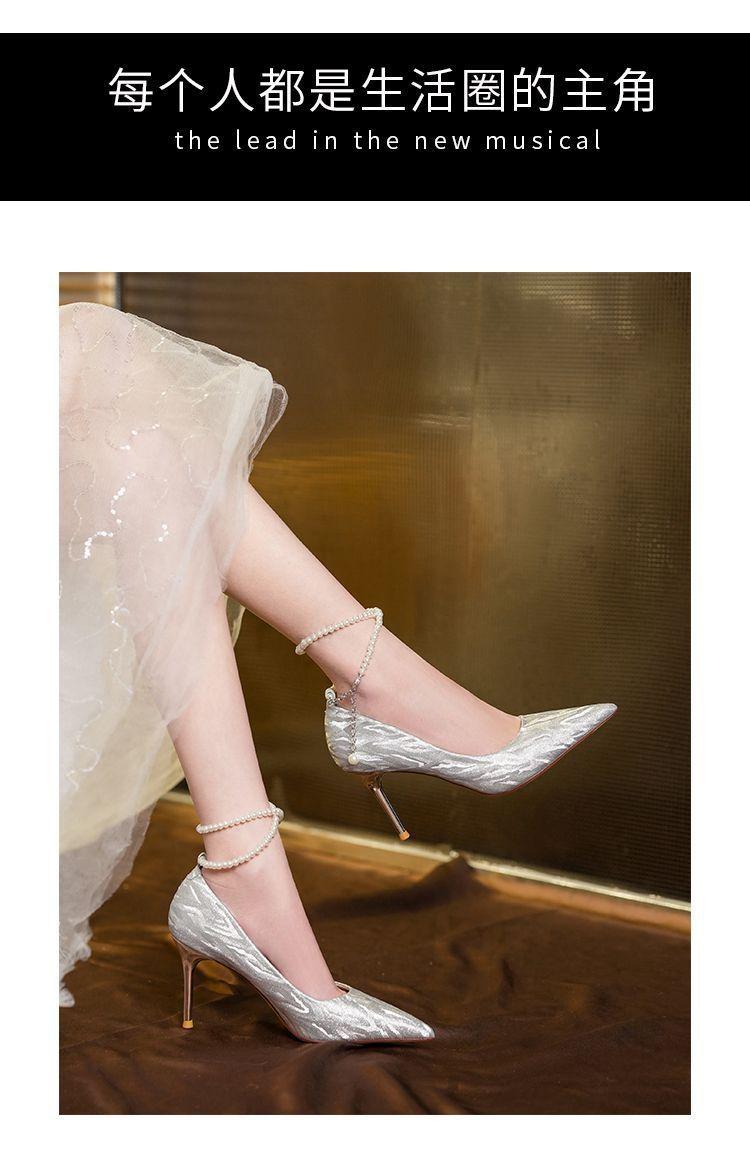 Zapatos Individuales Plateados Zapatos de Dama de Honor para Mujer 2025 Nuevo Estilo Punta Afilada Boca Baja Perla Brillante Tacones Altos para Mujer