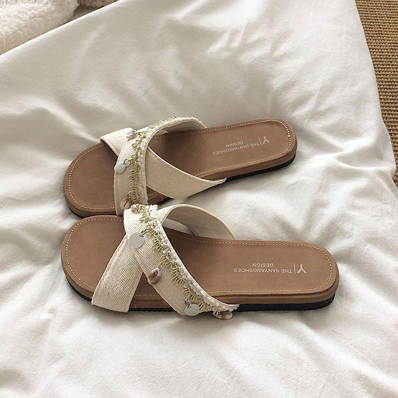 Sandalias planas de tiras cruzadas para mujer Verano para salir 2025 Nuevo estilo de vacaciones en la playa Chanclas Combinación casual Falda Zapatos