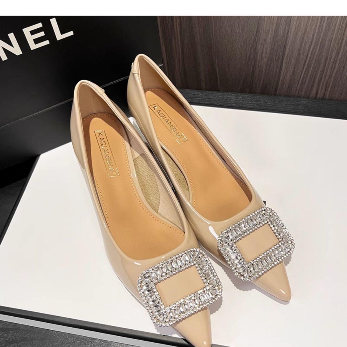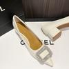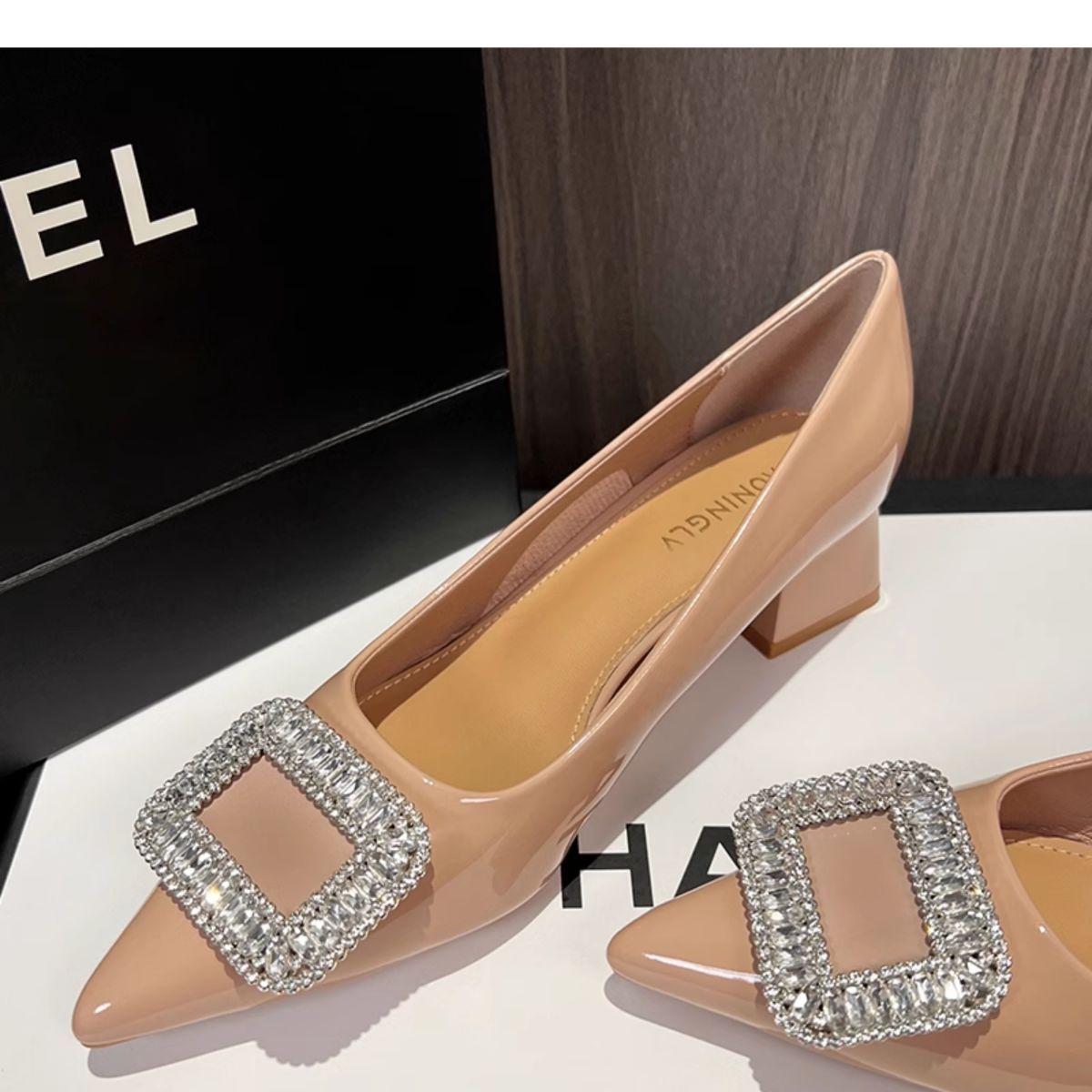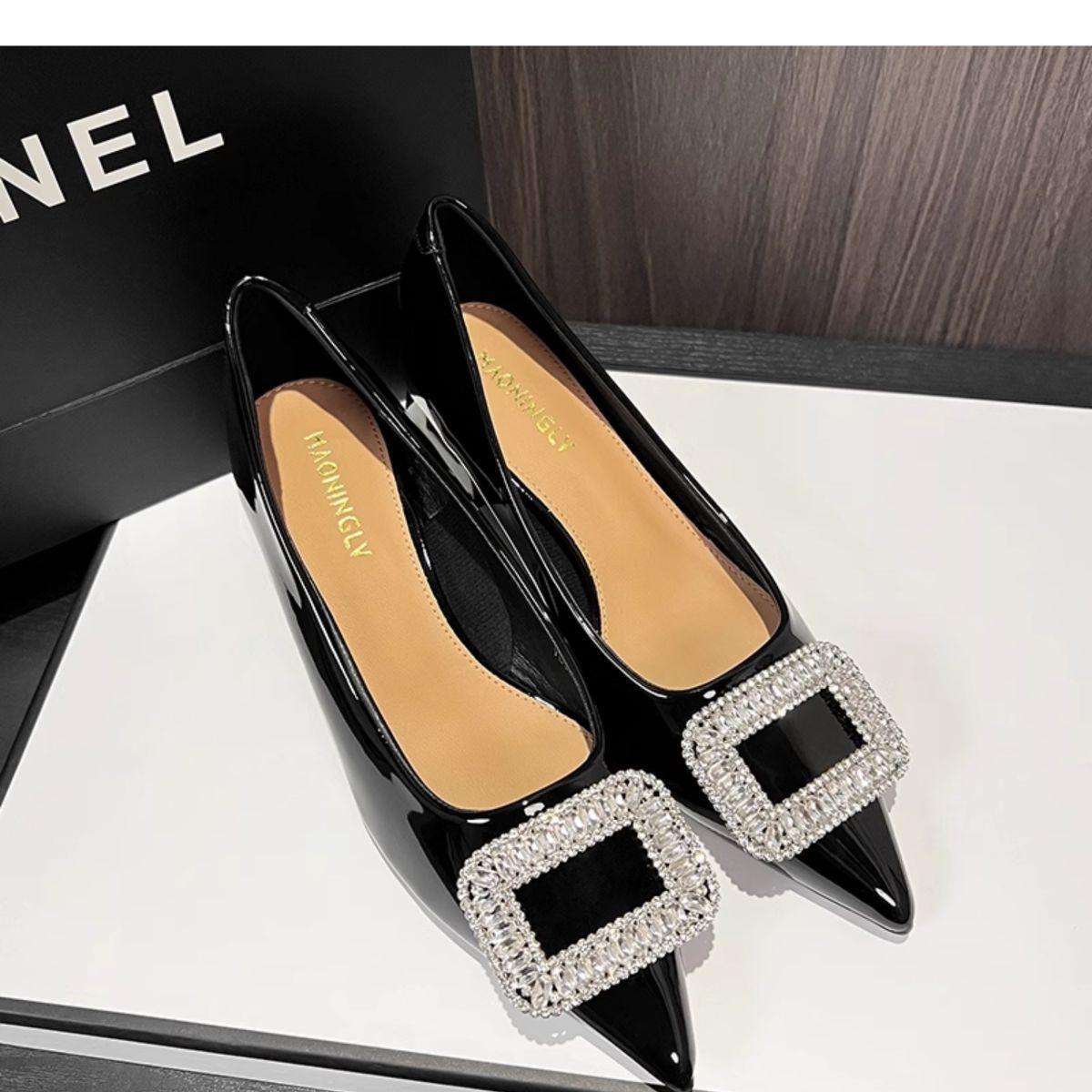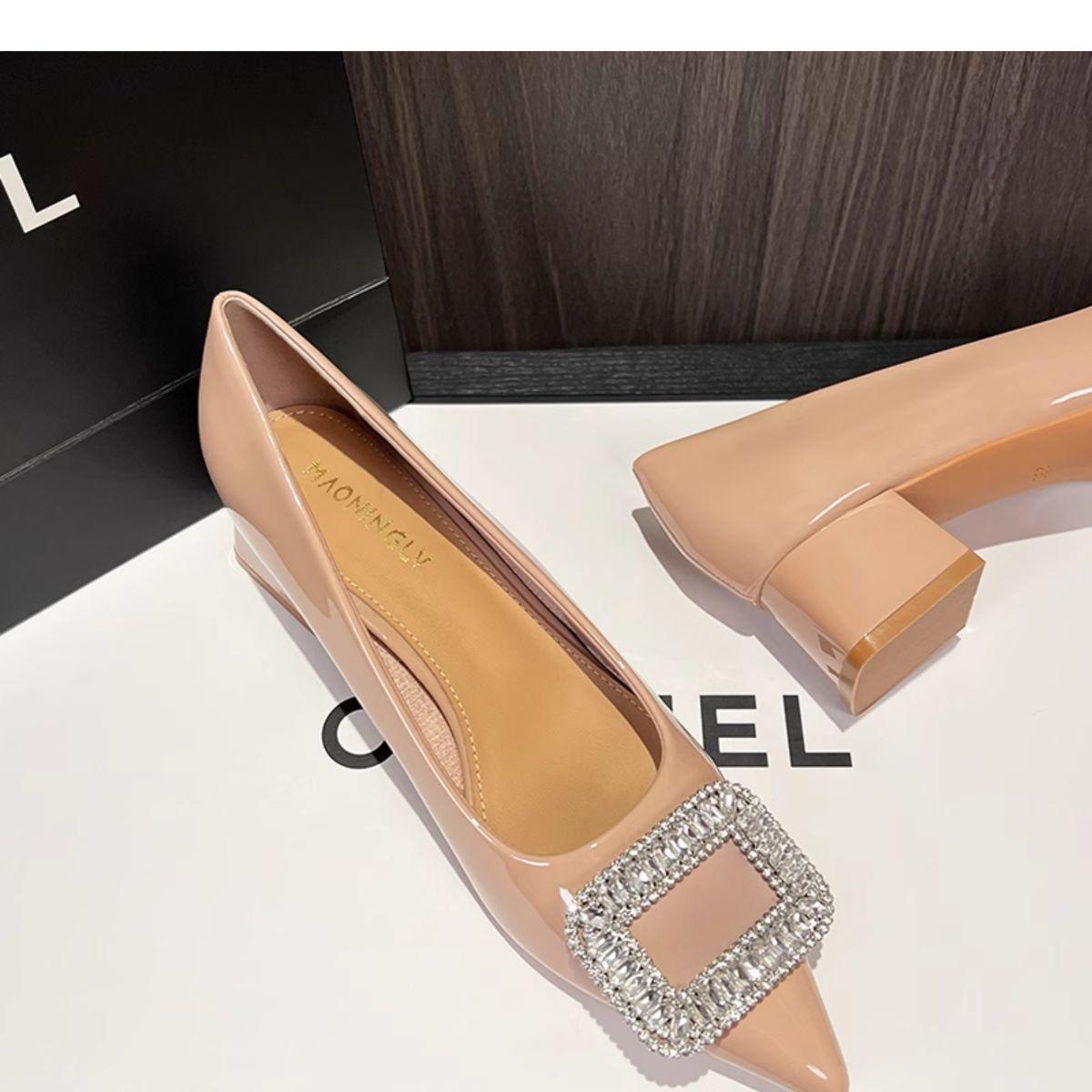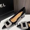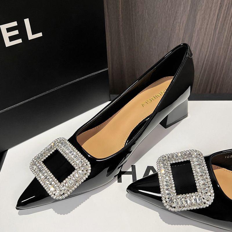 Zapatos planos negros de tacón grueso para mujer Primavera y Otoño 2025 Charol Puntera puntiaguda Hebilla cuadrada Pedrería Tacón medio Zapatos de tacón alto poco profundos