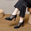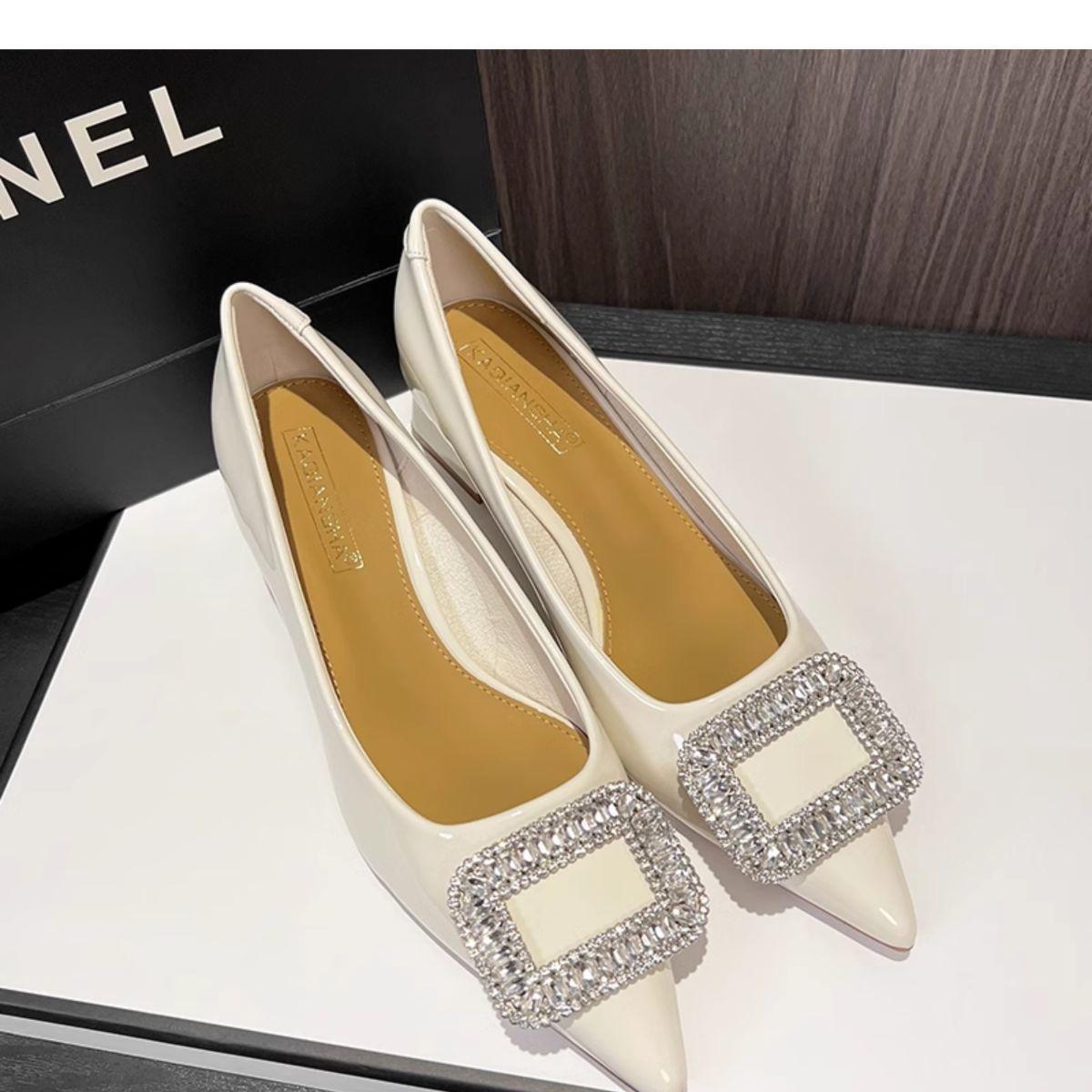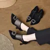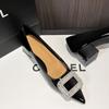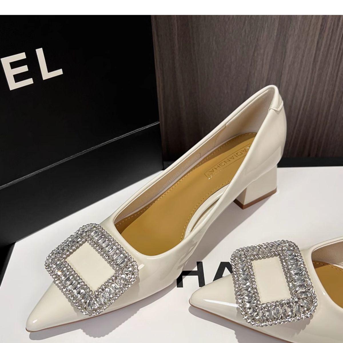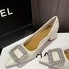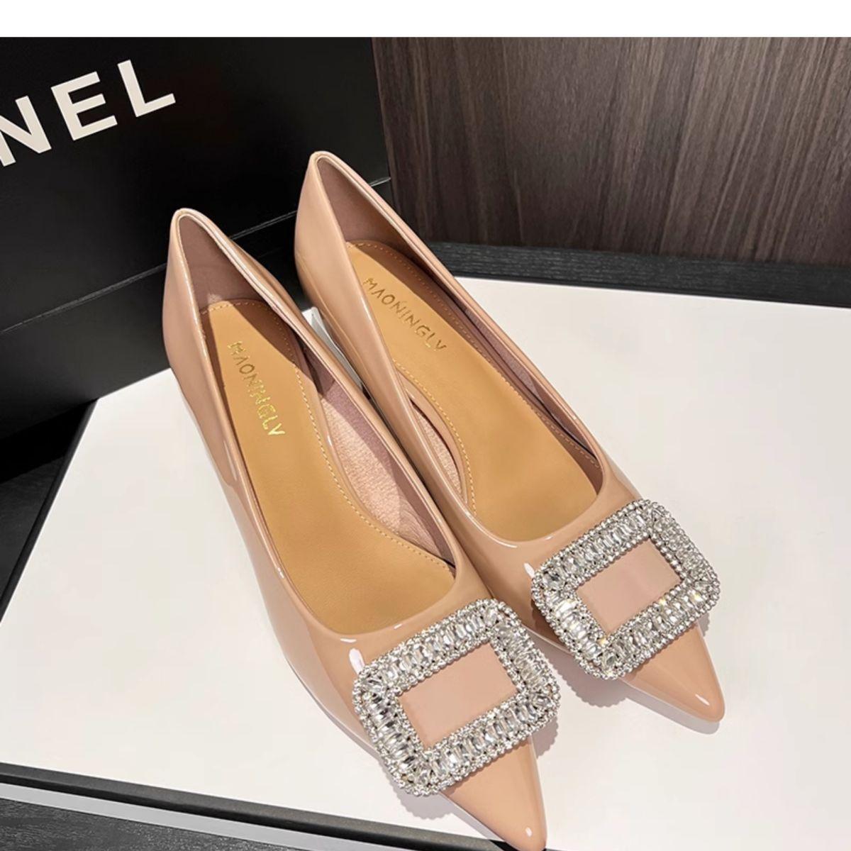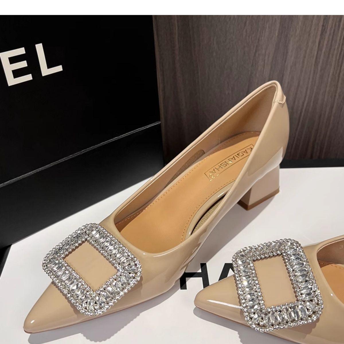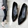 Zapatos planos negros de tacón grueso para mujer Primavera y Otoño 2025 Charol Puntera puntiaguda Hebilla cuadrada Pedrería Tacón medio Zapatos de tacón alto poco profundos