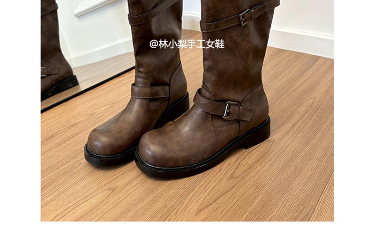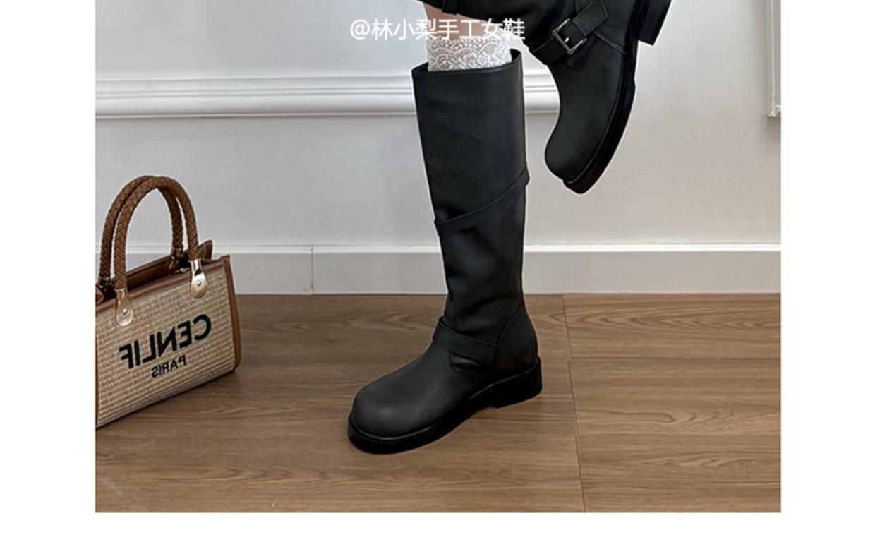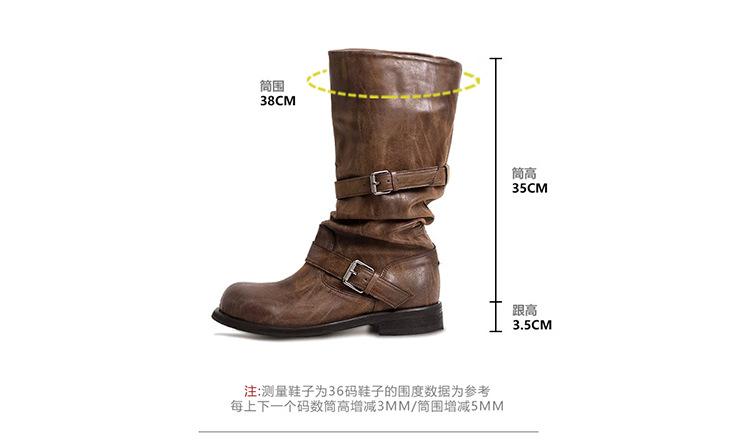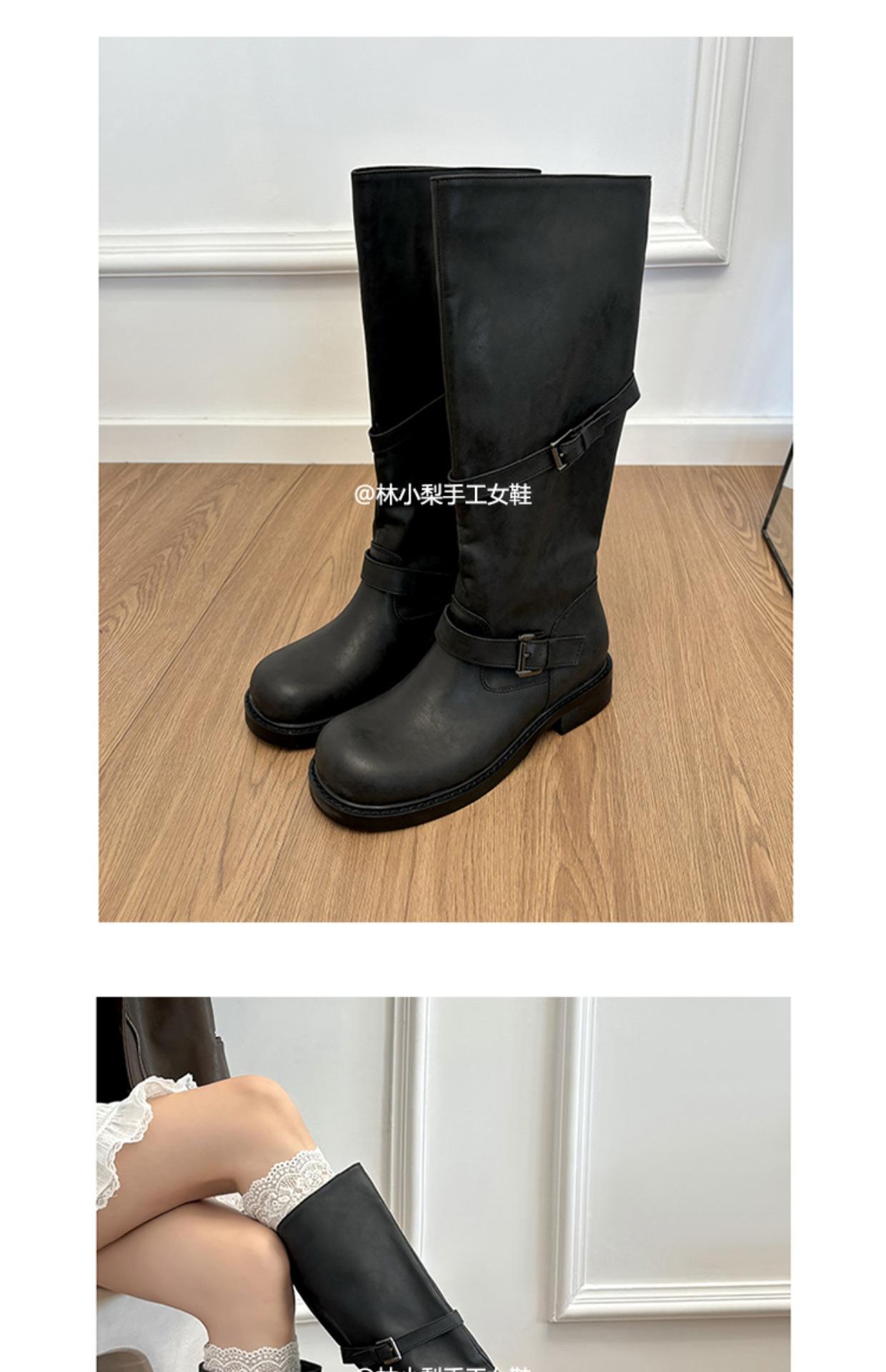 Versión de piel de vaca~Botas de cuero genuino suela gruesa punta redonda hebilla retro botas hasta la rodilla mujer otoño invierno botas de media caña botas de montar