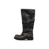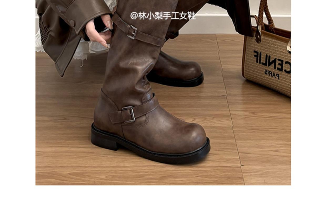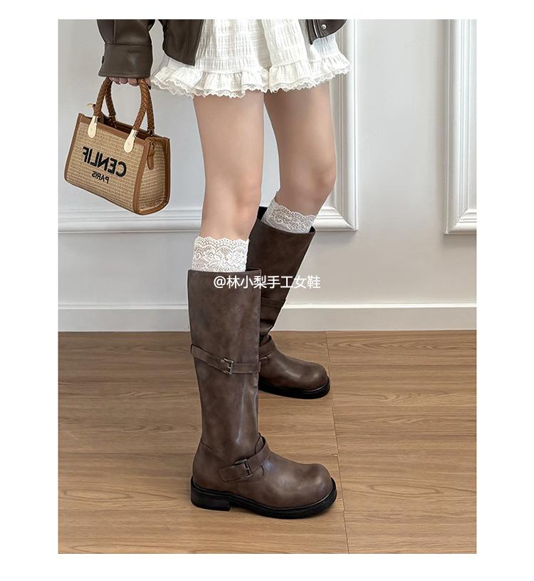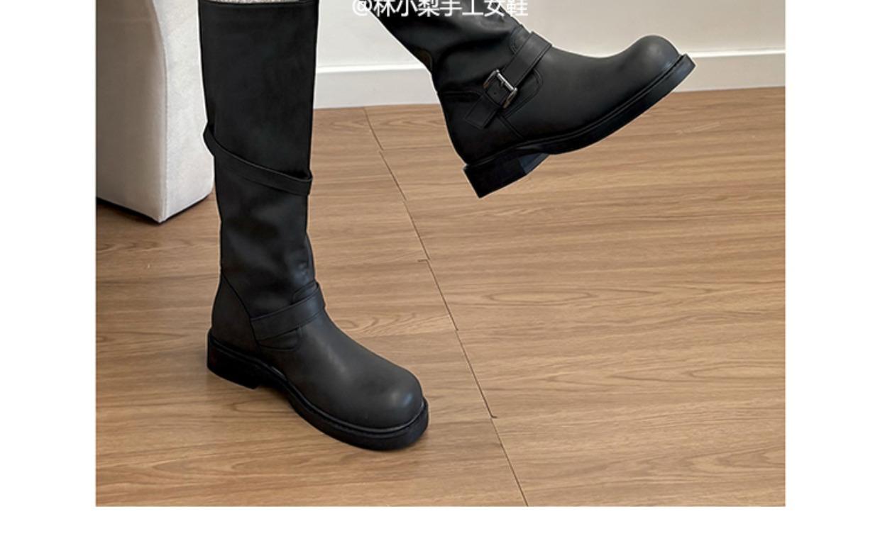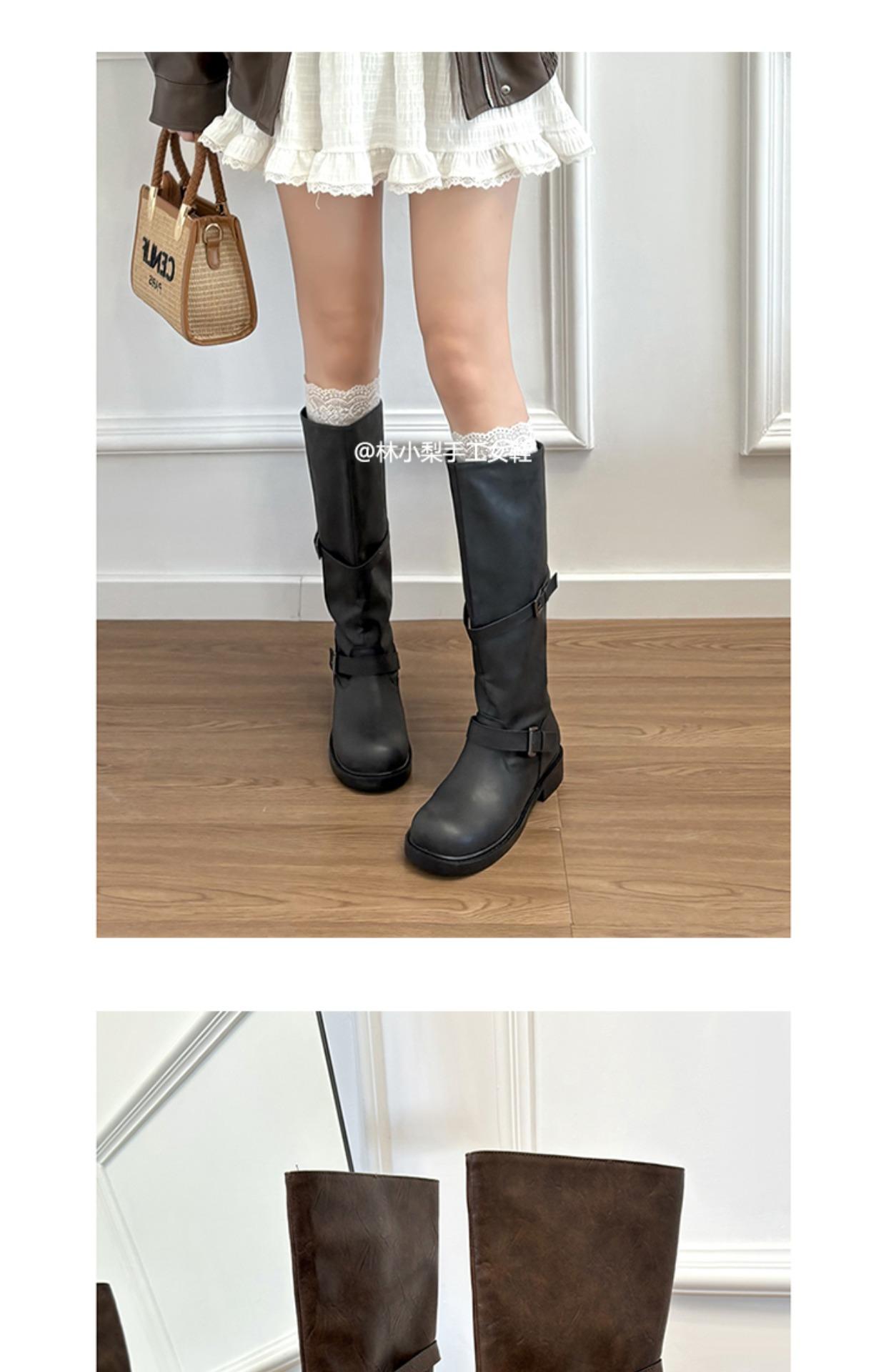 Versión de piel de vaca~Botas de cuero genuino suela gruesa punta redonda hebilla retro botas hasta la rodilla mujer otoño invierno botas de media caña botas de montar
