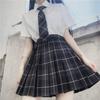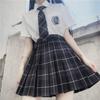White shirt short sleeves + smoky gray plaid skirt + tie
