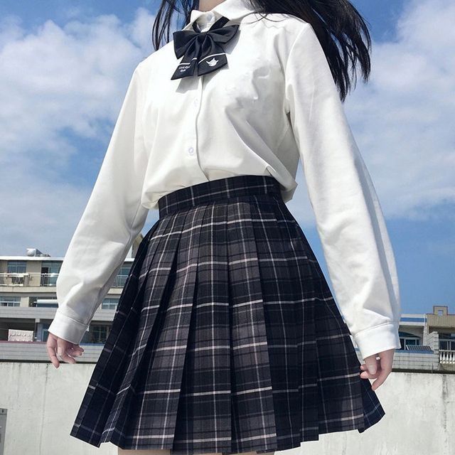 White shirt with long sleeves + smoky gray plaid skirt + tie