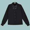 Black shirt with long sleeves + smoky gray plaid skirt + bow tie