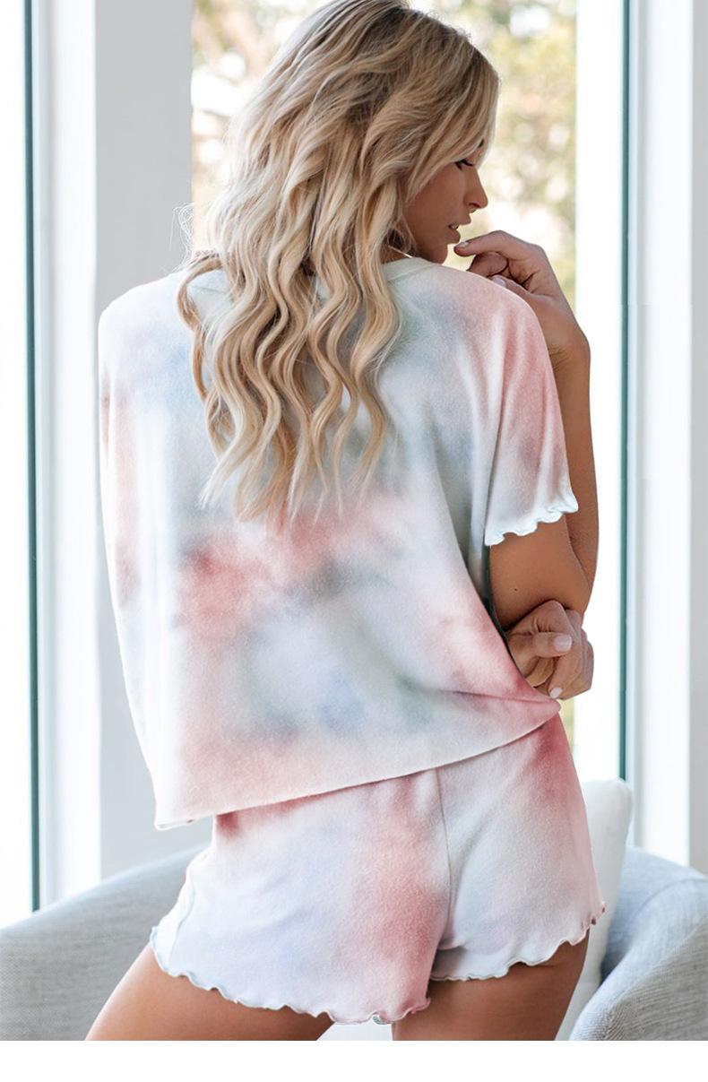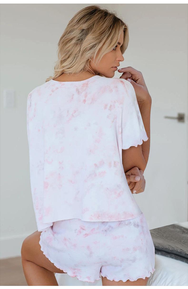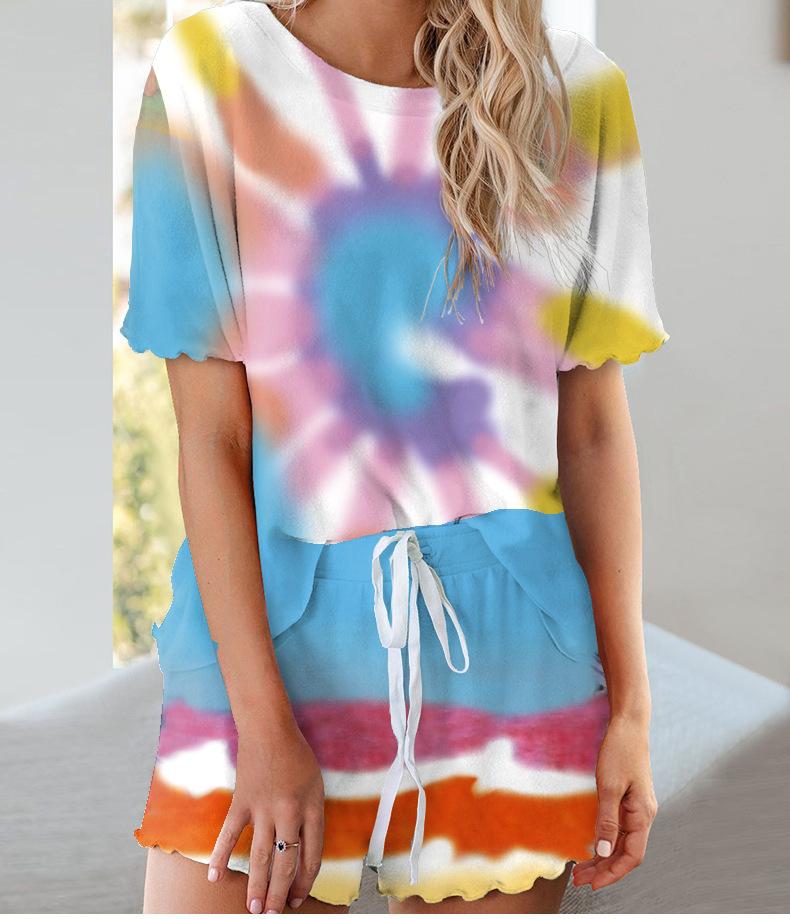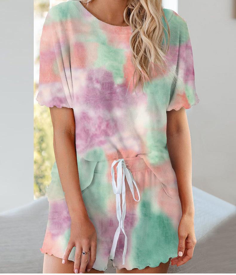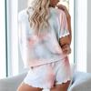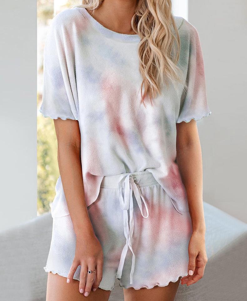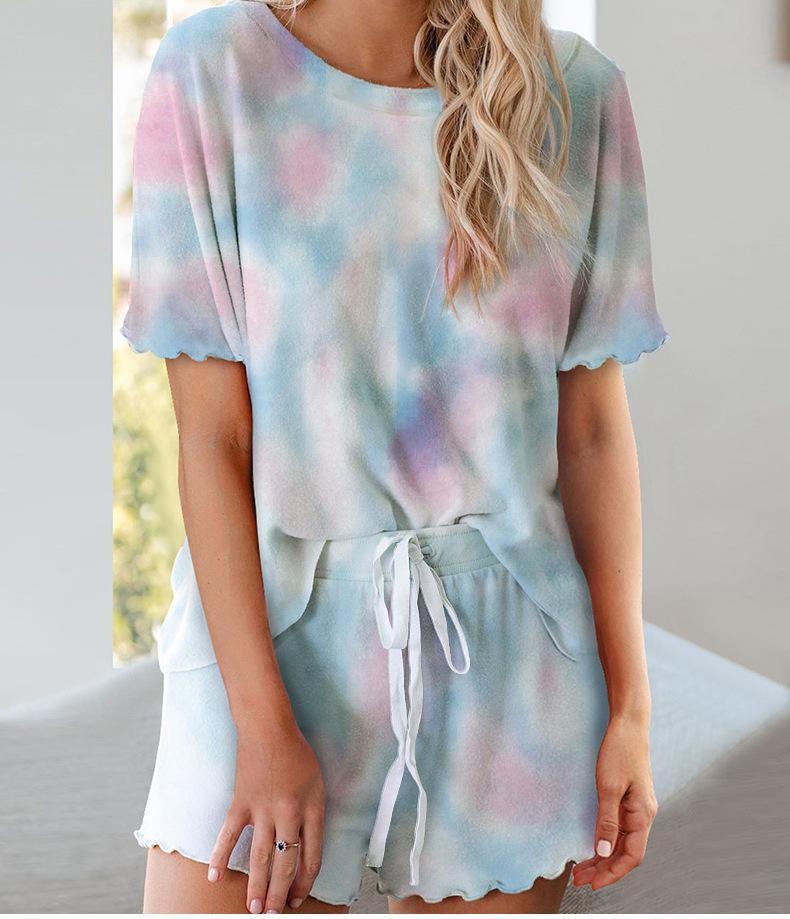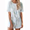 Comercio exterior Amazon Pijama de manga corta teñido anudado europeo y americano para mujer nuevo tejido de punto cuello redondo jersey traje de ropa de casa para mujer