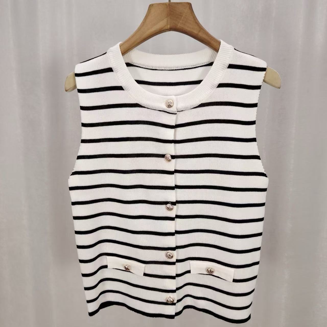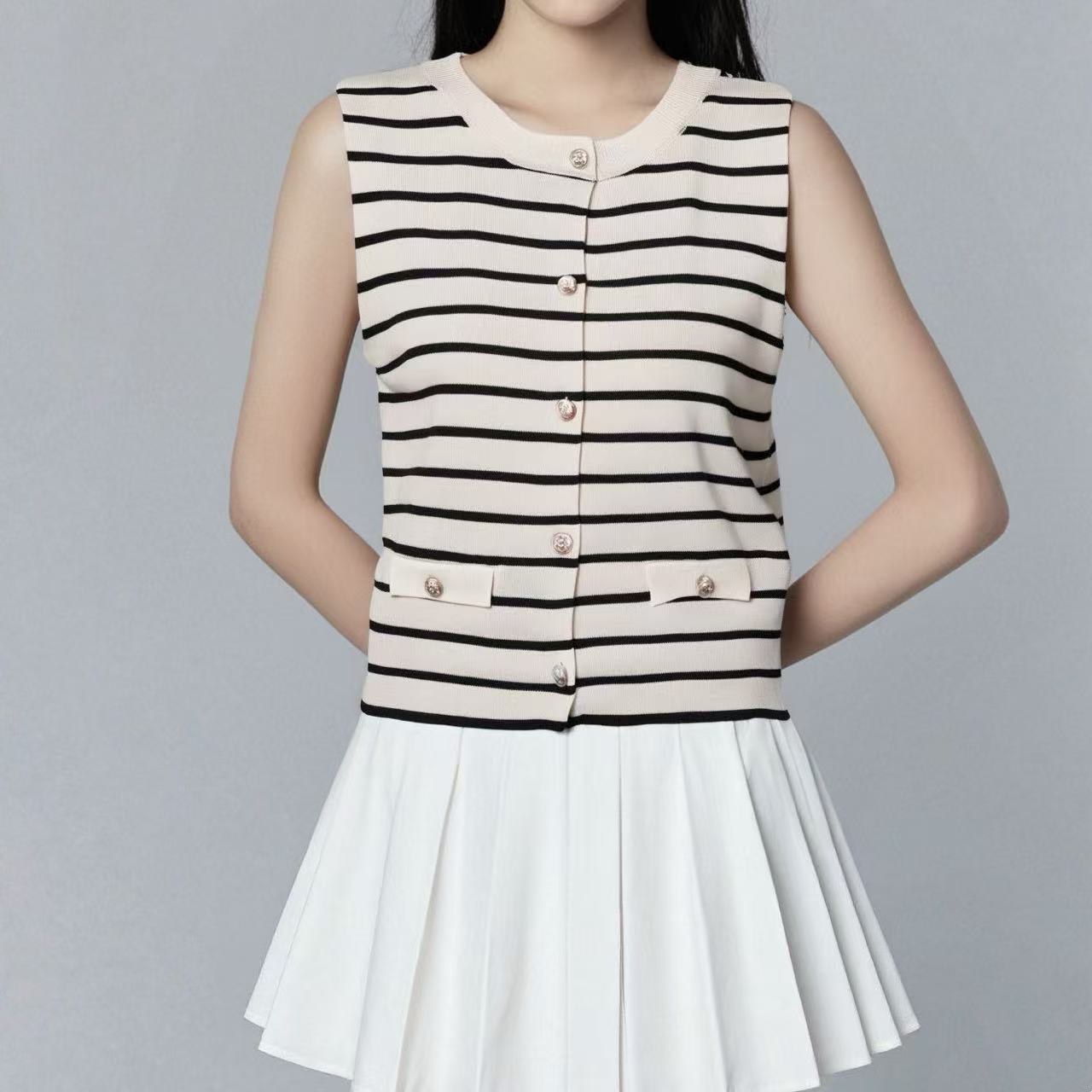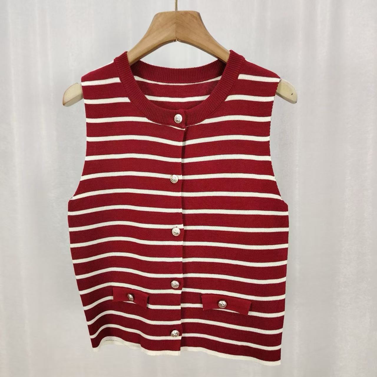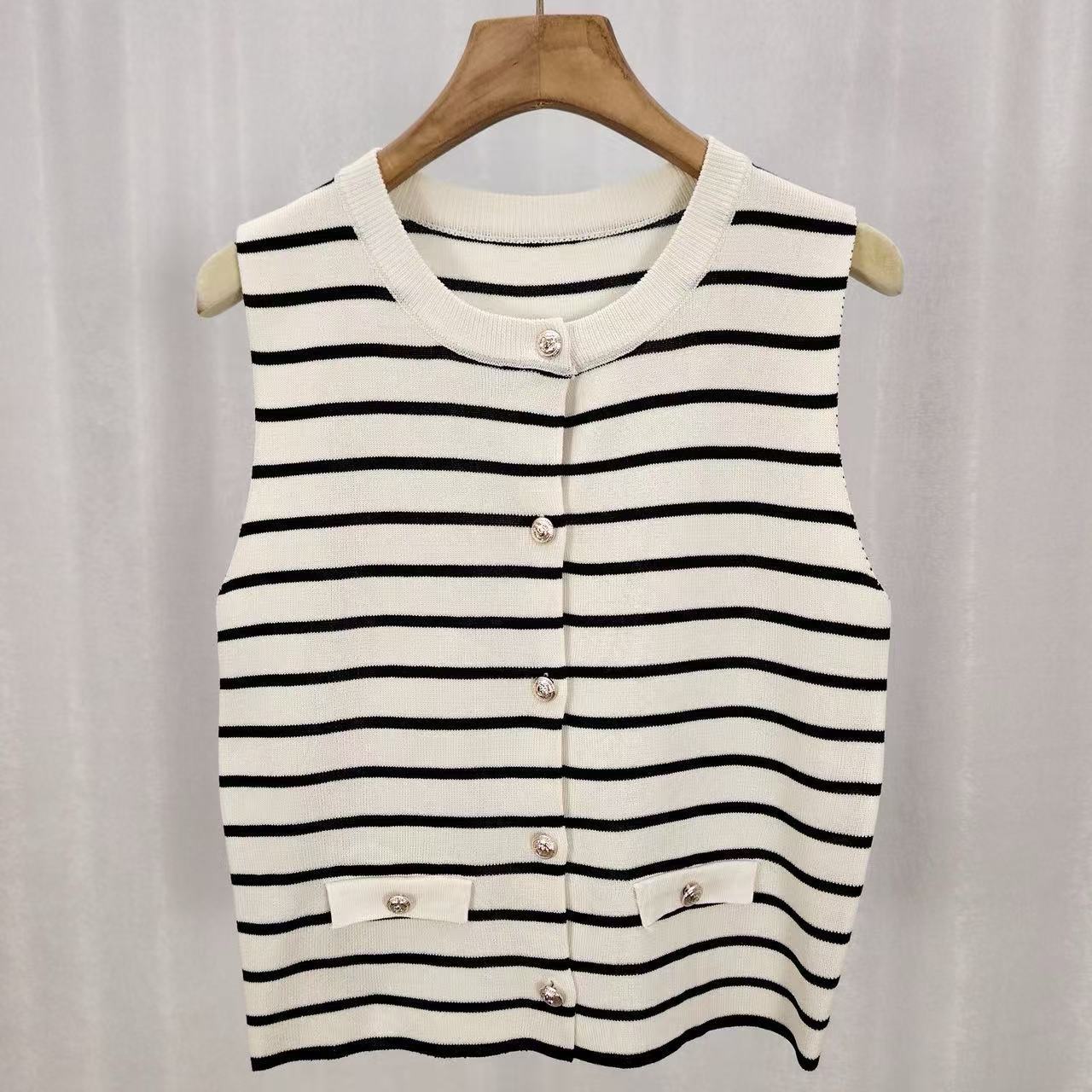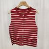 Nuevo Otoño e Invierno Color Sólido Rayado Cuello Redondo Sin Mangas Chaleco de Punto para Mujer Suelto Simple Base Casual Versátil Top