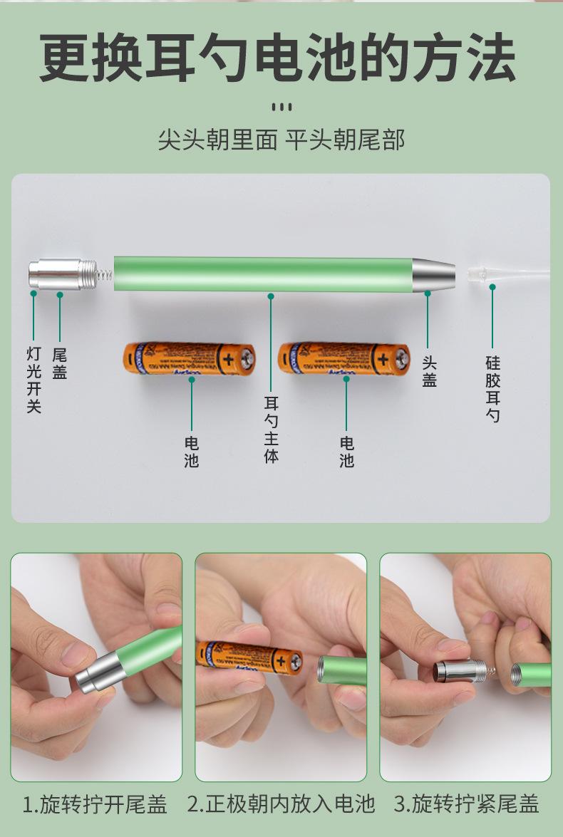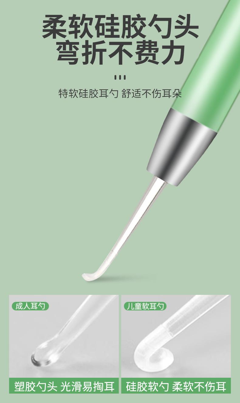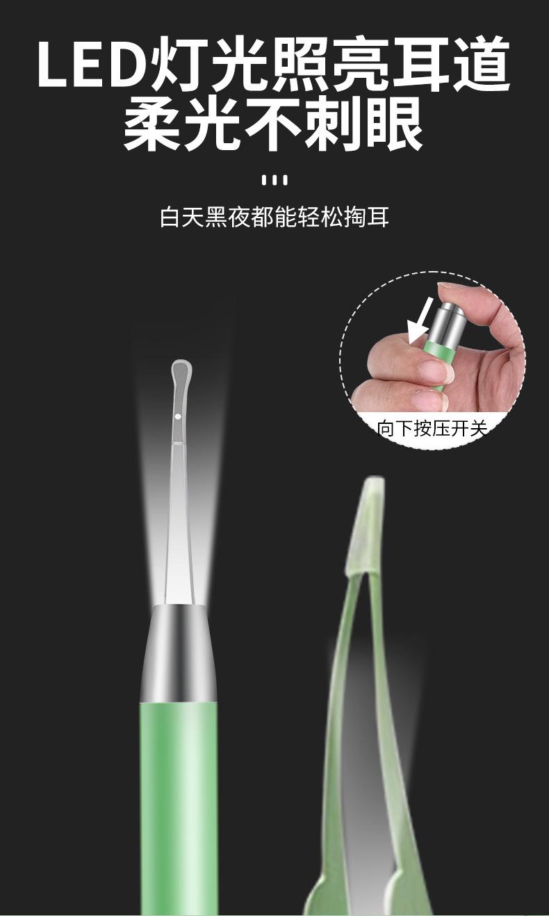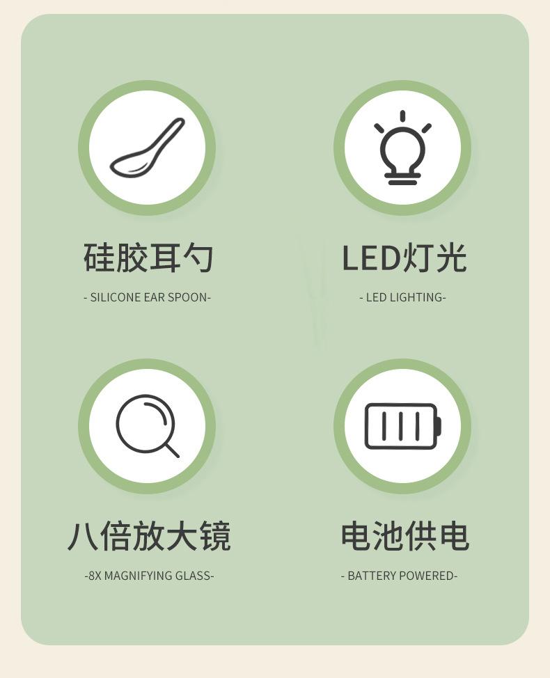 Green ear spoon + 4 ear spoon heads + battery + magnifying glass + plastic box