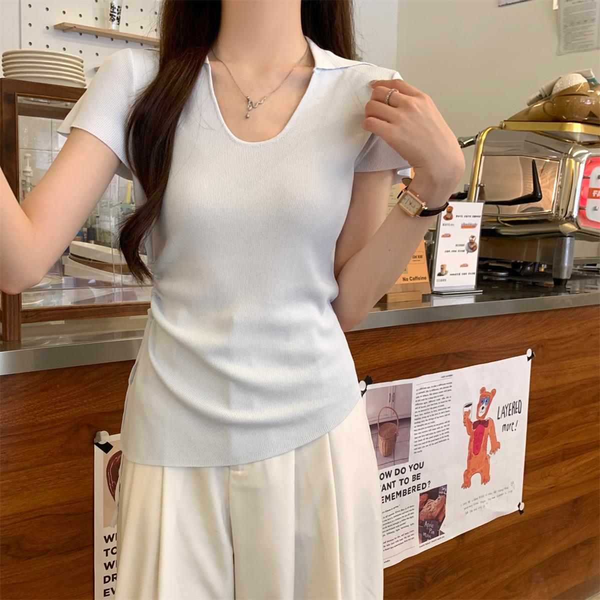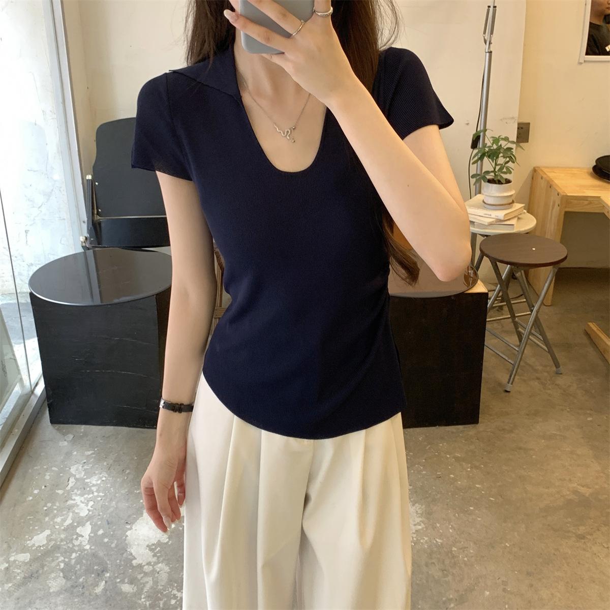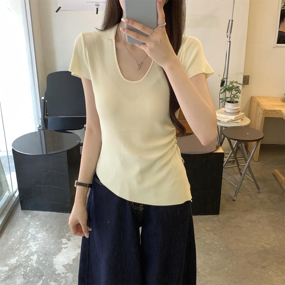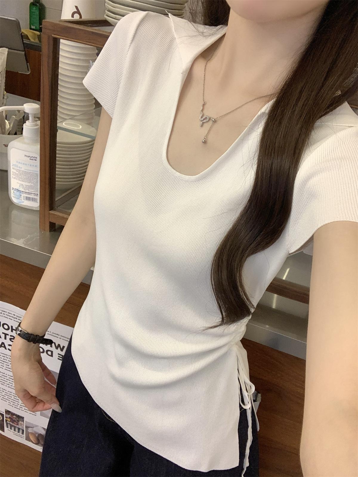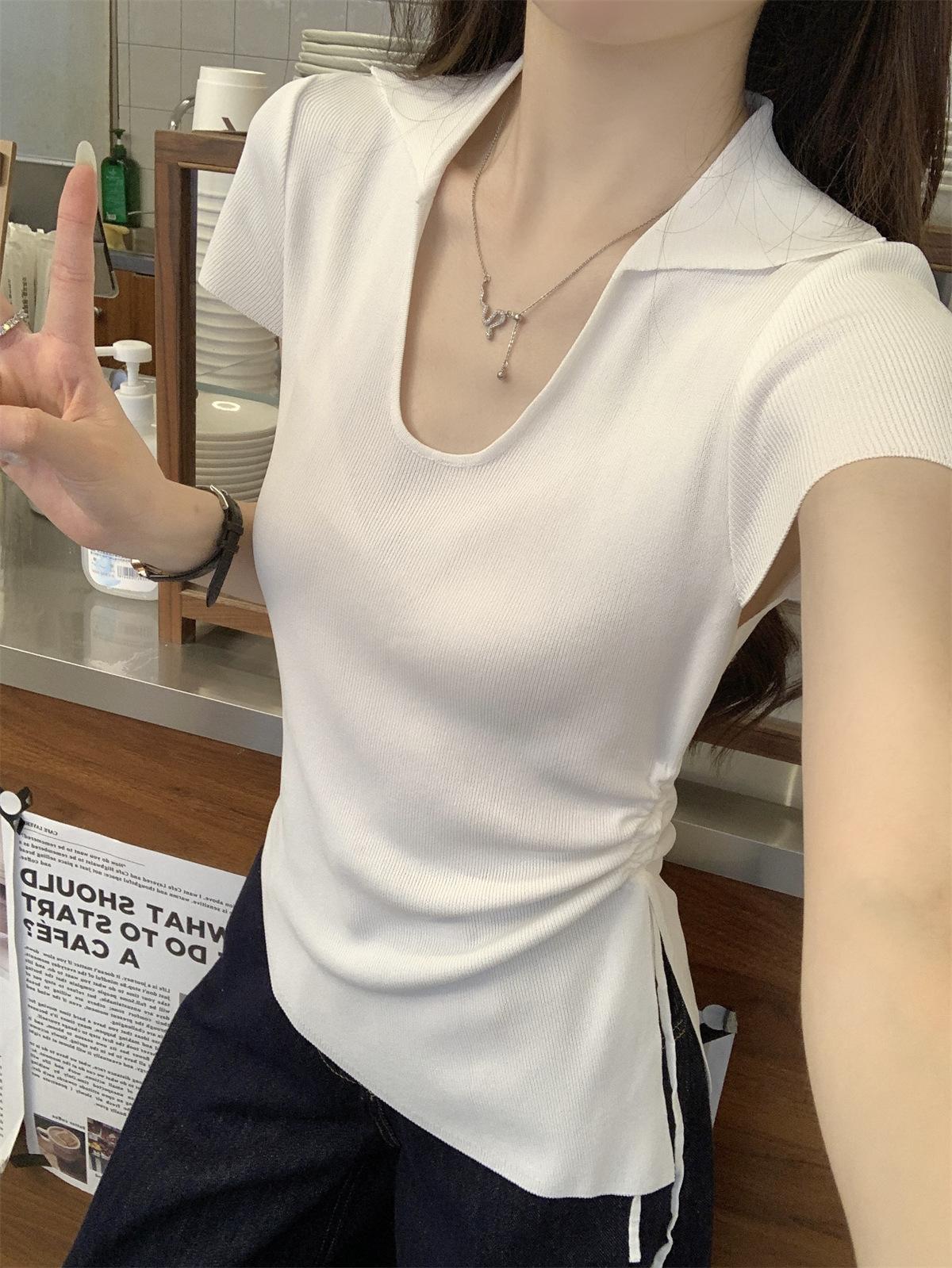 Verano Francés 2025 Estilo Coreano Elegante Cuello Polo Diseño de Abertura con Cordón Aspecto Adelgazante Punto Top de Manga Corta para Mujer