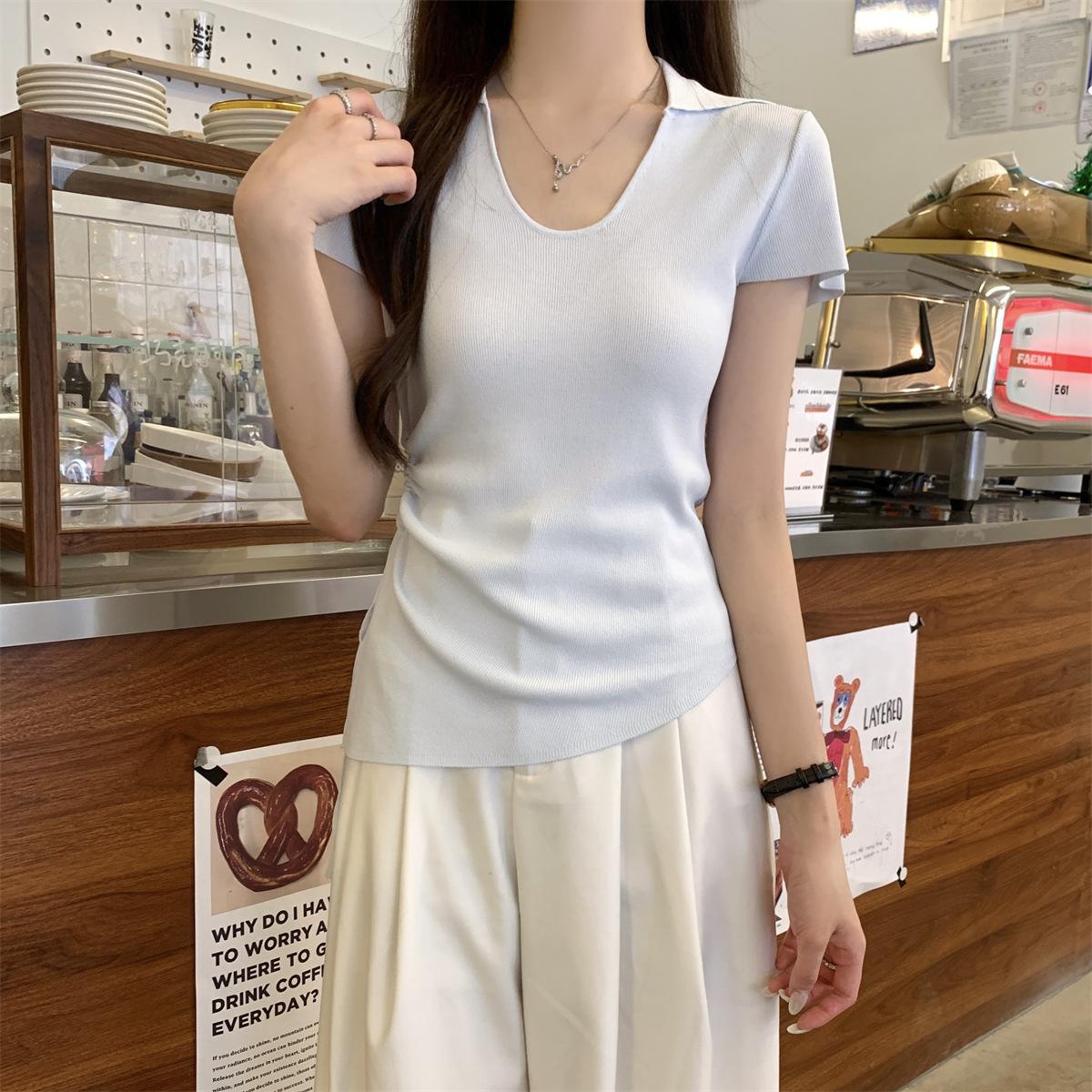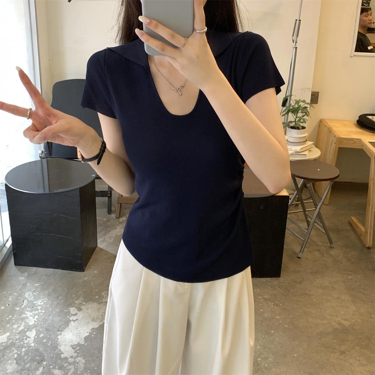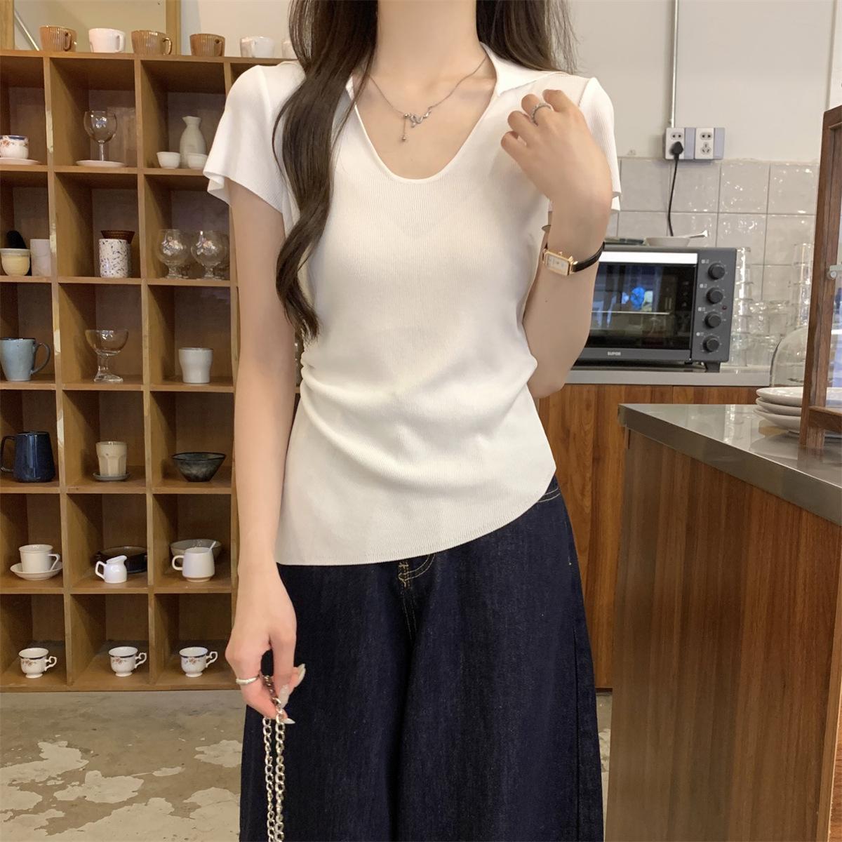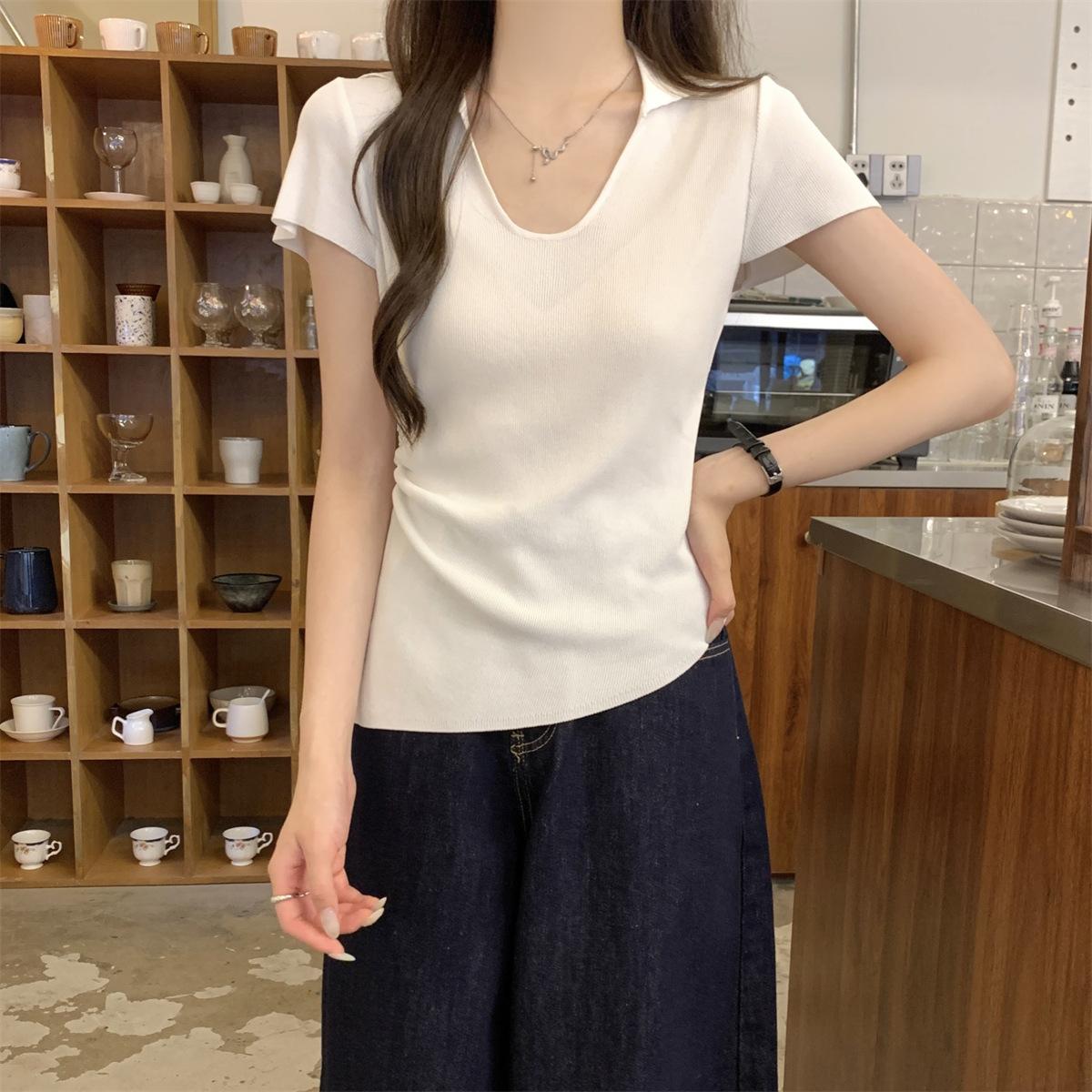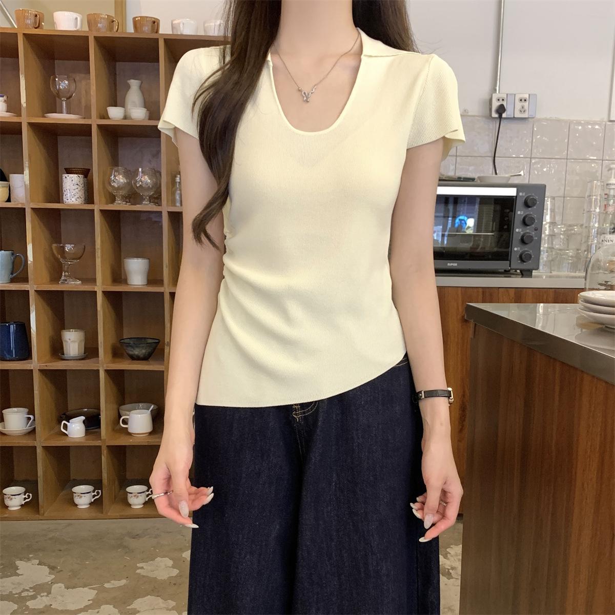 Verano Francés 2025 Estilo Coreano Elegante Cuello Polo Diseño de Abertura con Cordón Aspecto Adelgazante Punto Top de Manga Corta para Mujer