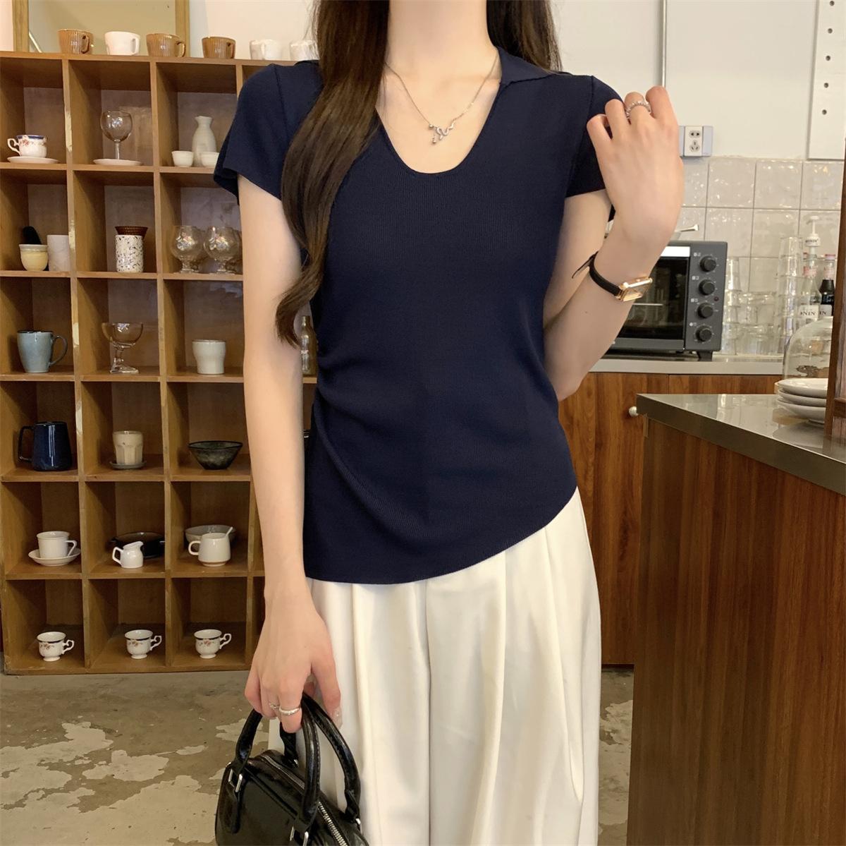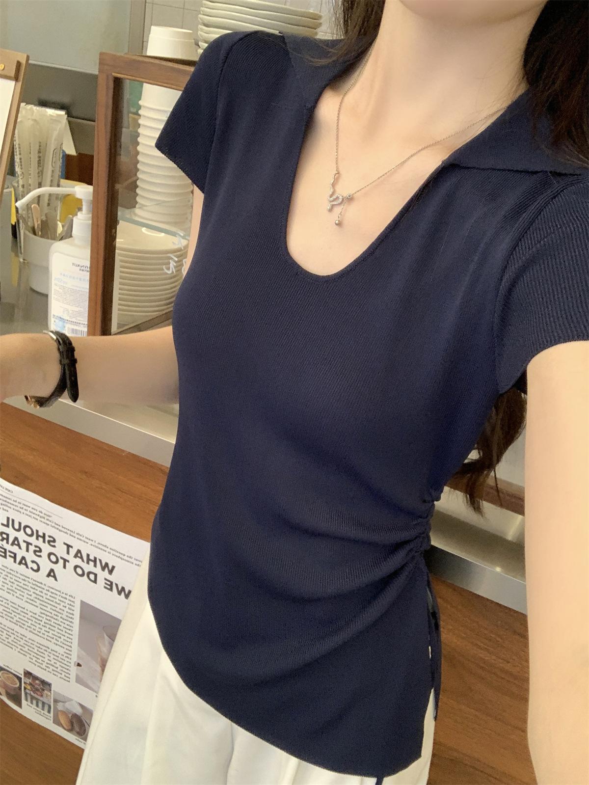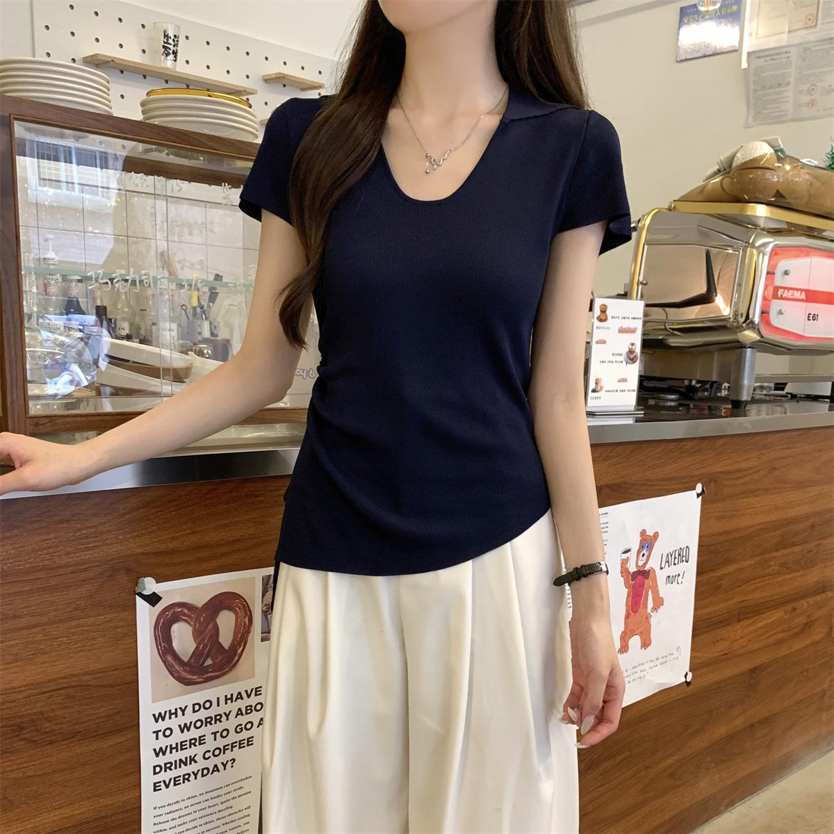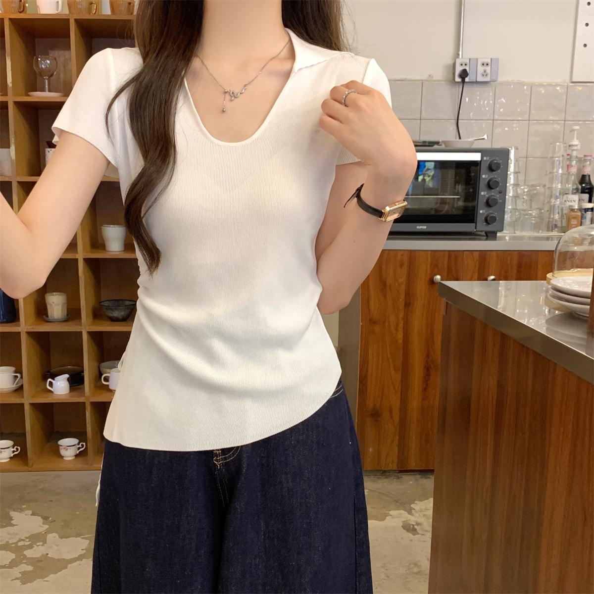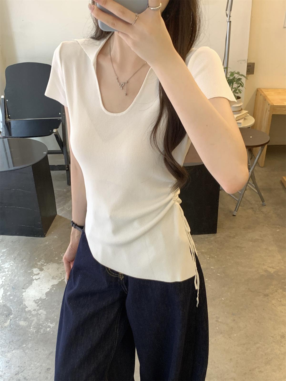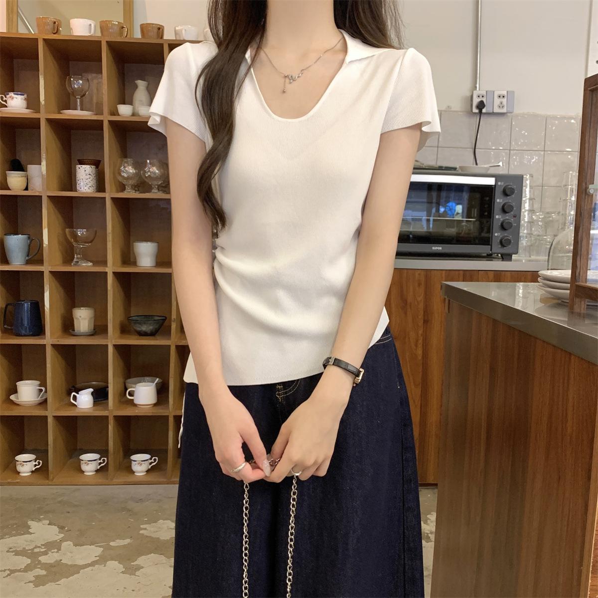 Verano Francés 2025 Estilo Coreano Elegante Cuello Polo Diseño de Abertura con Cordón Aspecto Adelgazante Punto Top de Manga Corta para Mujer