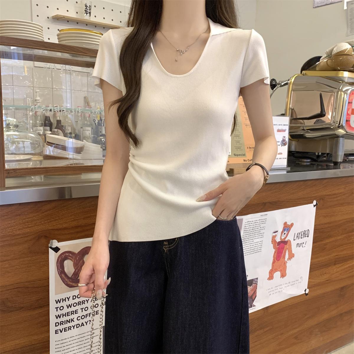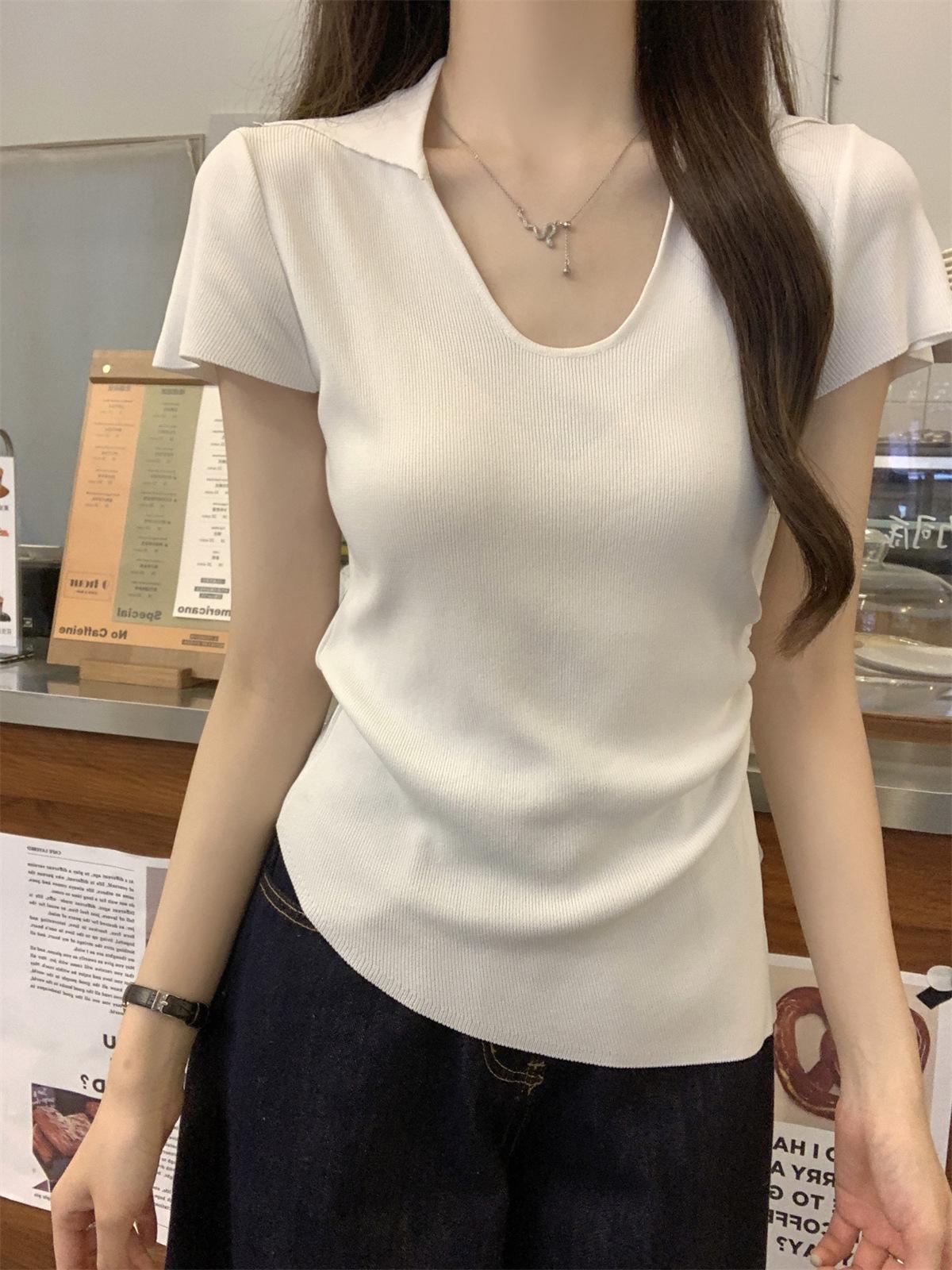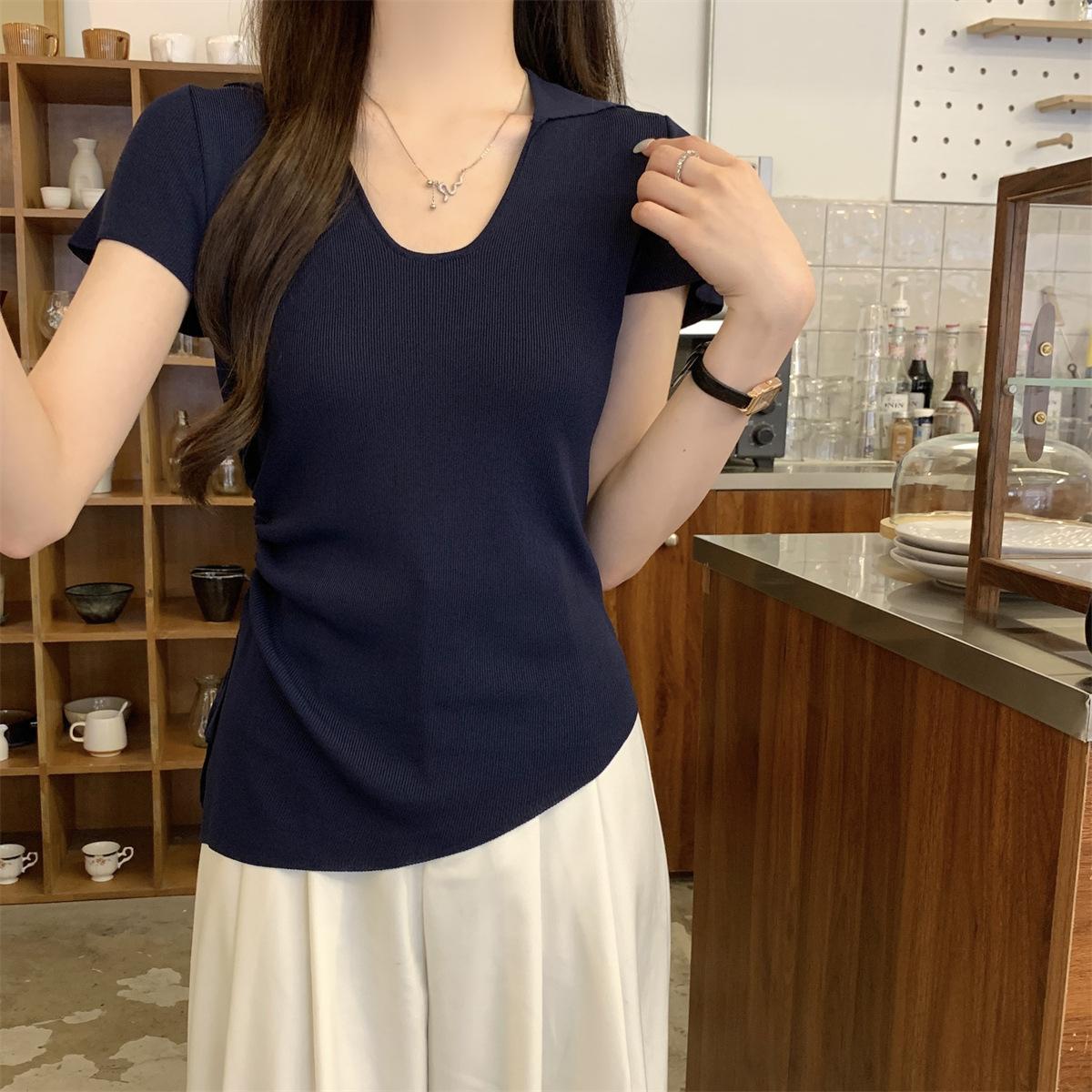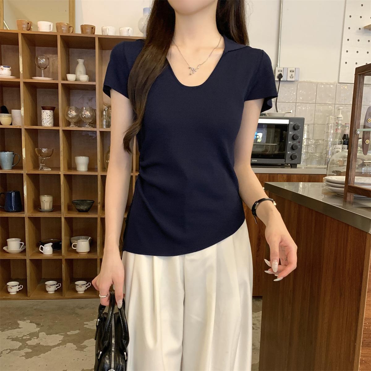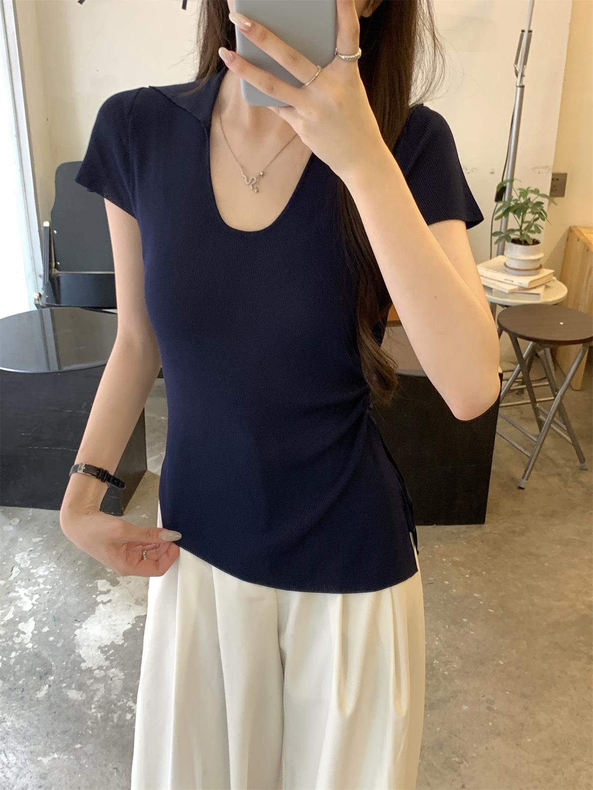 Verano Francés 2025 Estilo Coreano Elegante Cuello Polo Diseño de Abertura con Cordón Aspecto Adelgazante Punto Top de Manga Corta para Mujer