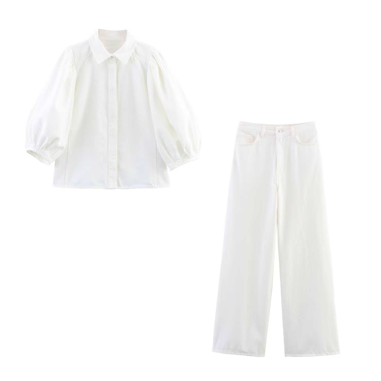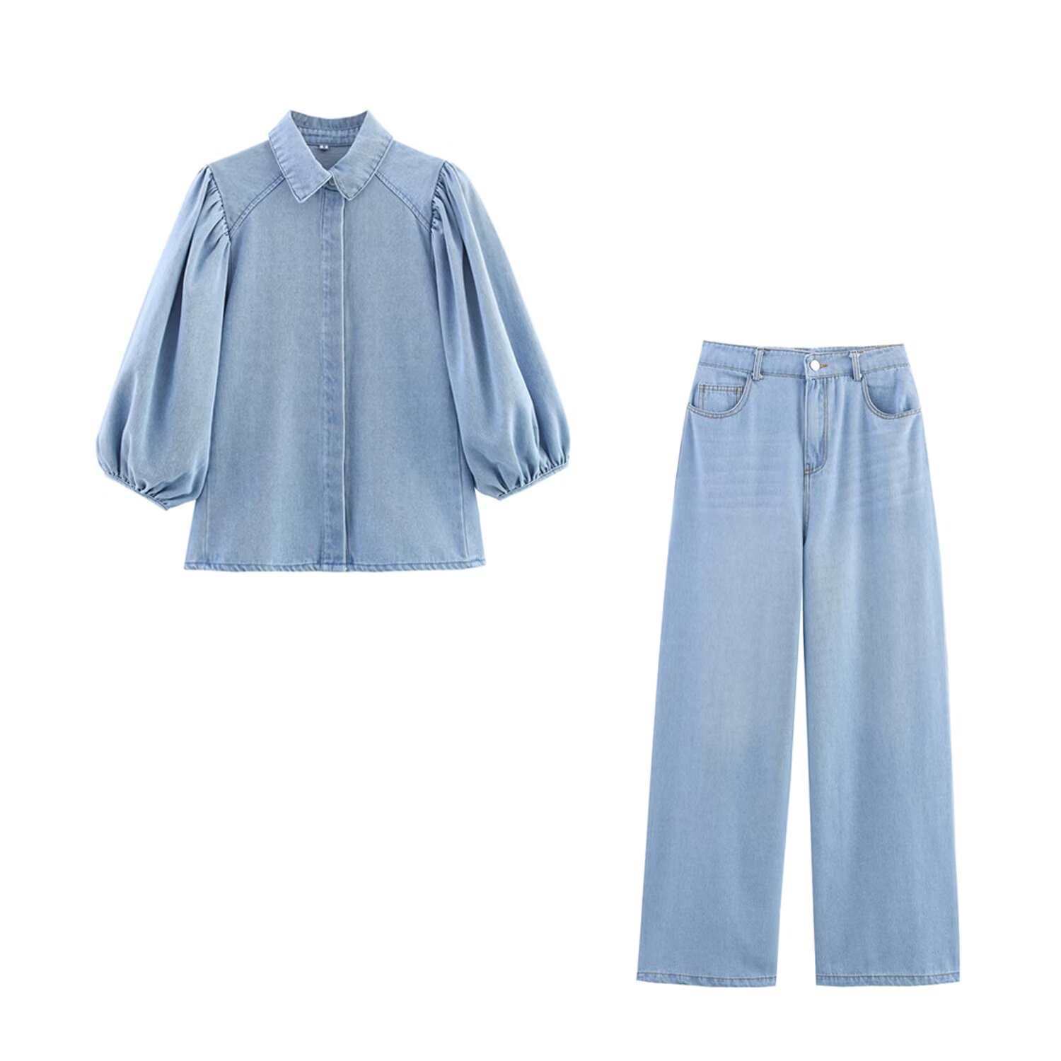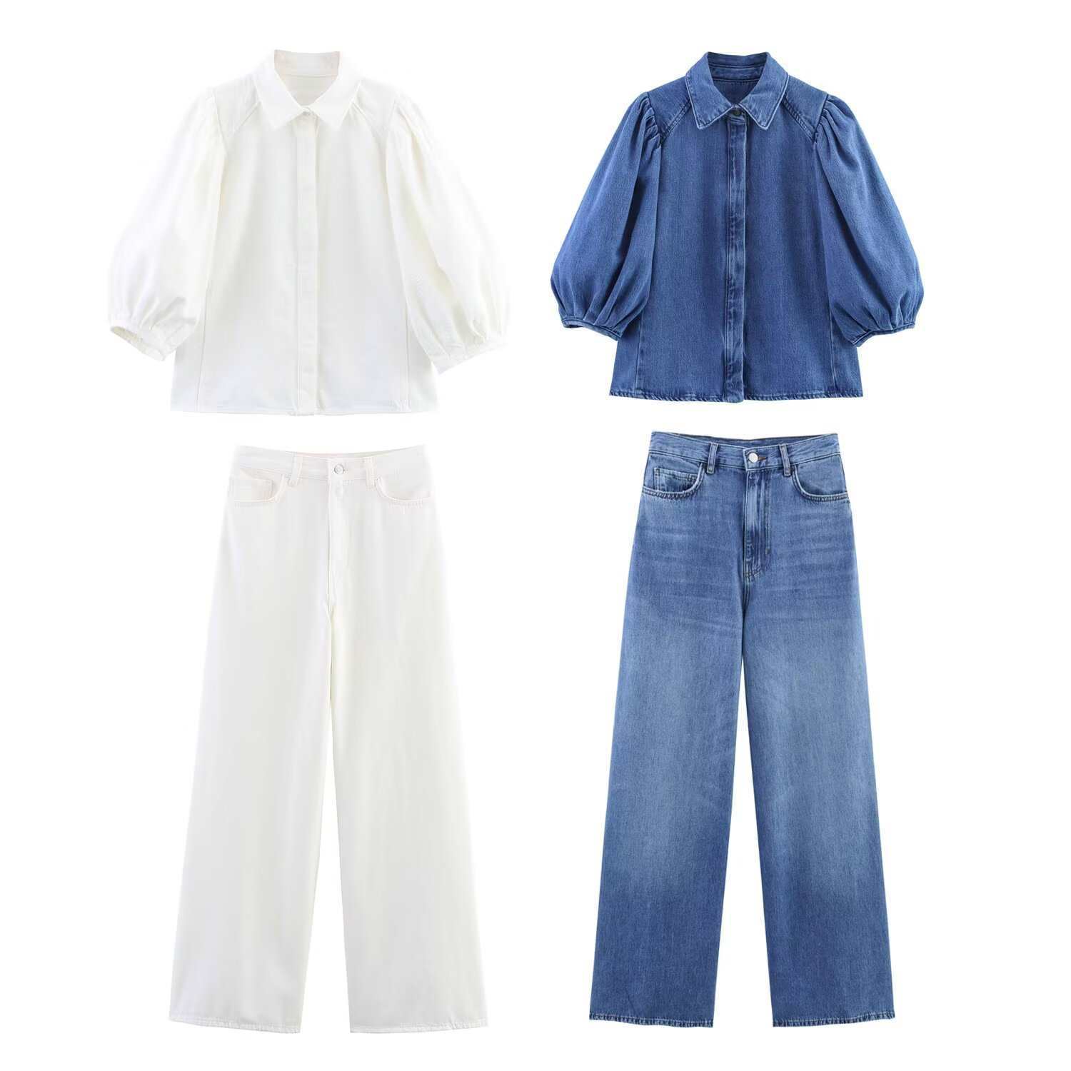 Denim blue top, Denim blue pants, White top, White pants, Light blue top, Light blue pants