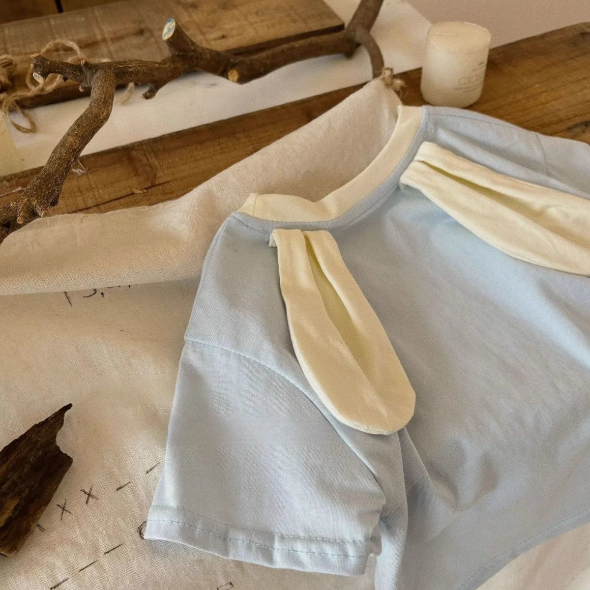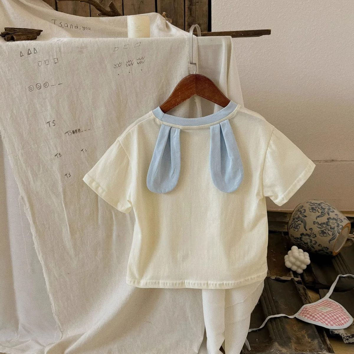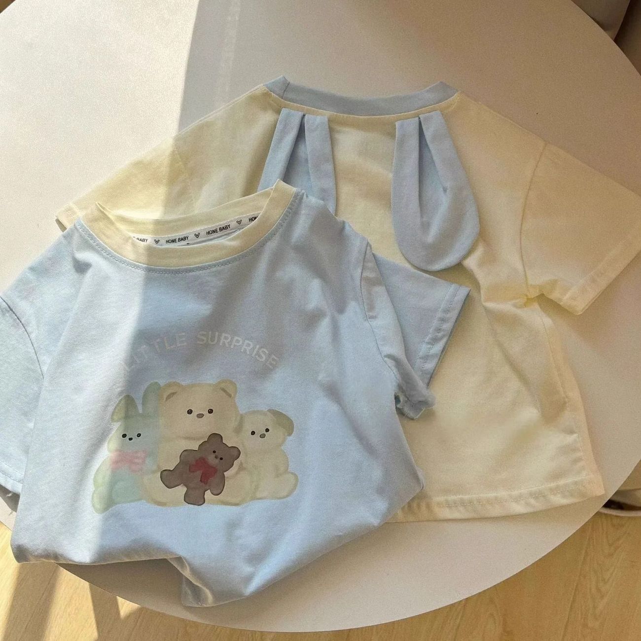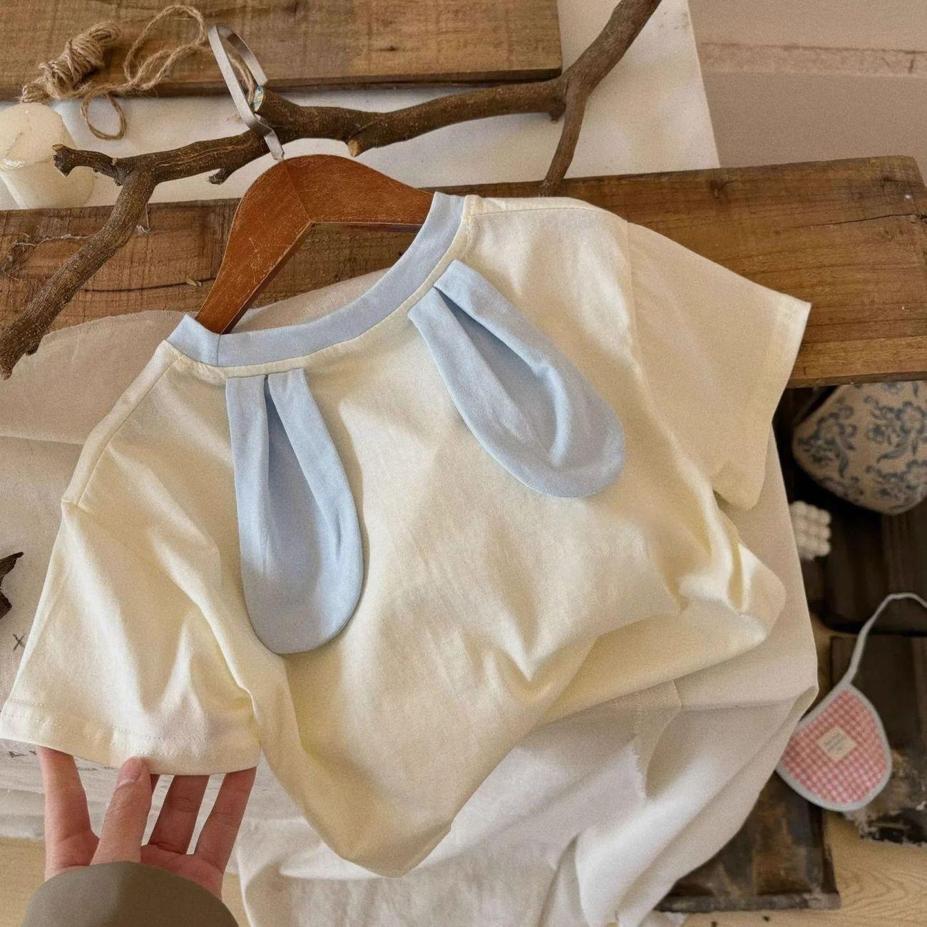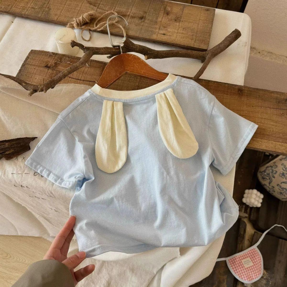 Camiseta de Verano Coreana para Niñas, Nueva Moda Estéreo Orejas de Conejo Estampado de Dibujos Animados Cuello Redondo Manga Corta