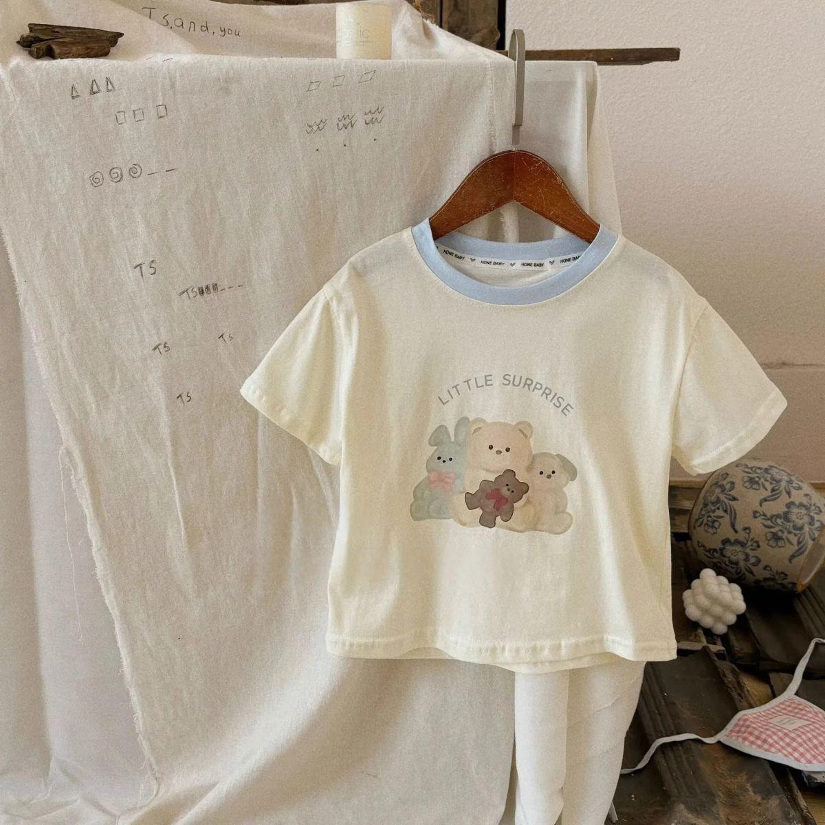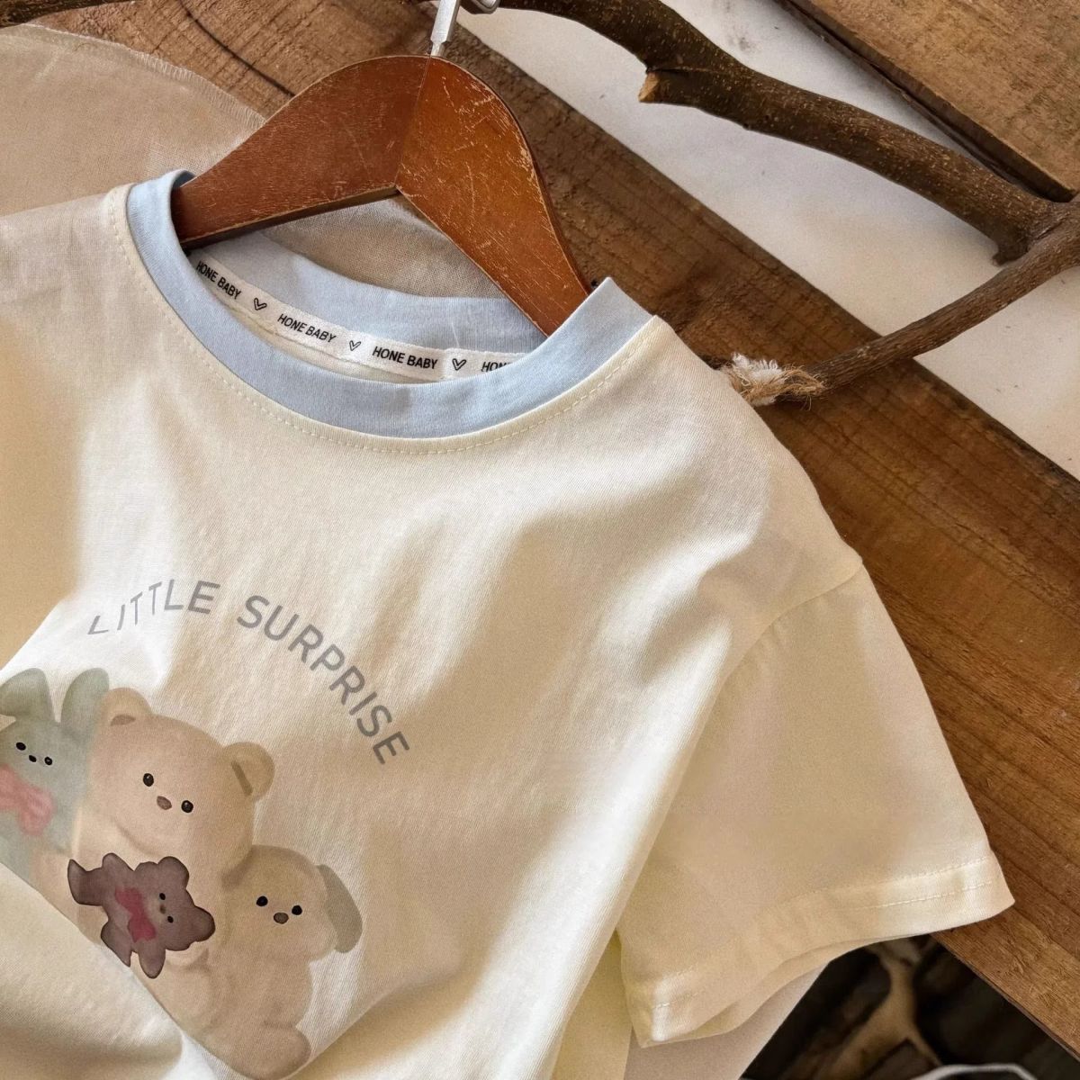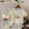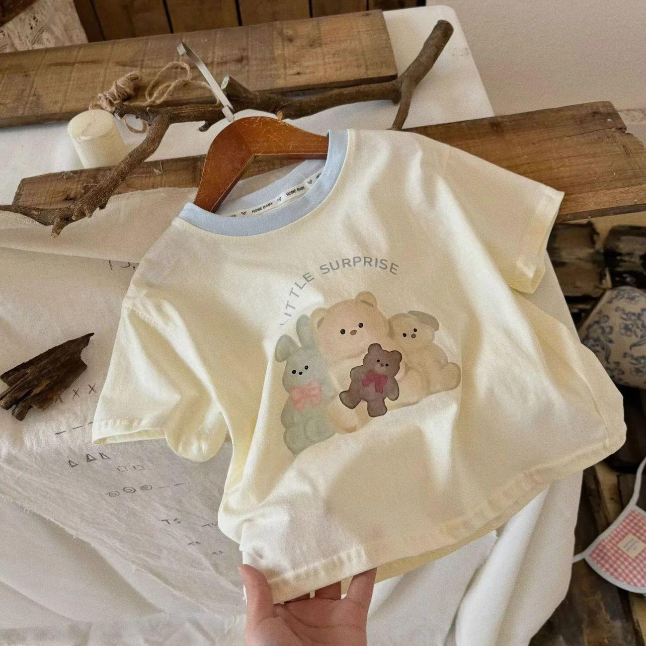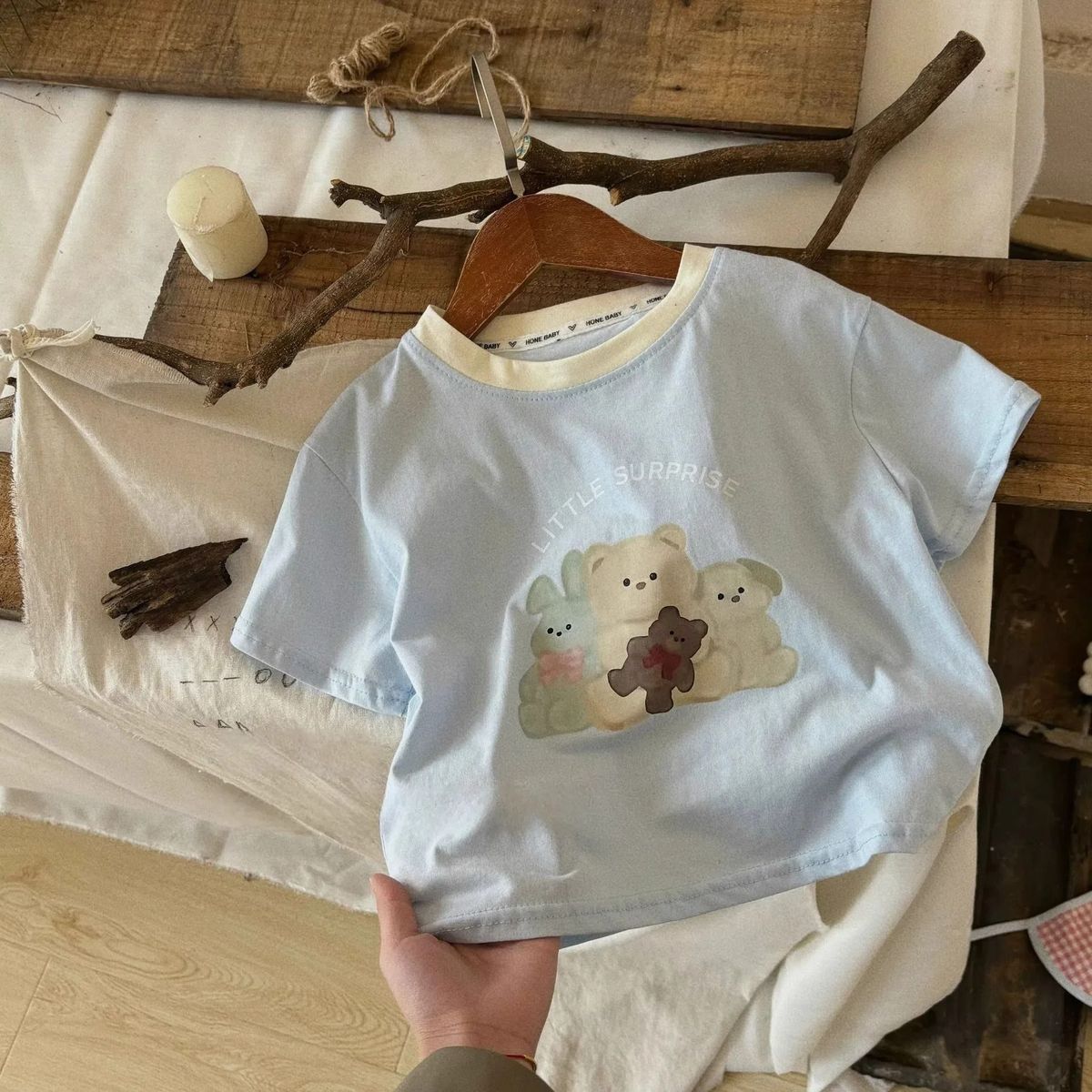 Camiseta de Verano Coreana para Niñas, Nueva Moda Estéreo Orejas de Conejo Estampado de Dibujos Animados Cuello Redondo Manga Corta
