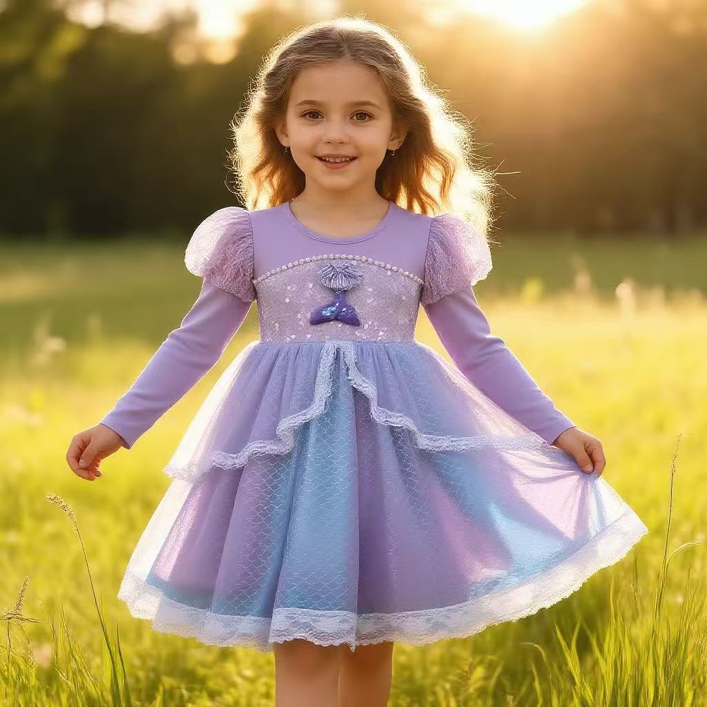 Lindo Vestido de Princesa Sirena de Manga Larga para Niñas Vestido de Noche para Niñas Vestido para Niños Disfraz para Actuación Vestido de Otoño