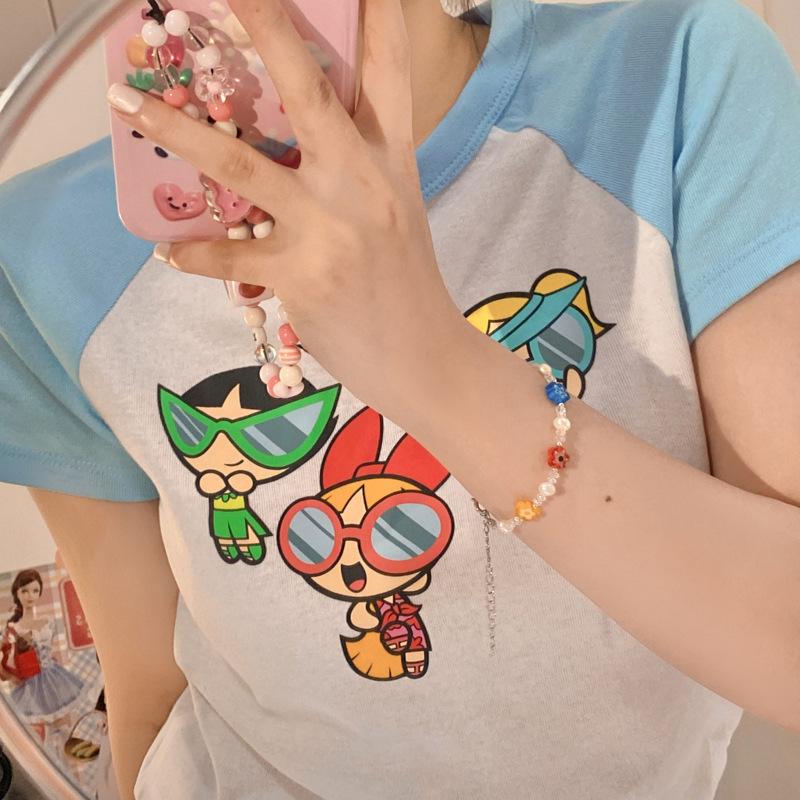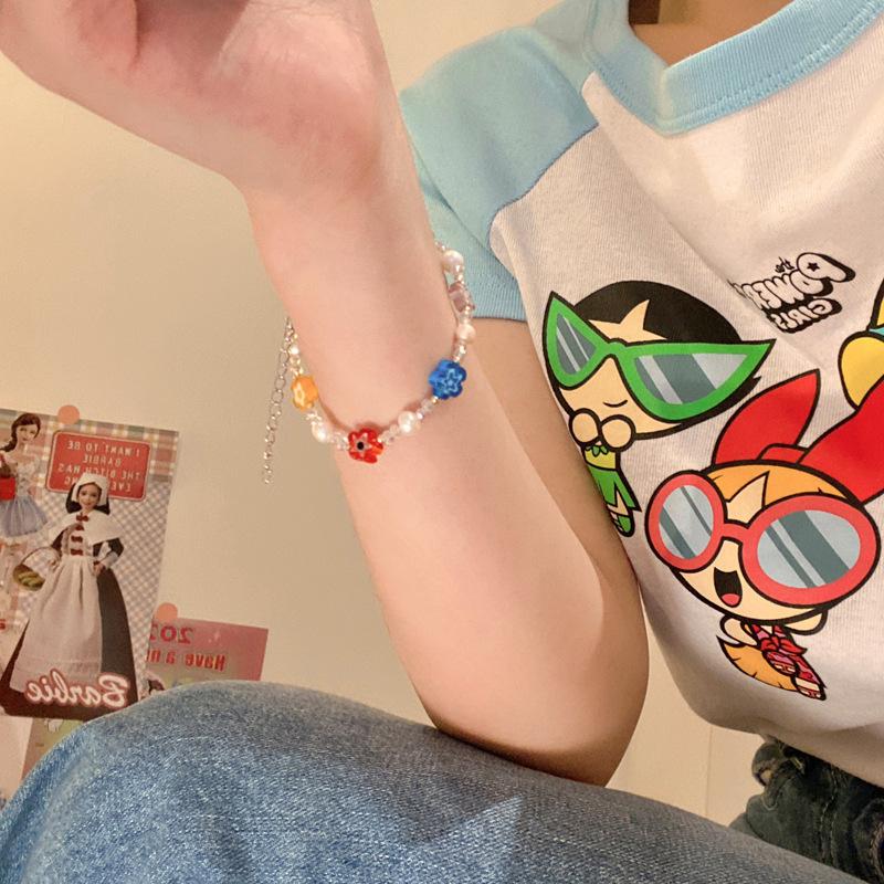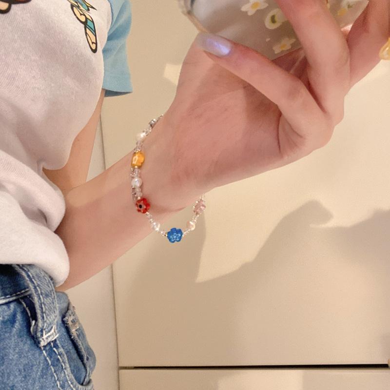 Pulsera de perlas de imitación con flores de colores aleatorios y contraste de colores para mujer, pulsera de cuentas con nicho, nueva pulsera de acero de titanio para mujer
