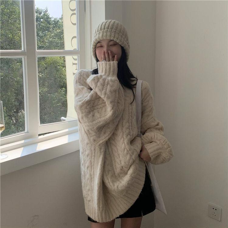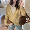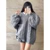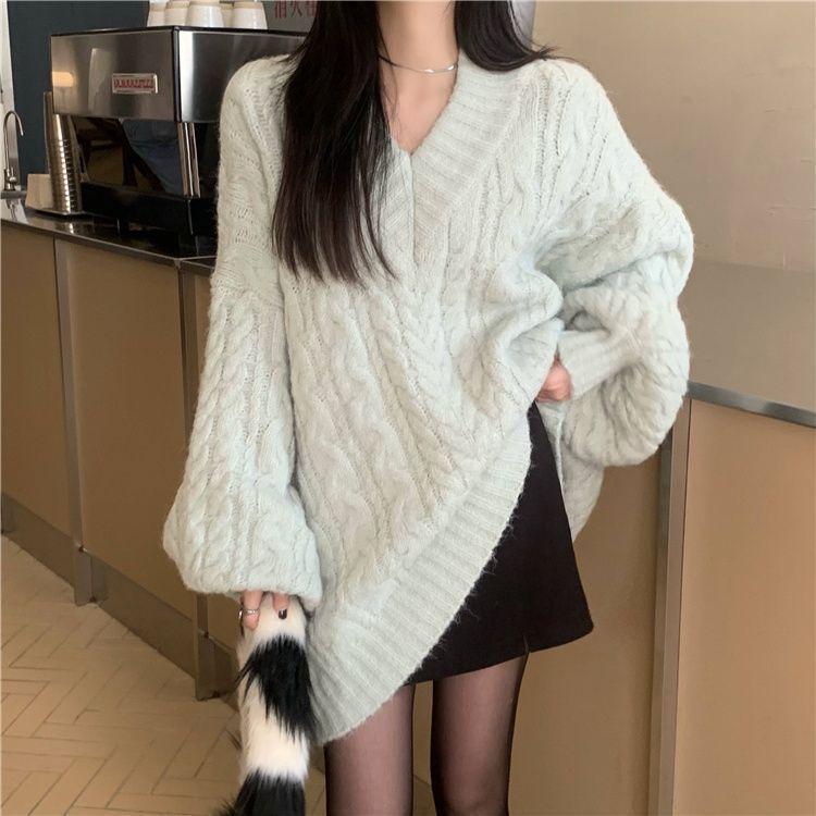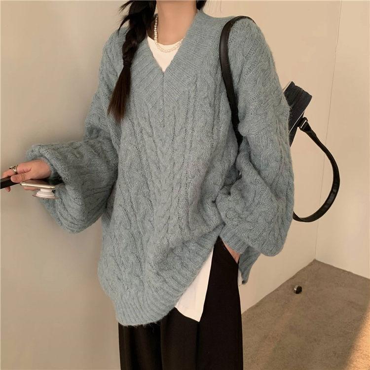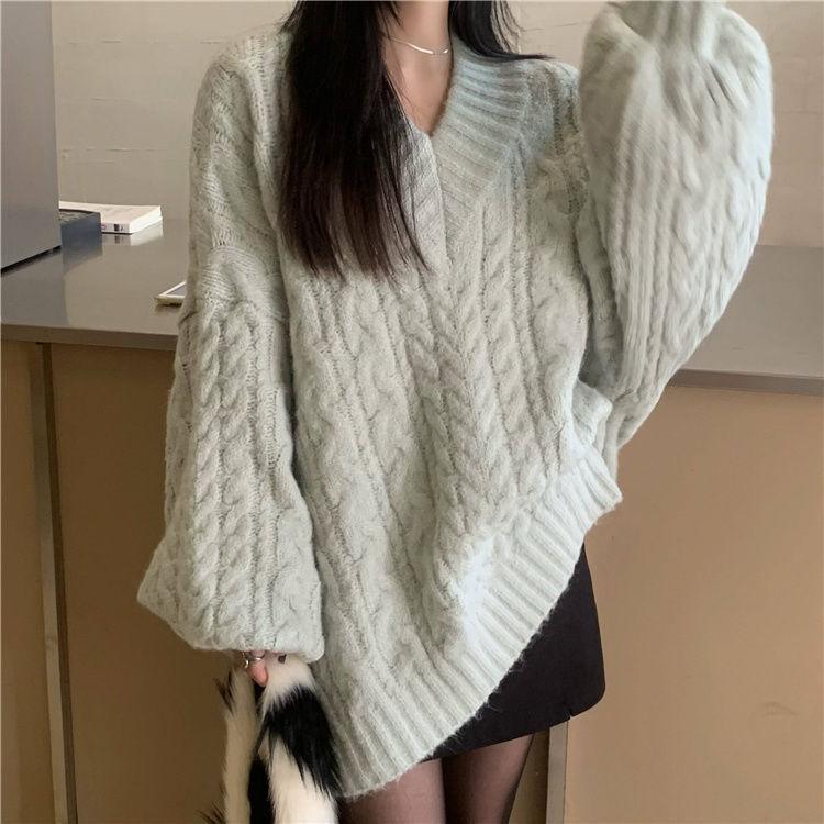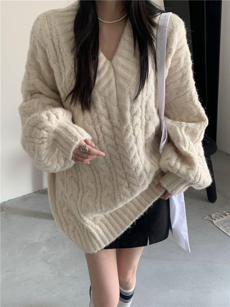 Suéter Grueso de Cuello en V Trenzado para Mujer Otoño/Invierno Holgado Ropa Exterior Estilo Lazy Sentido del Diseño Nicho Cálido Tejido