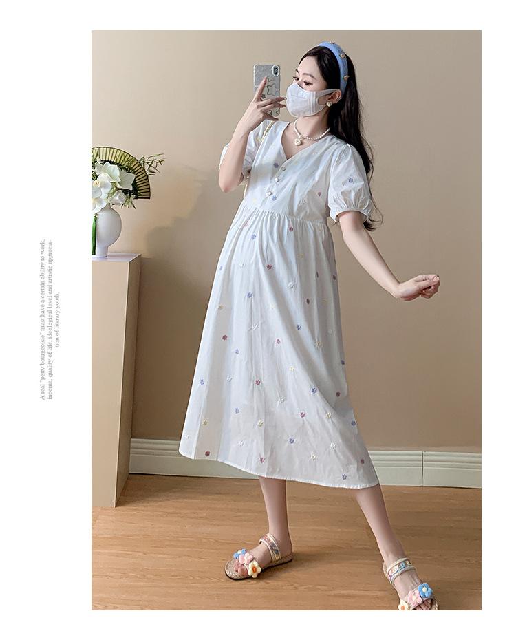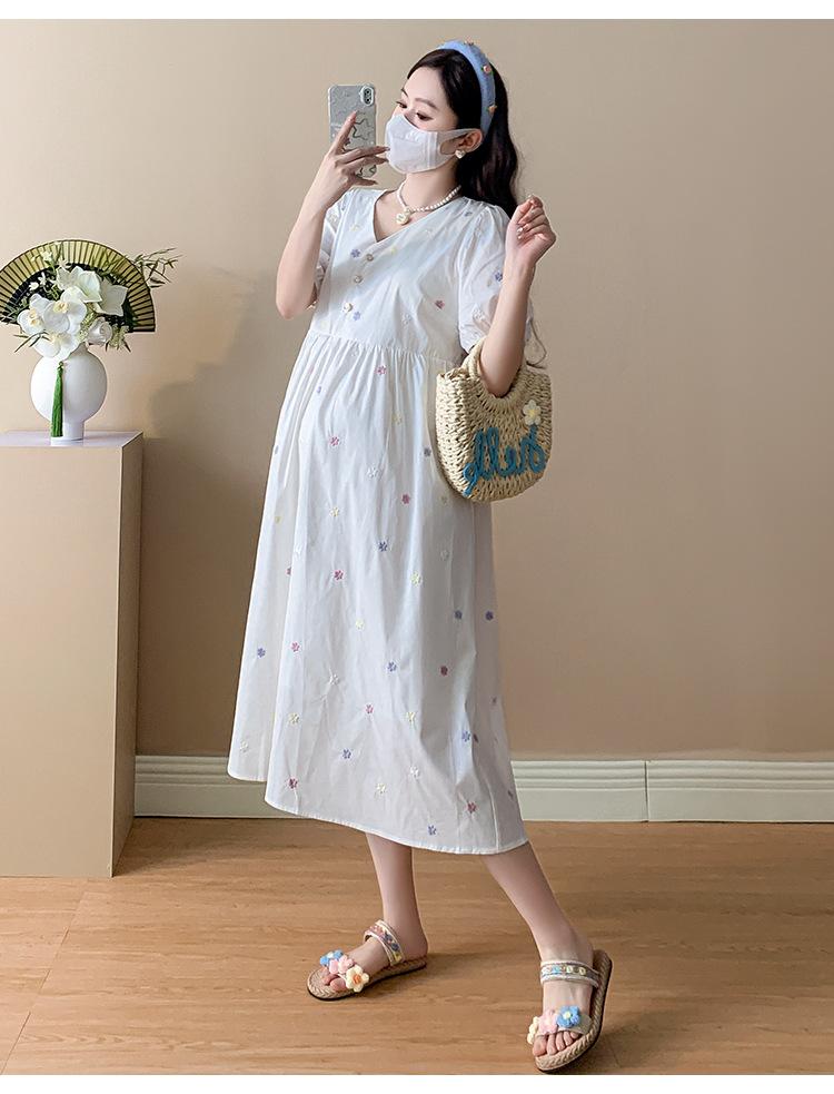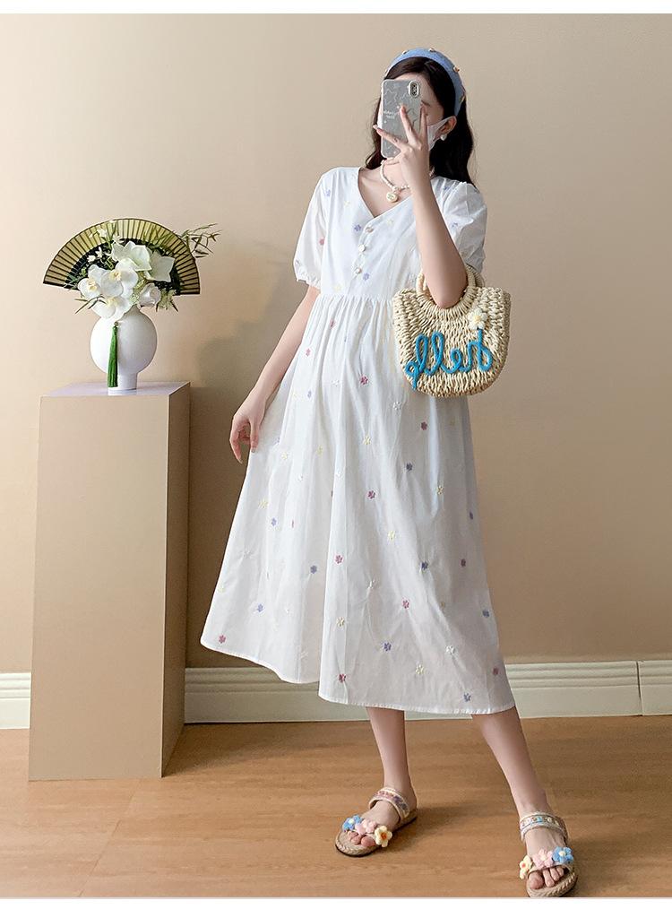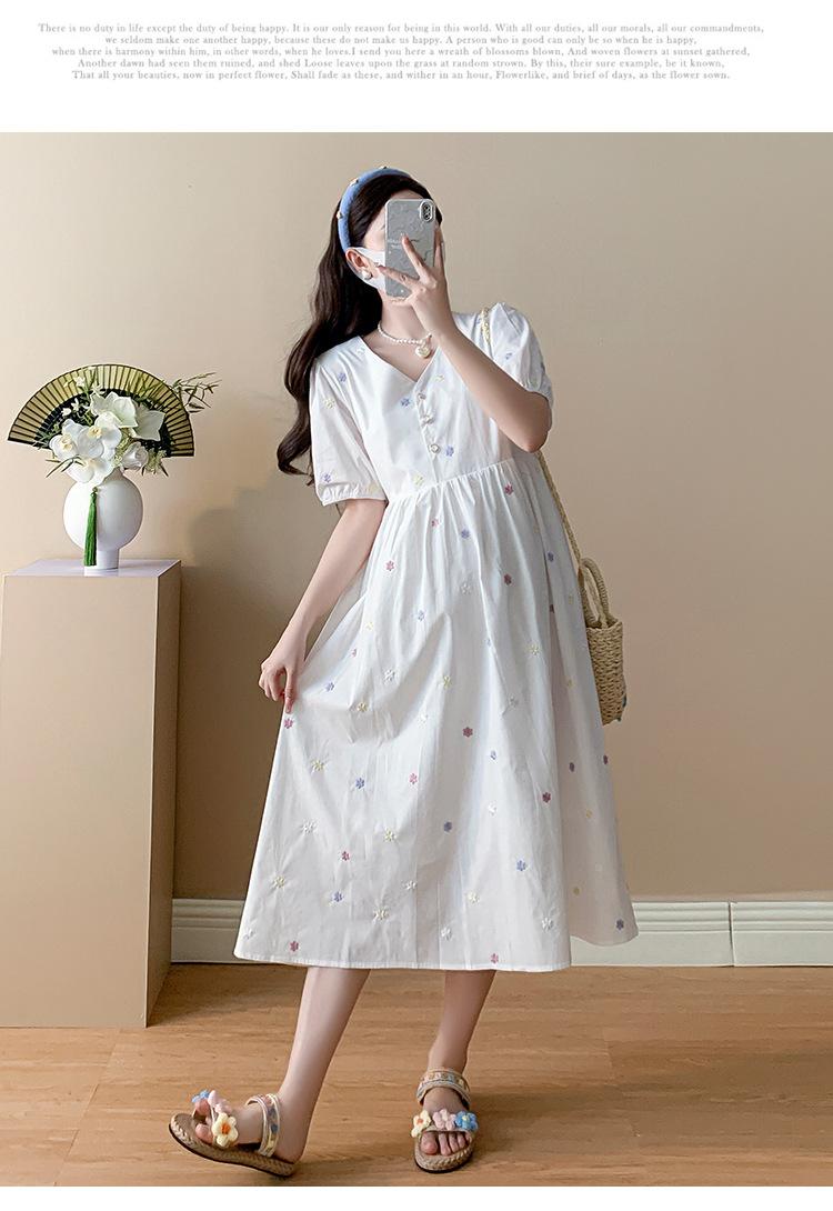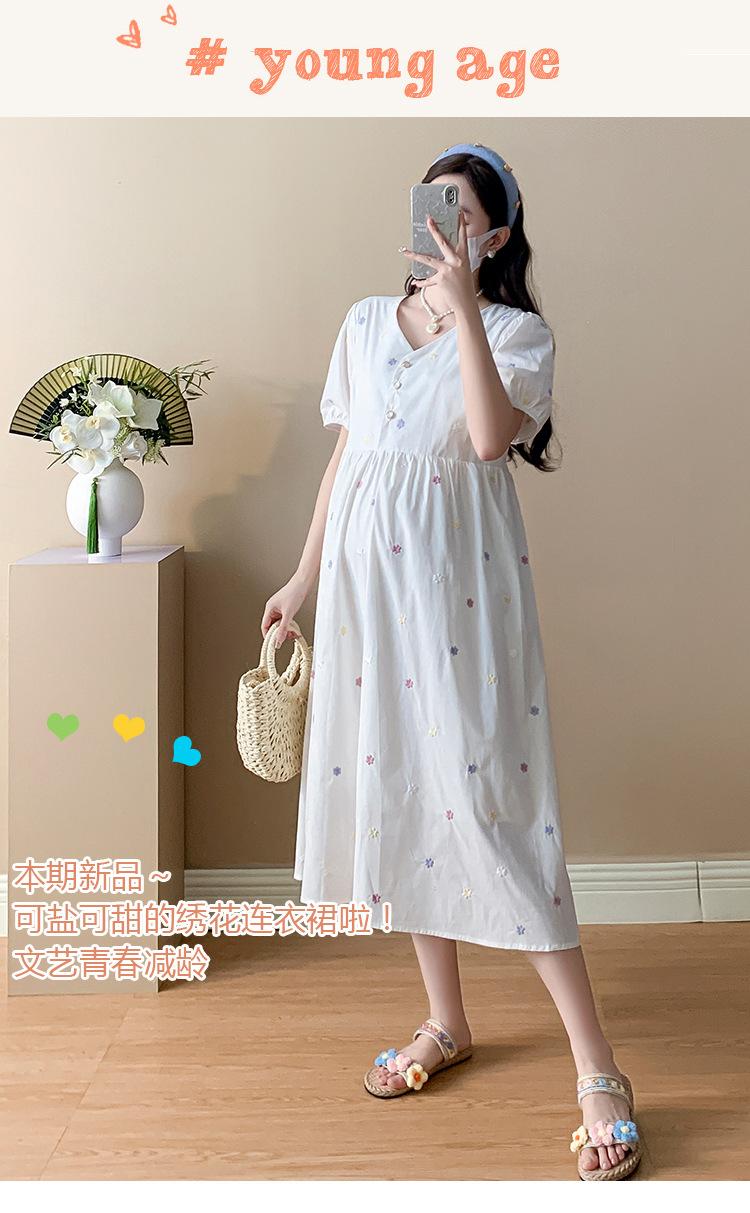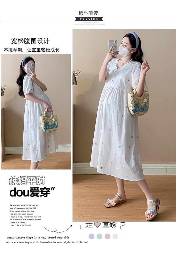 Maternidad 2025 Verano Nuevo Dulce Bordado Cuello en V Pequeño Fresco Suelto Talla Grande Vestido para Mujeres Embarazadas