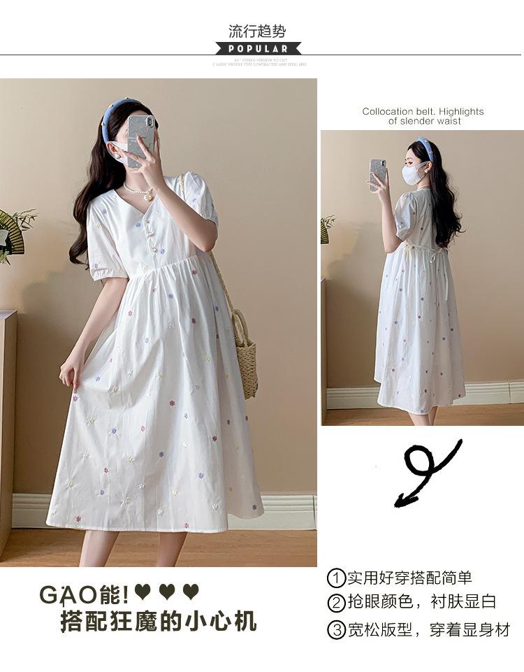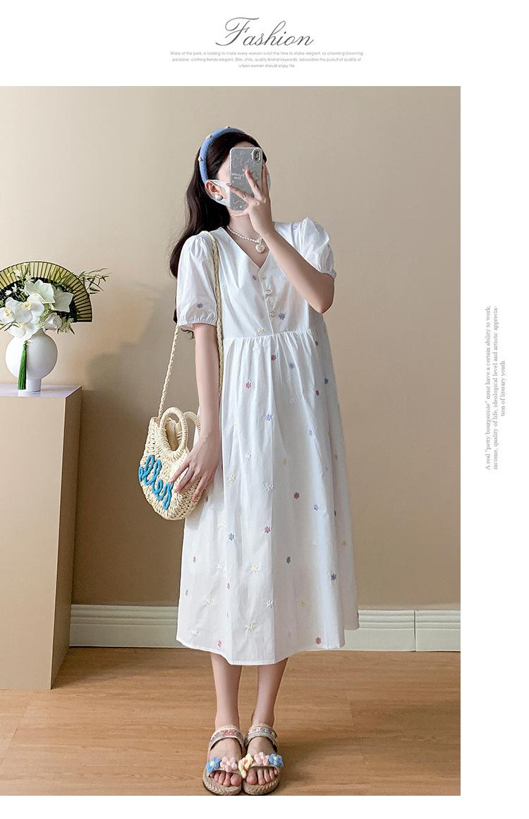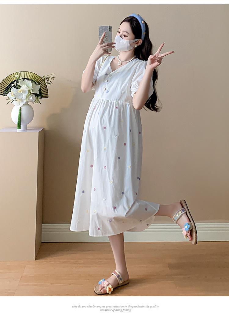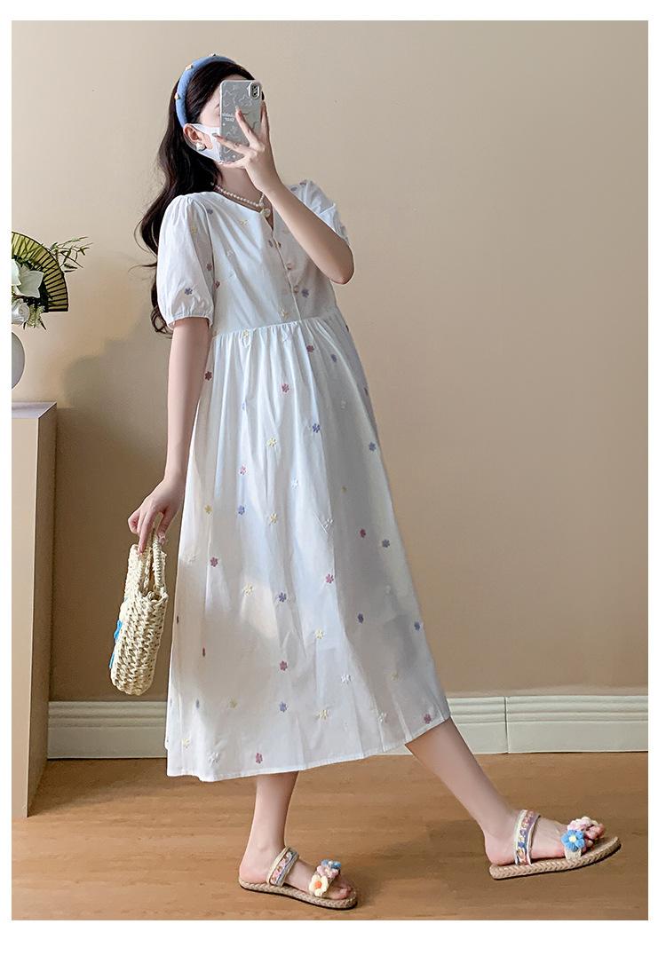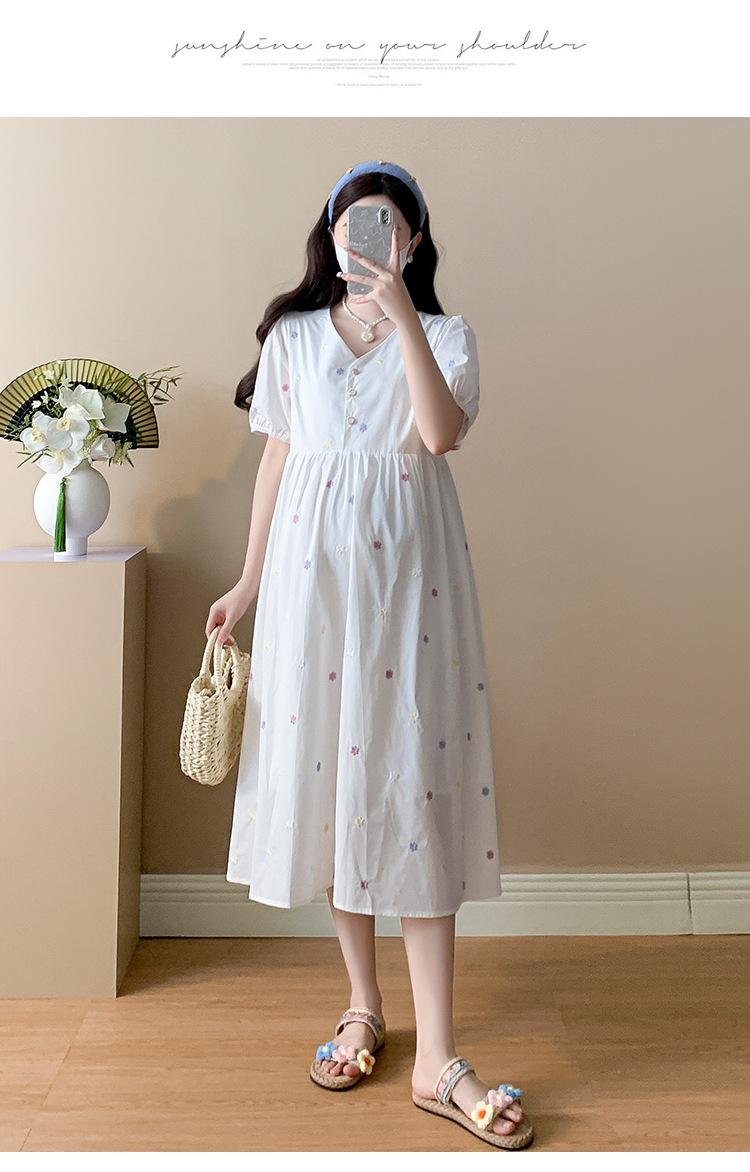 Maternidad 2025 Verano Nuevo Dulce Bordado Cuello en V Pequeño Fresco Suelto Talla Grande Vestido para Mujeres Embarazadas