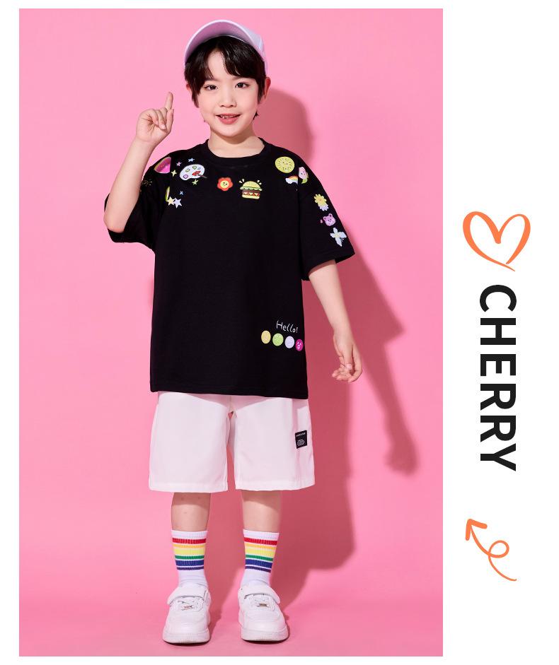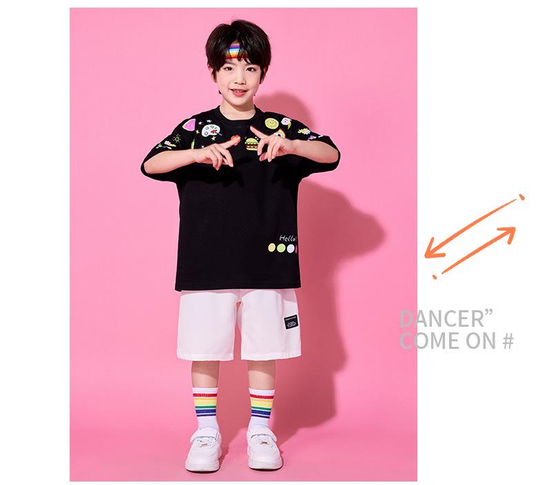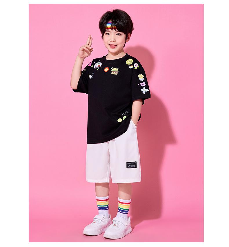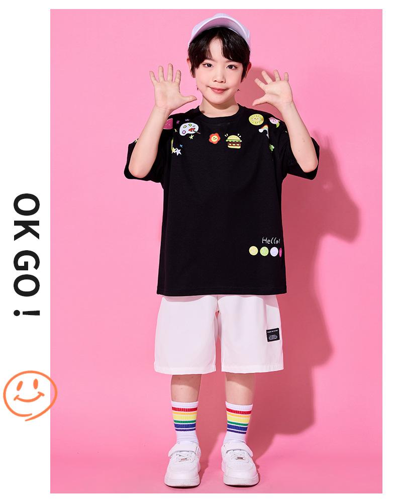 A46 cartoon print black short sleeves + 701 white shorts + rainbow socks