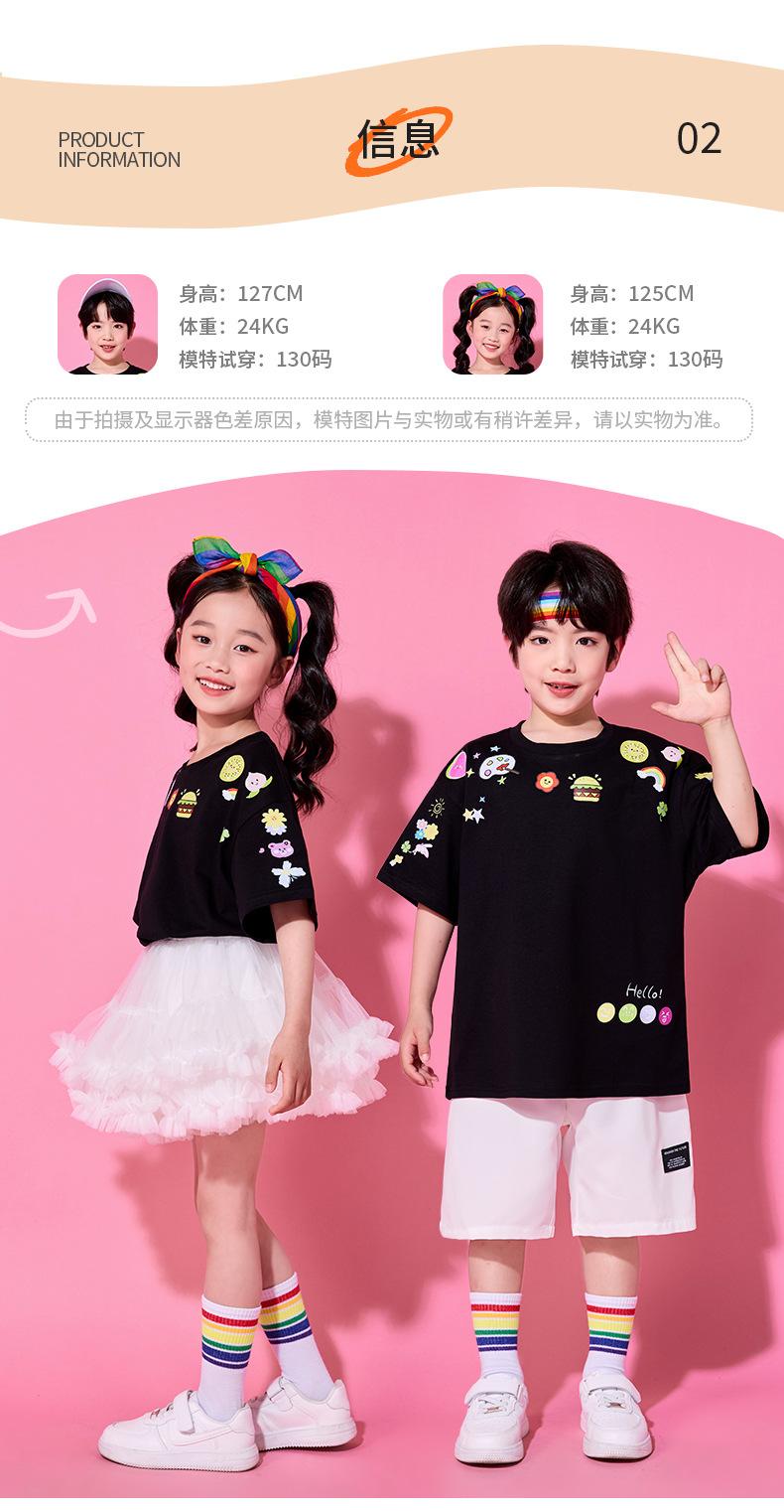 A46 cartoon print black short sleeves + 701 white shorts + rainbow headband + rainbow socks