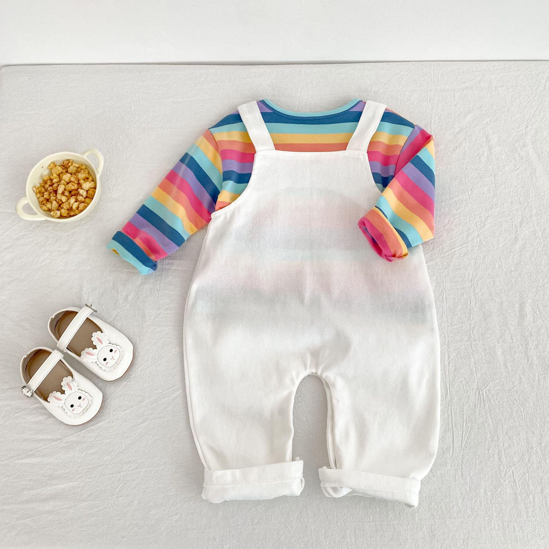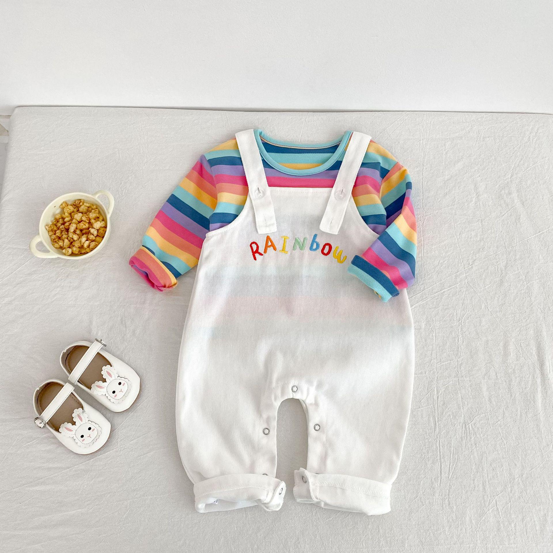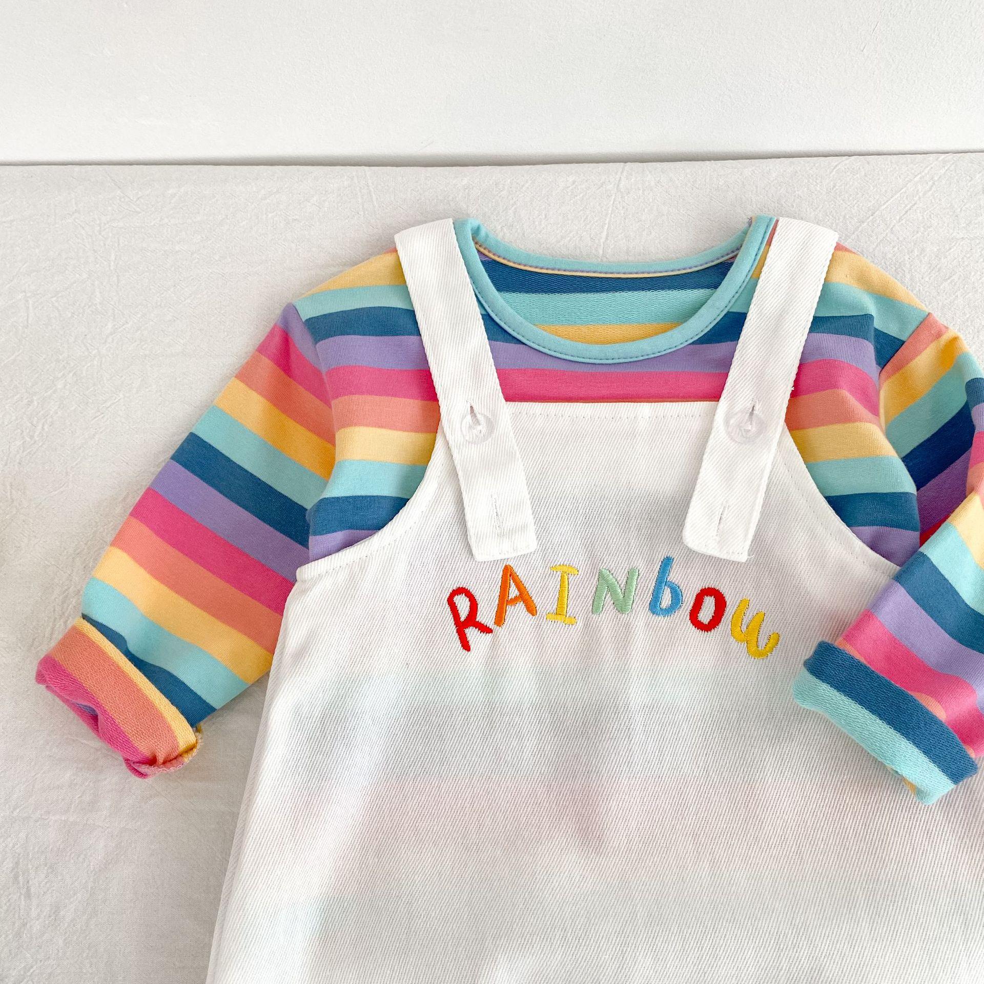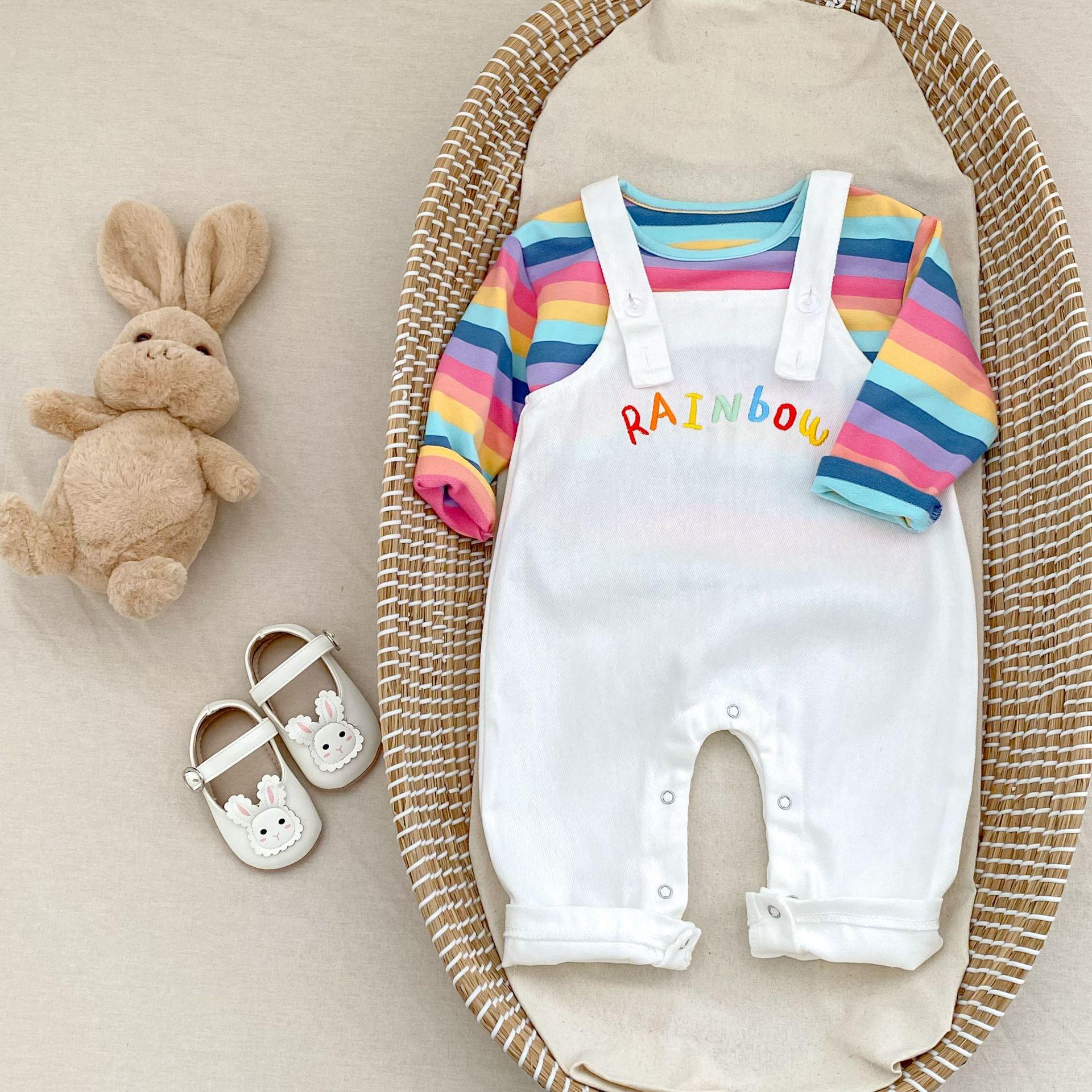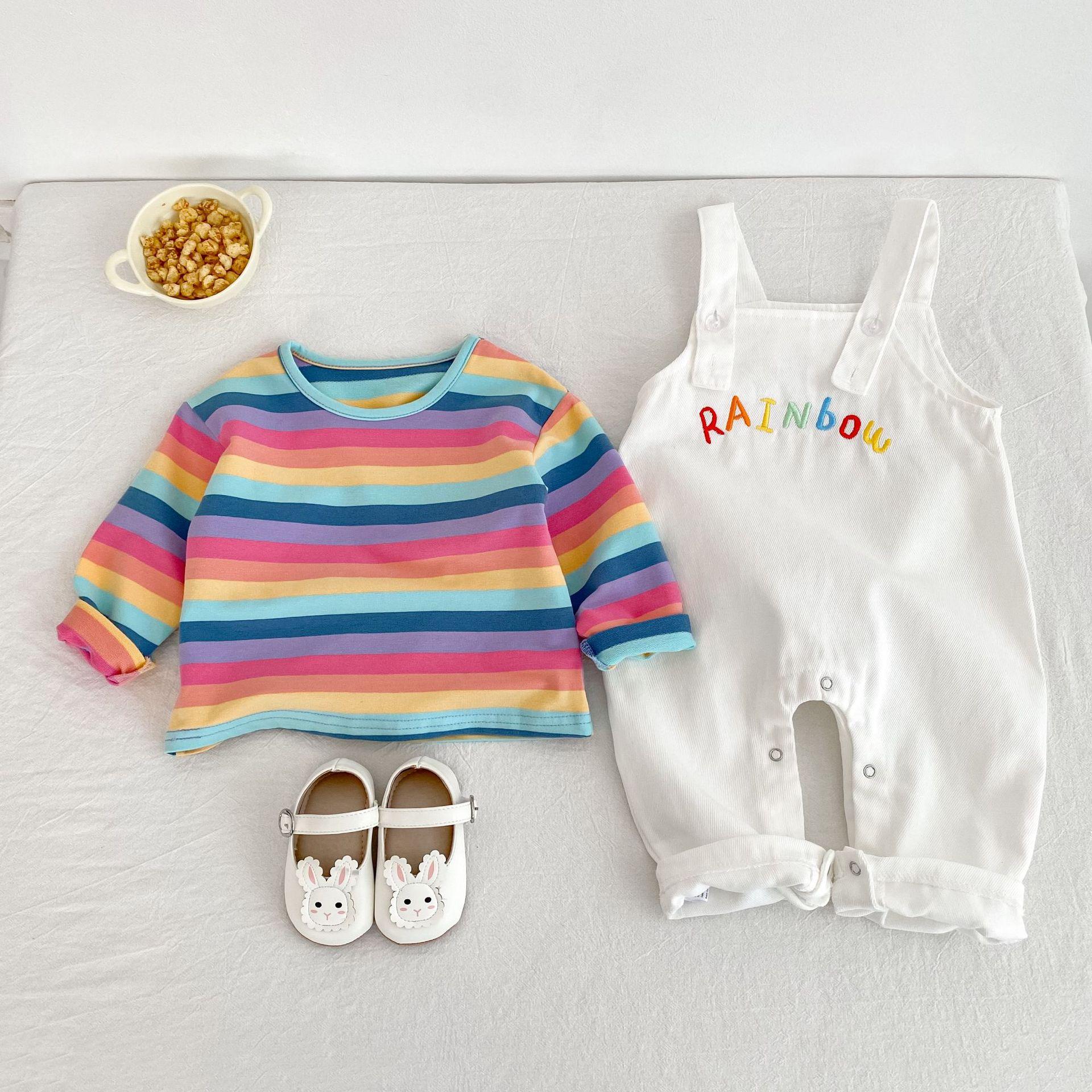 Otoño 2025 Bebé Niños y Niñas Monos Lindos de Moda Bordado de Letras Top de Manga Larga a Rayas Arcoíris Conjunto de Dos Piezas