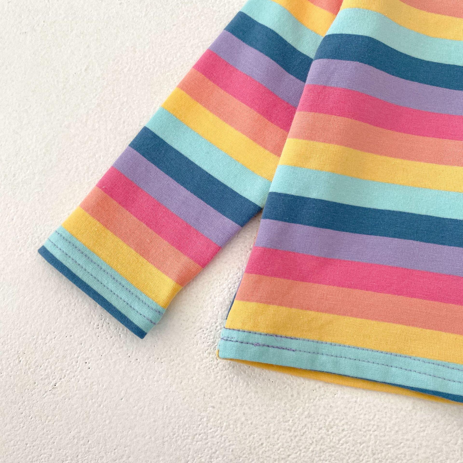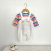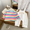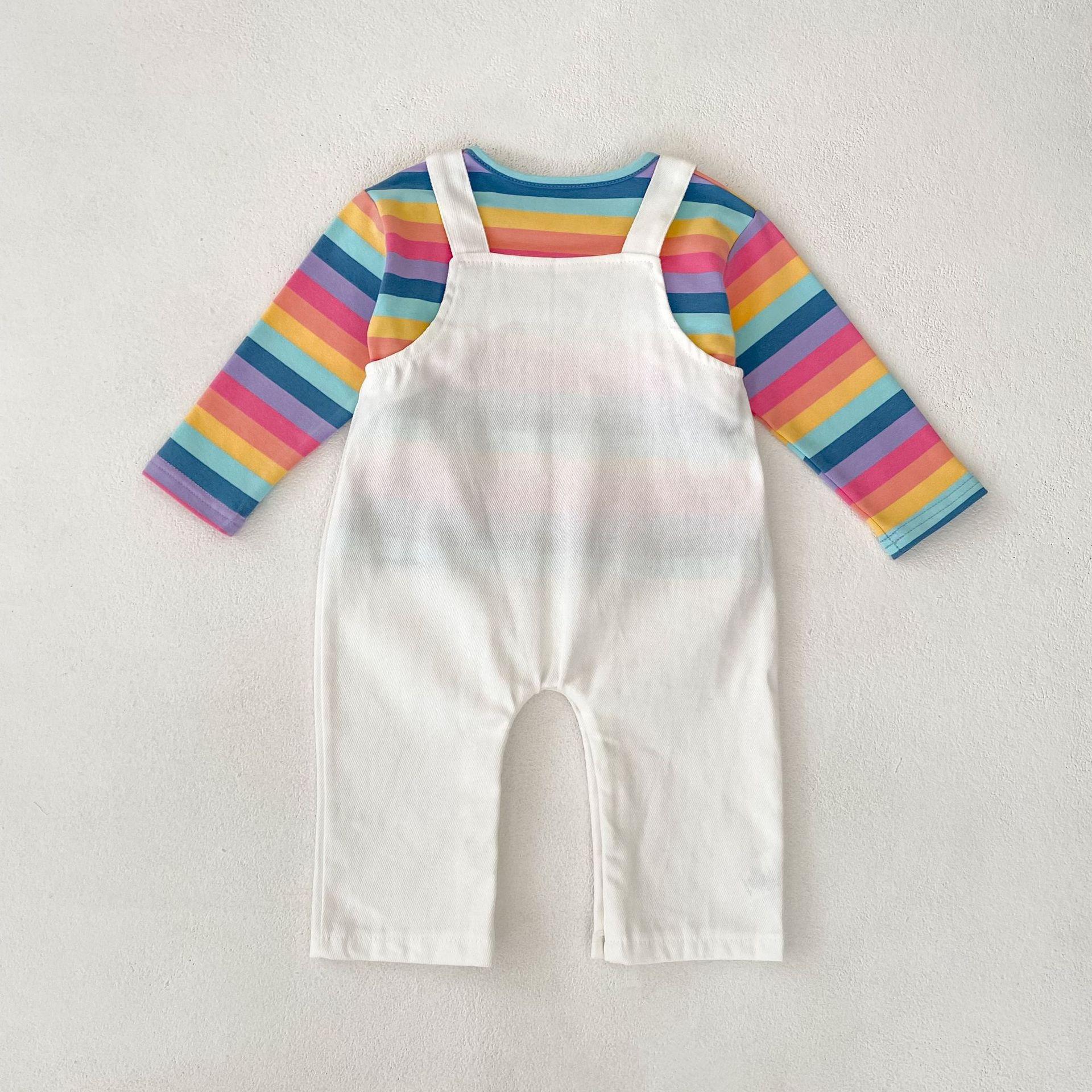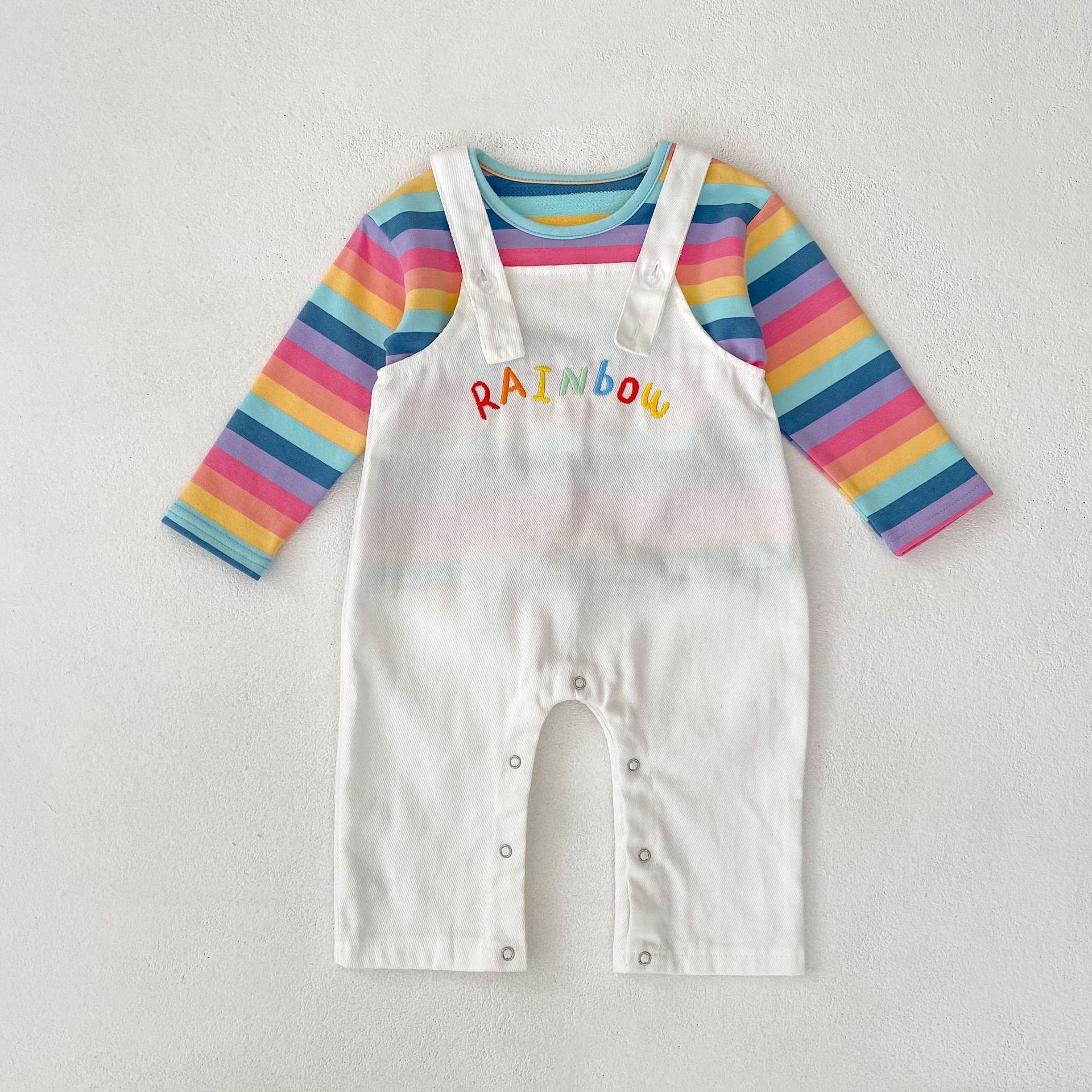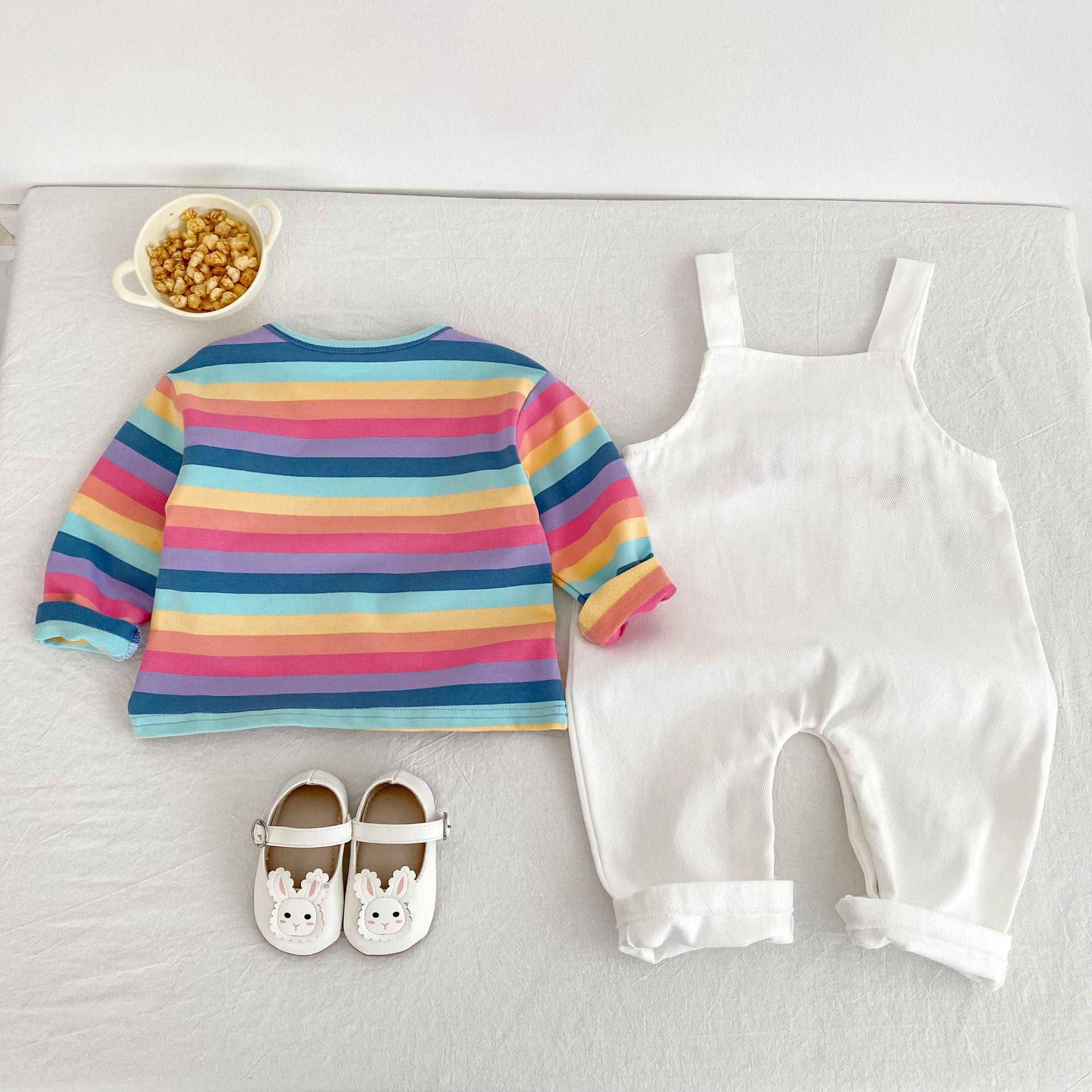 Otoño 2025 Bebé Niños y Niñas Monos Lindos de Moda Bordado de Letras Top de Manga Larga a Rayas Arcoíris Conjunto de Dos Piezas