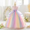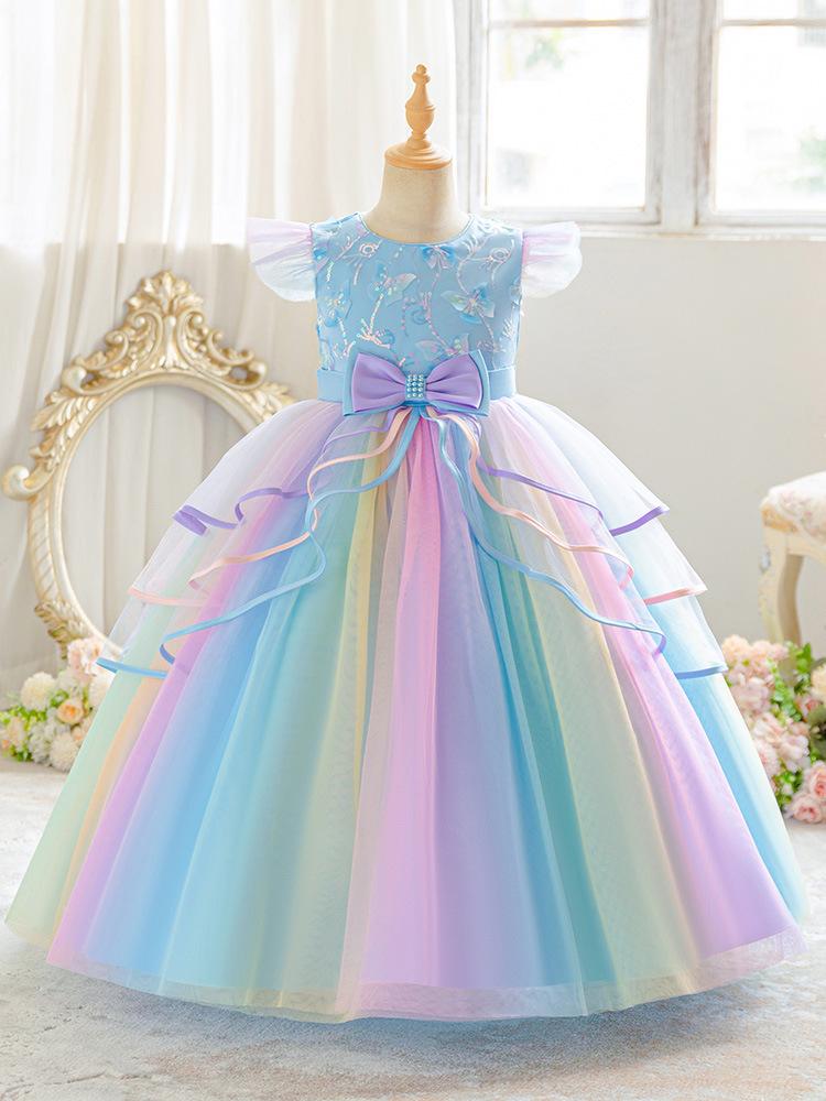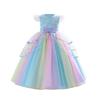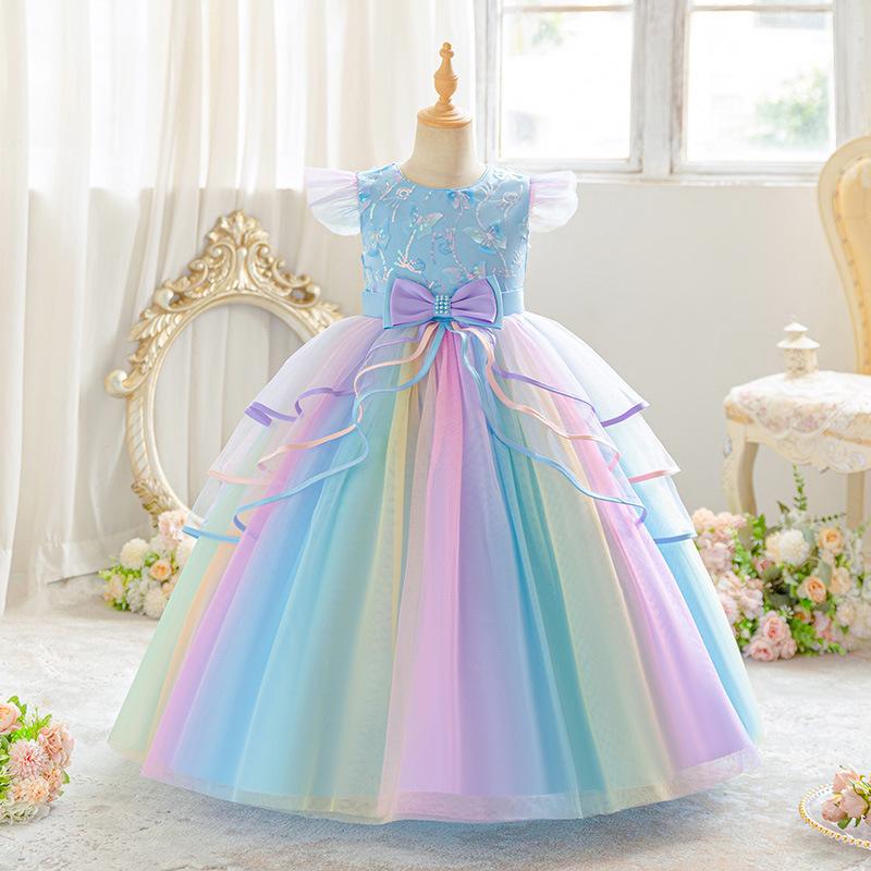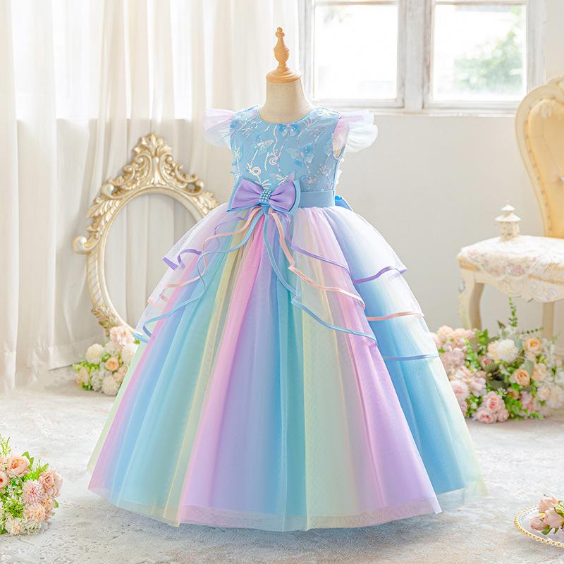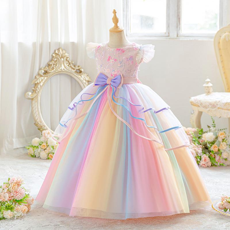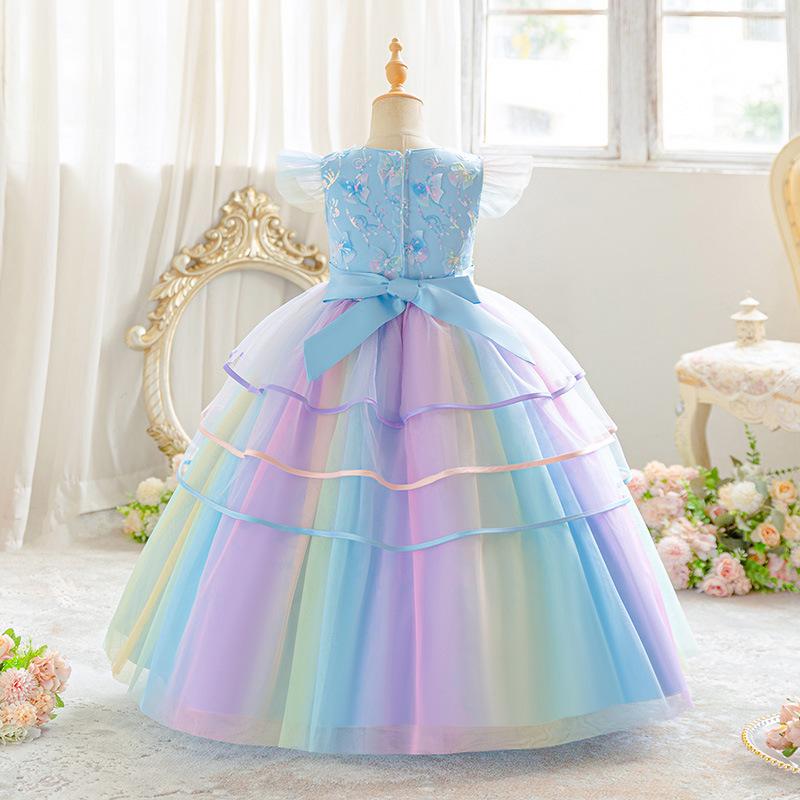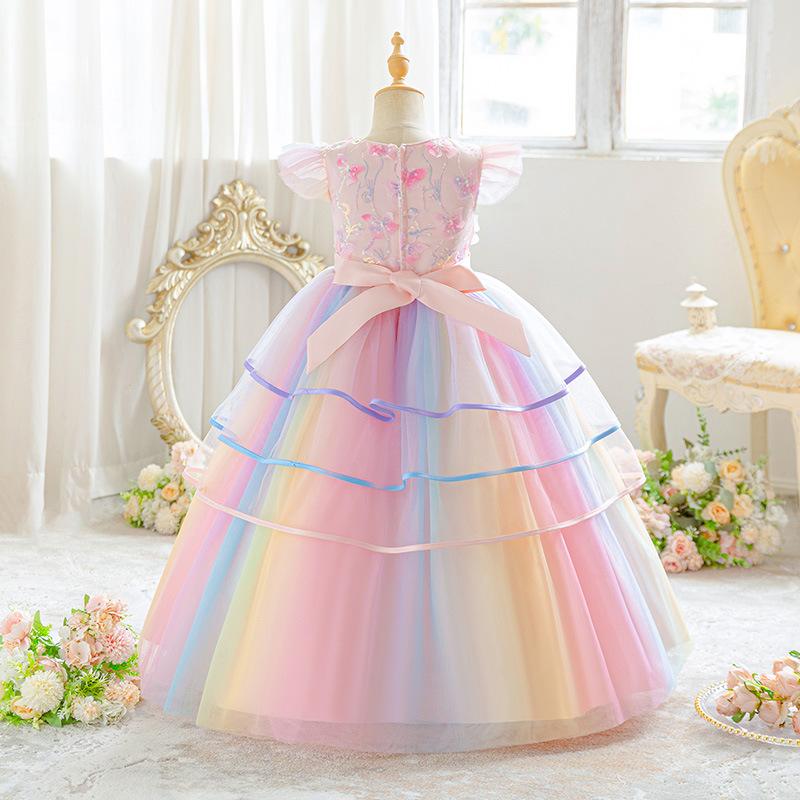 Vestido Transfronterizo Personalizado para Niñas, Vestido de Dama de Honor de Boda de Malla con Flores, Colorido Estilo Europeo y Americano Largo Nuevo Estilo Vestido de Princesa para Niños