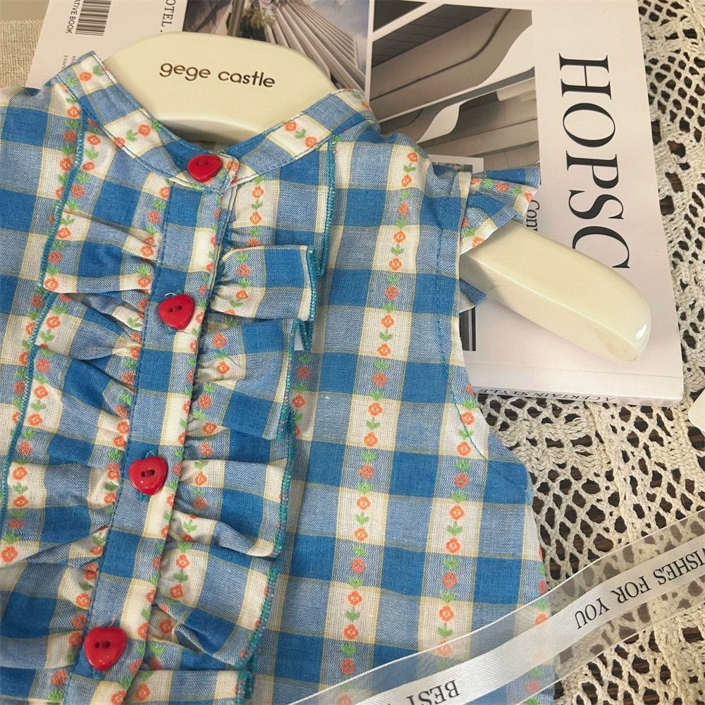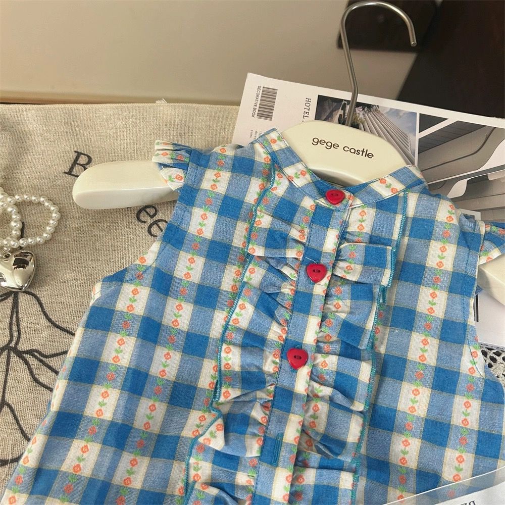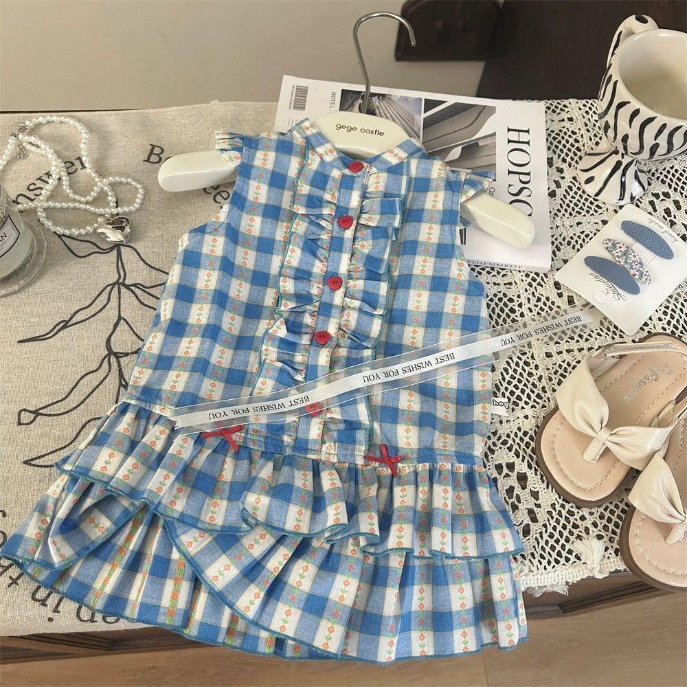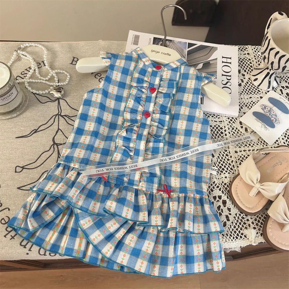 Ropa Infantil Estilo Coreano Vestido de Verano para Niñas 2024 Nuevo Estilo Falda de Algodón Vestido Chaleco de Verano a Cuadros para Bebé