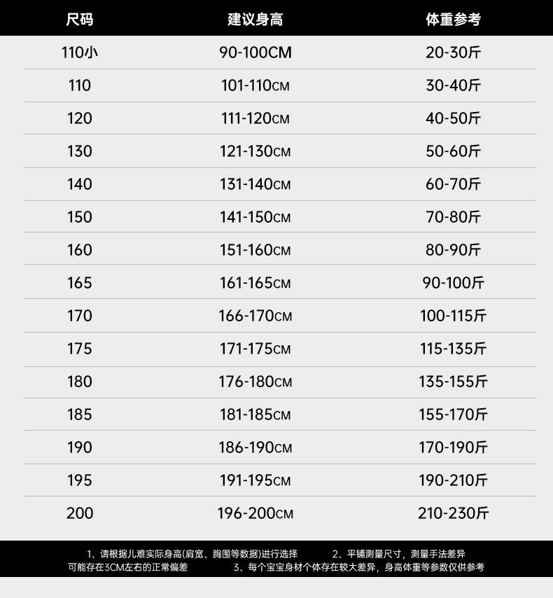 100cm, 110cm, 120cm, 130cm, 140cm, 150cm, 160cm, 165cm, 170cm, 175cm