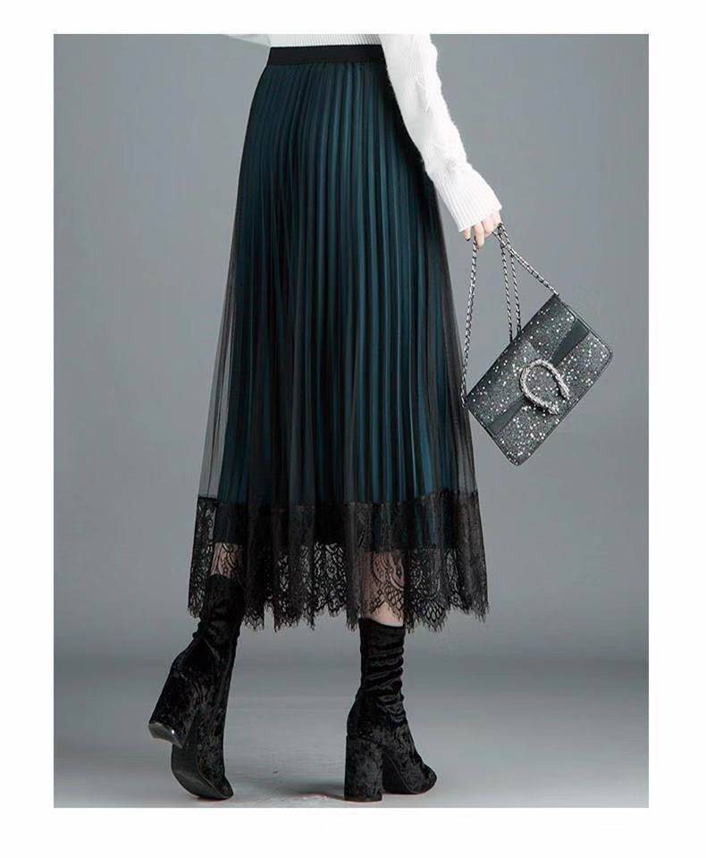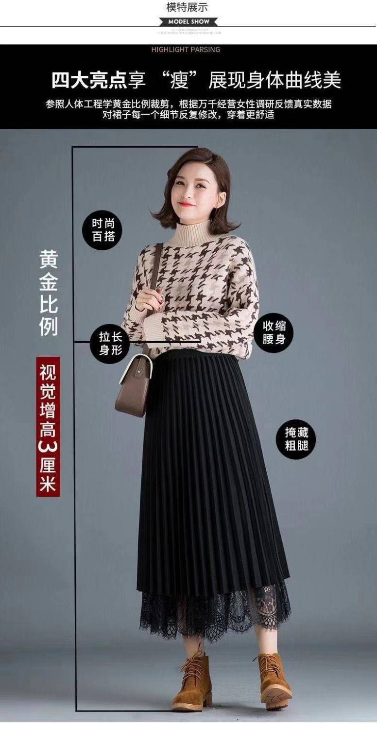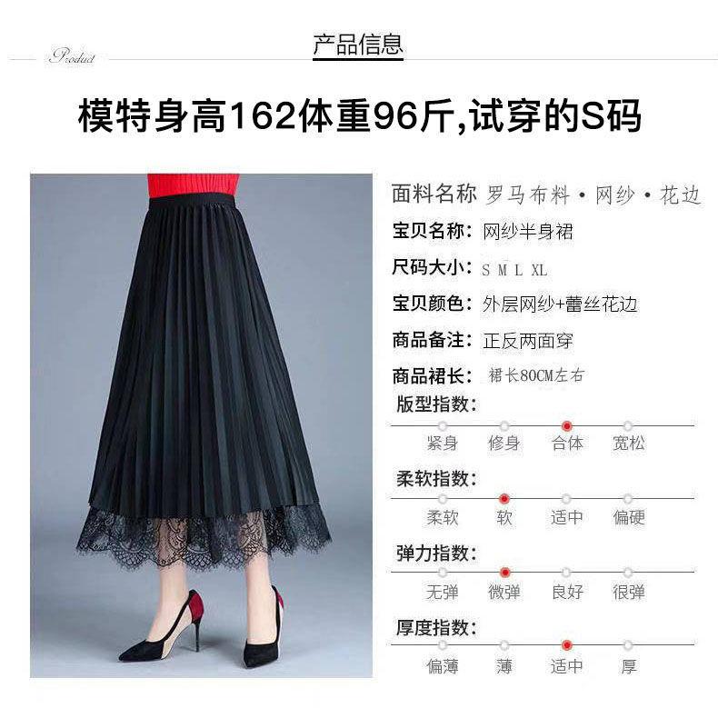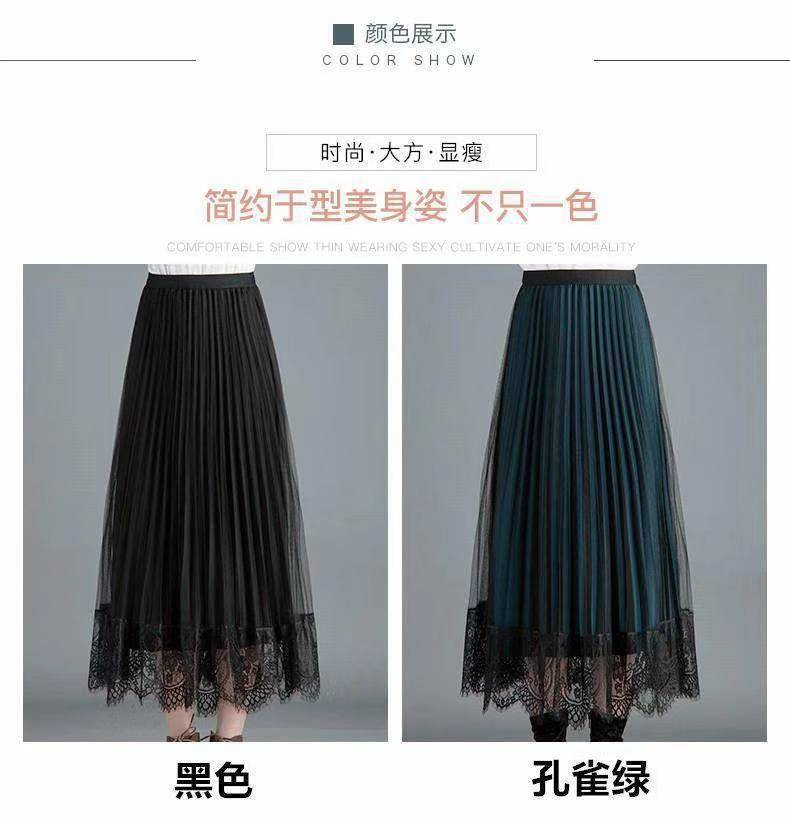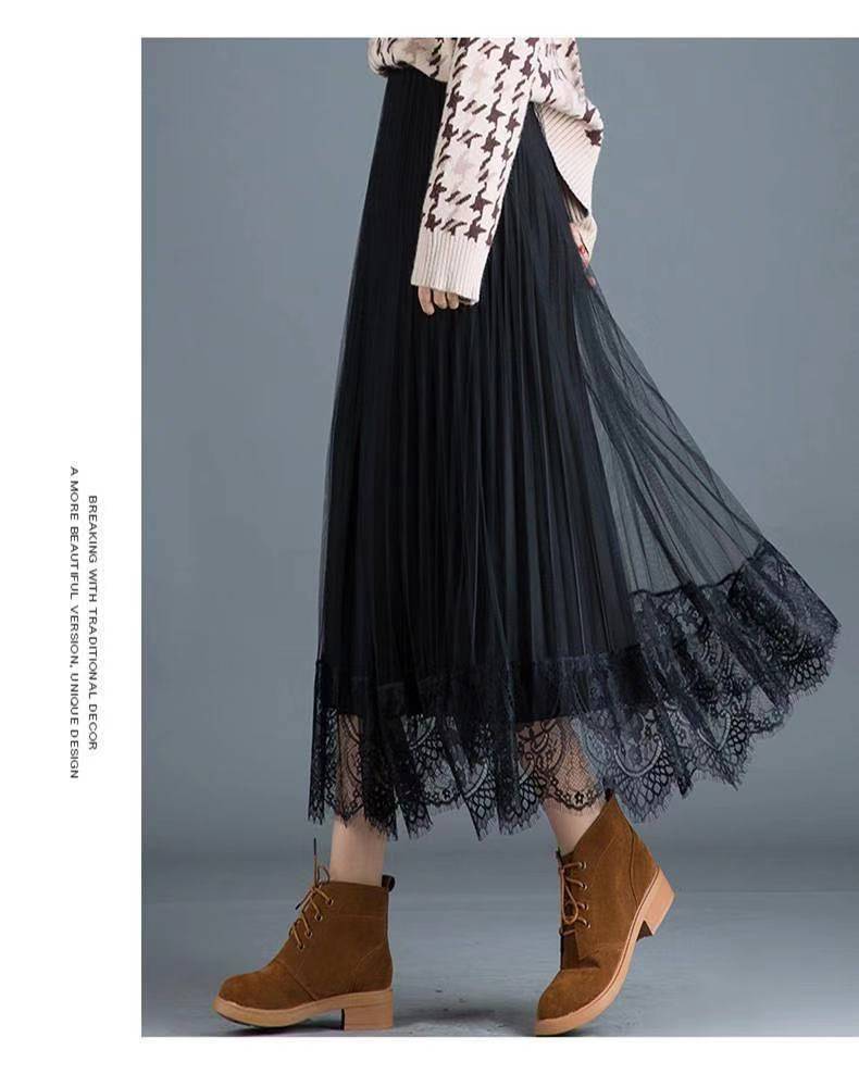 [Reversible] Falda Otoño e Invierno para Mujer Nueva Talla Grande Cintura Alta Encaje Falda Plisada Media Longitud Ajustada Falda de Malla
