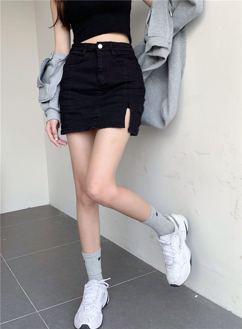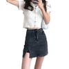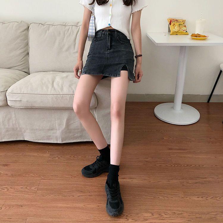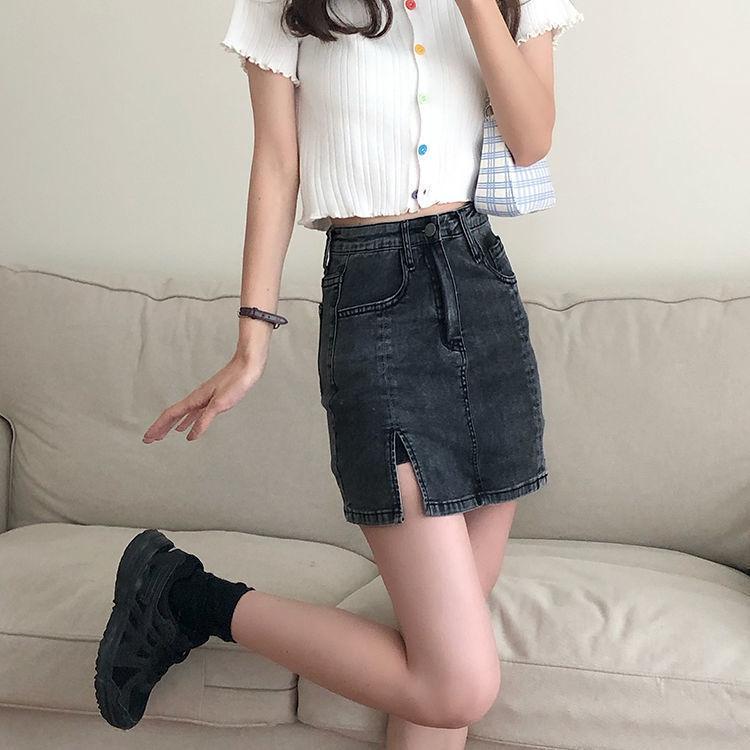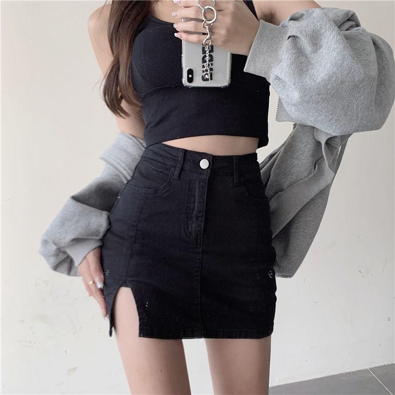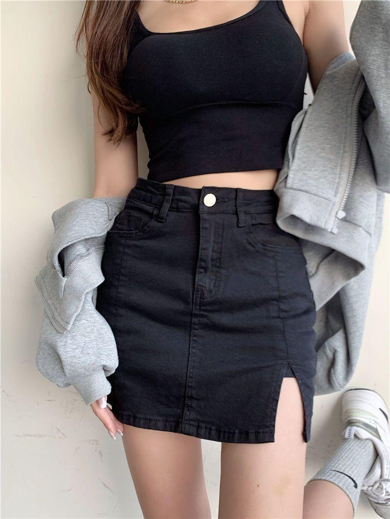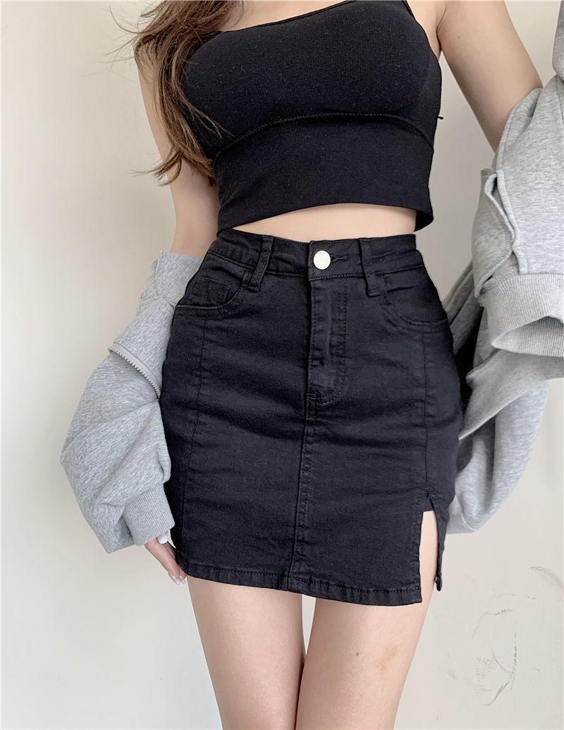 Falda de mezclilla negra de cintura alta para mujer Verano 2025 Nueva Falda con abertura Spice Girl de cadera Falda delgada línea A