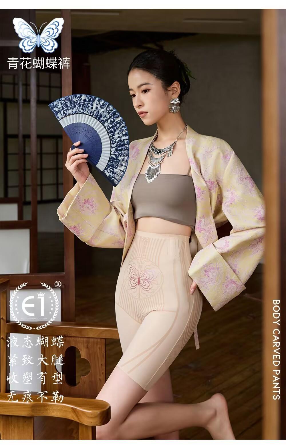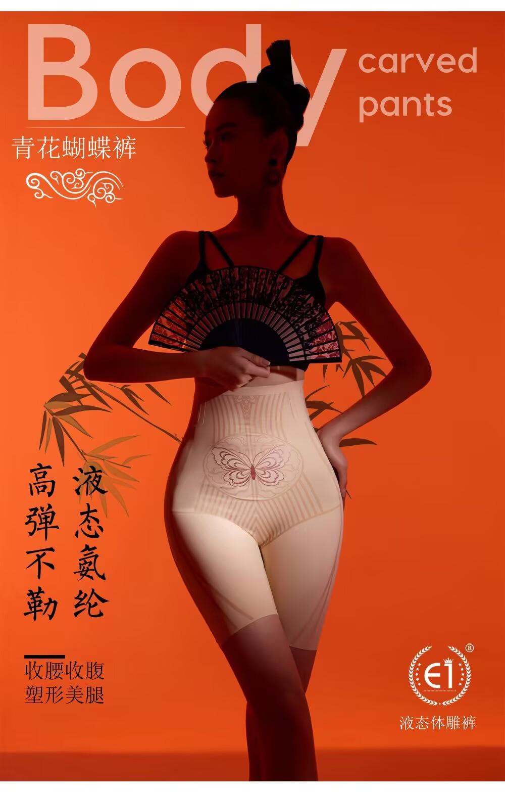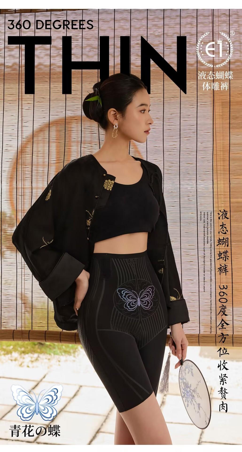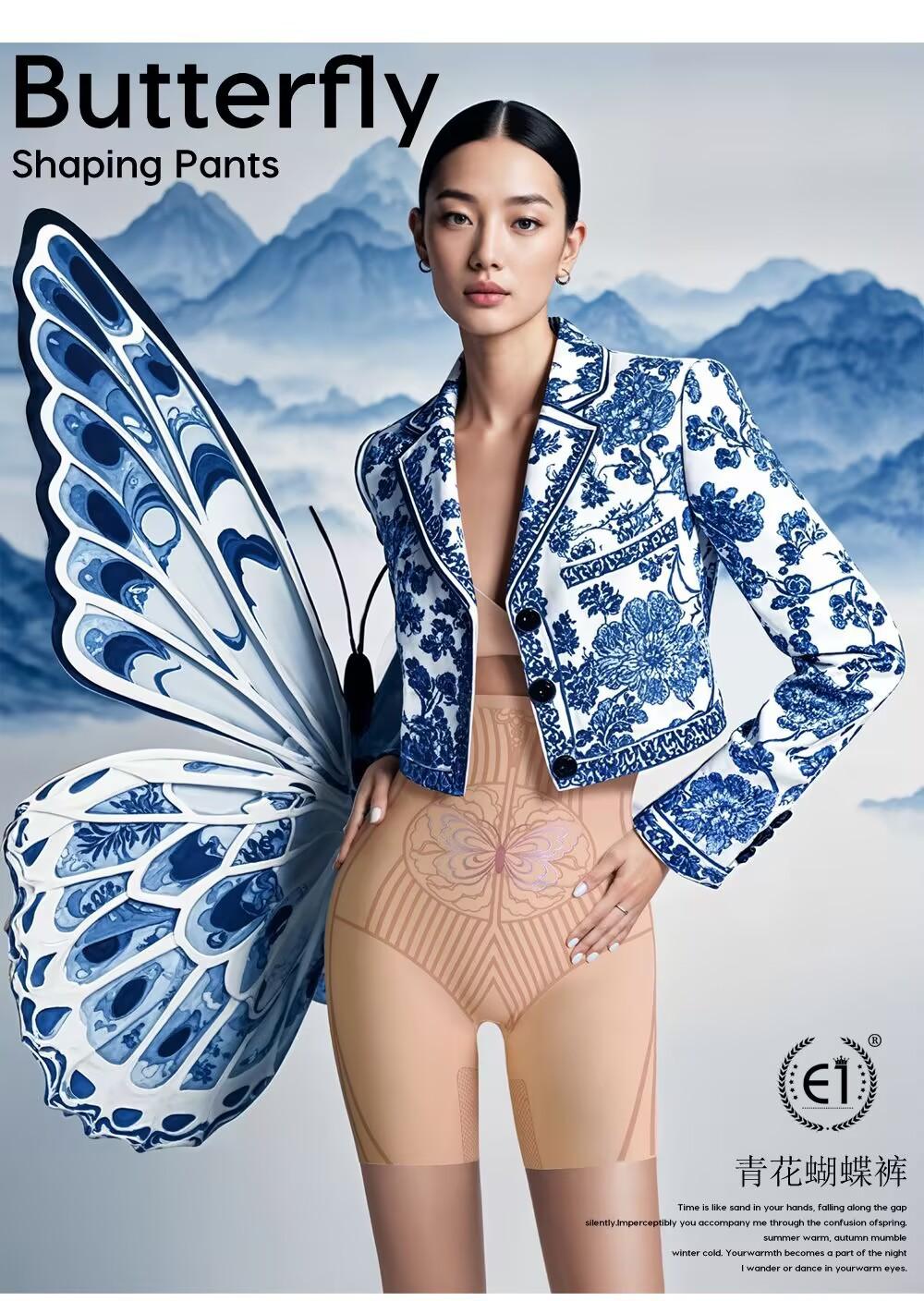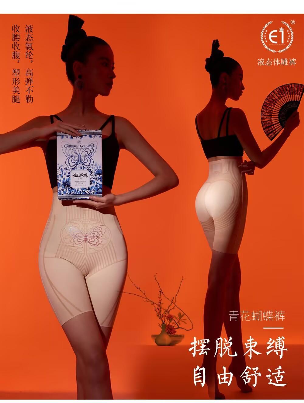 E1 Pantalones Moldeadores de Cuerpo de Mariposa Líquida Azul y Blanco Verano Ultradelgados Control de Abdomen Levantamiento de Glúteos Moldeado de Abdomen Postparto Cintura Alta Moldeado de Caderas