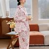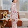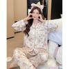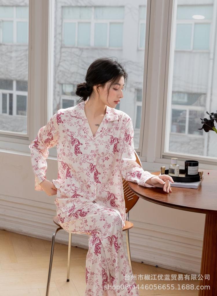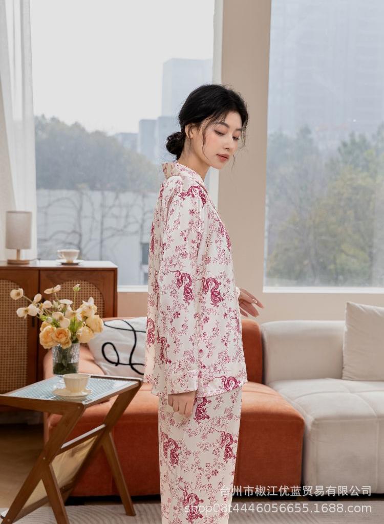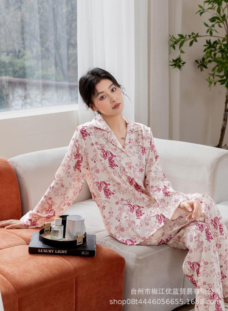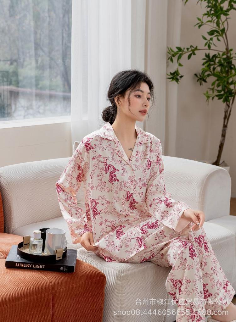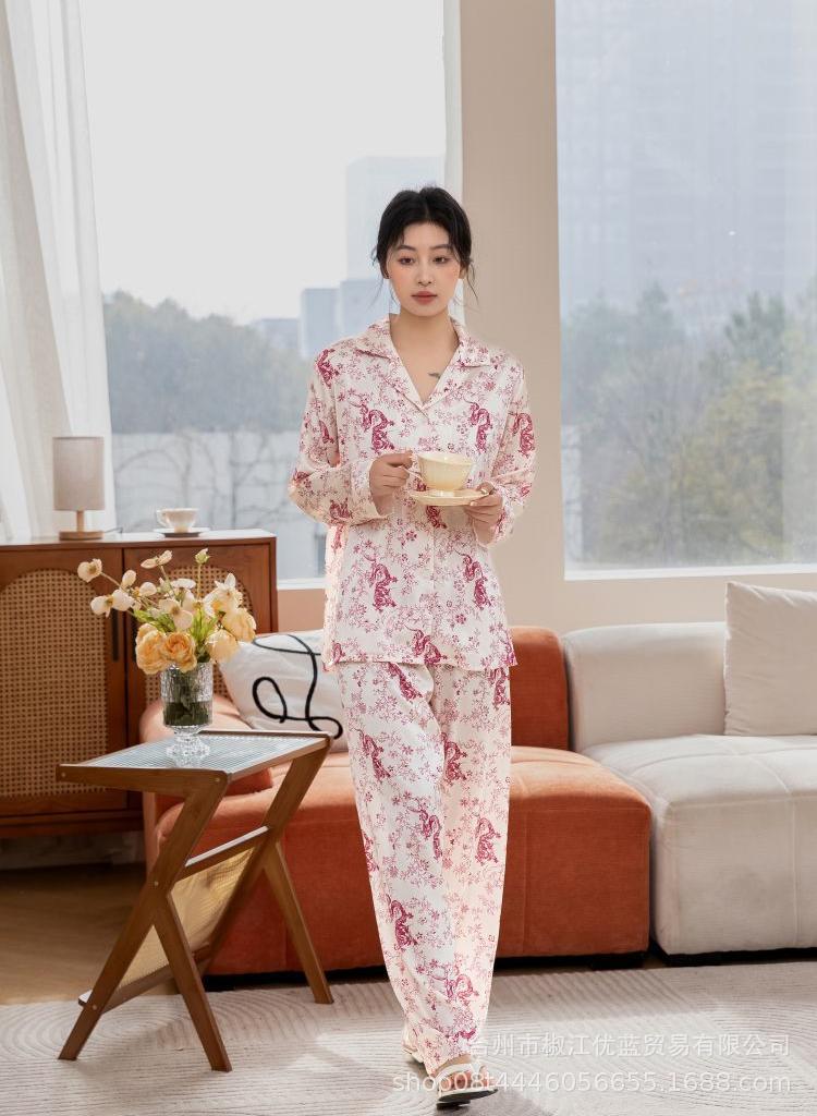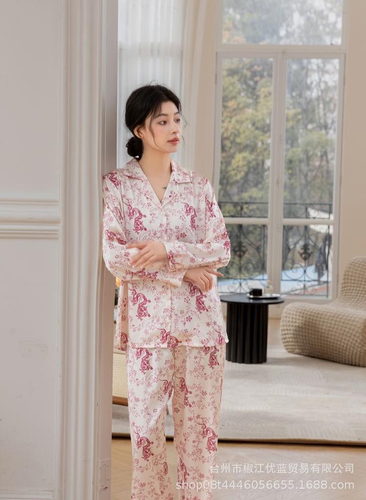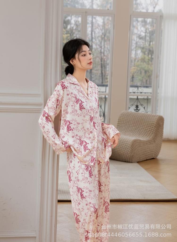 Nuevo Conjunto de Pijama de Seda de Hielo Cómodo de Dos Piezas Estampado Rosa Dulce Conjunto Doble Largo Ropa para el Hogar de Lujo Ligero