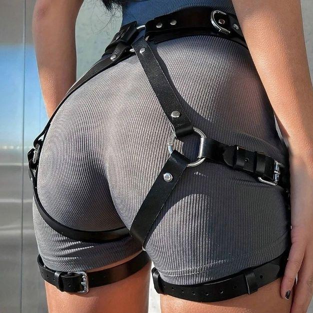 Pp Europeo y Americano Nuevo Sexy Arnés de Cuero con Correa Cinturón de Atadura de Cuero para Mujer Punk Cruz Hueca