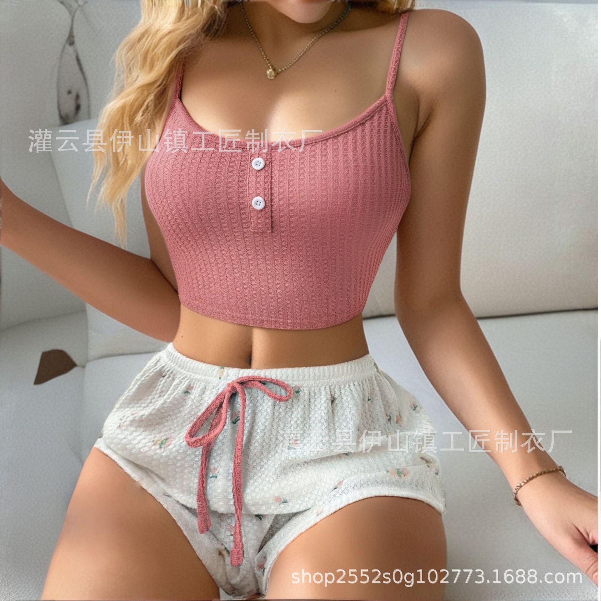 Verano Transfronterizo Nuevo Estilo Europeo y Americano Dulce Tirantes Floral Pijama Traje para Mujer Shorts Ropa para el Hogar Conjunto de Dos Piezas