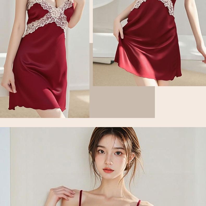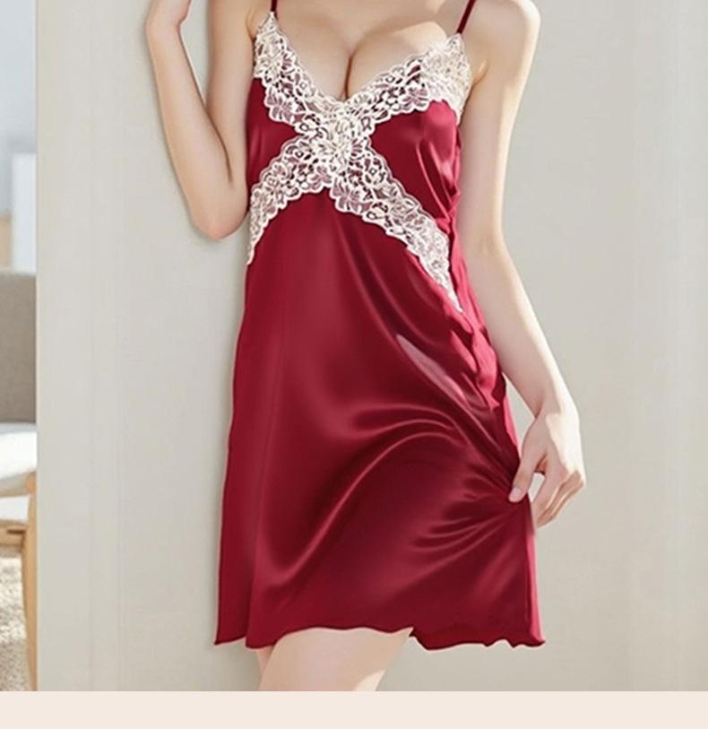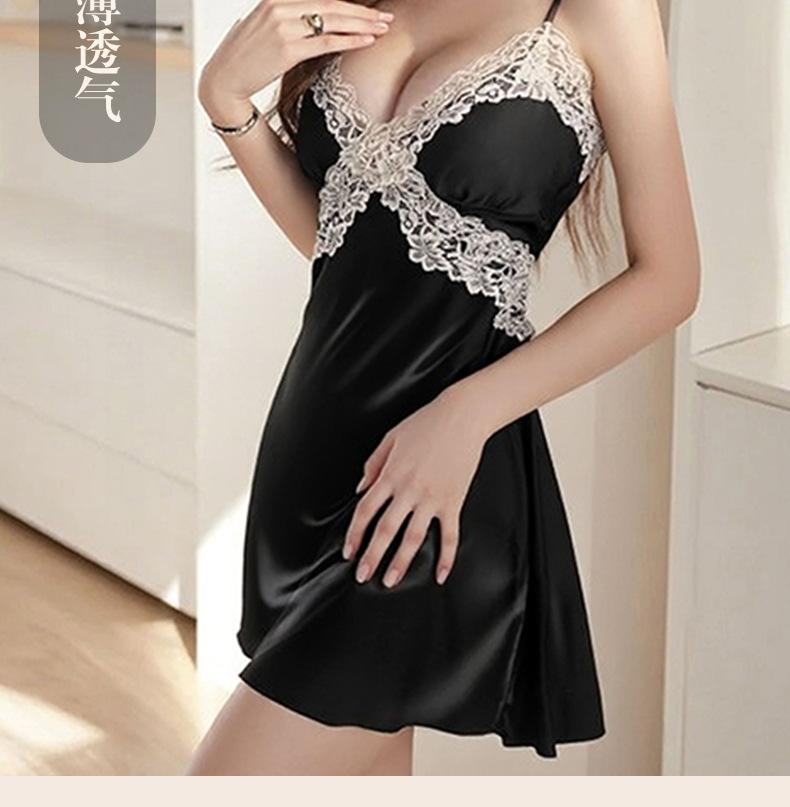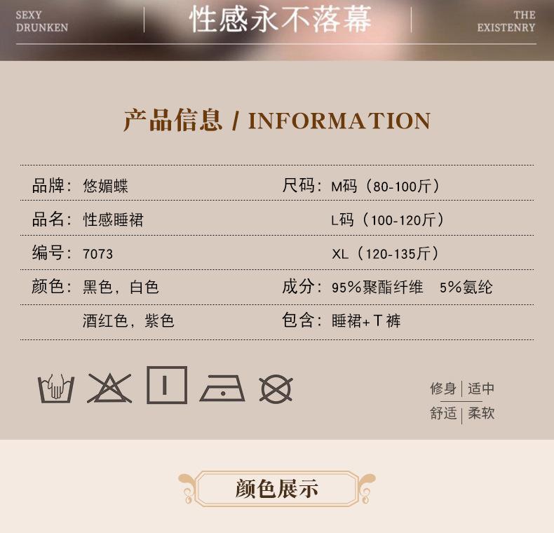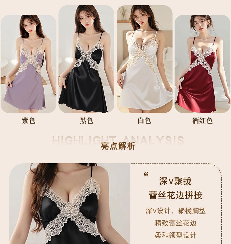 Black nightgown + T pants, White nightdress + T pants, Burgundy nightgown + T-back, Purple nightgown + thong