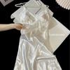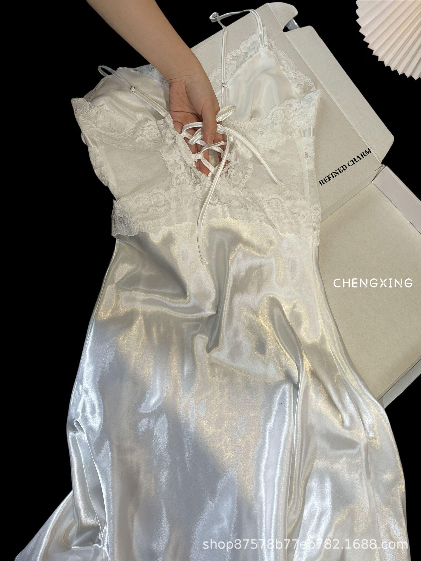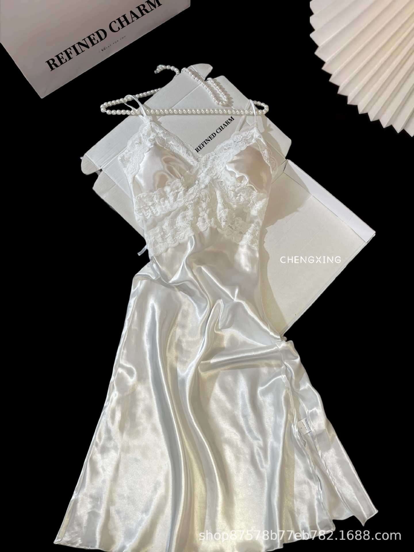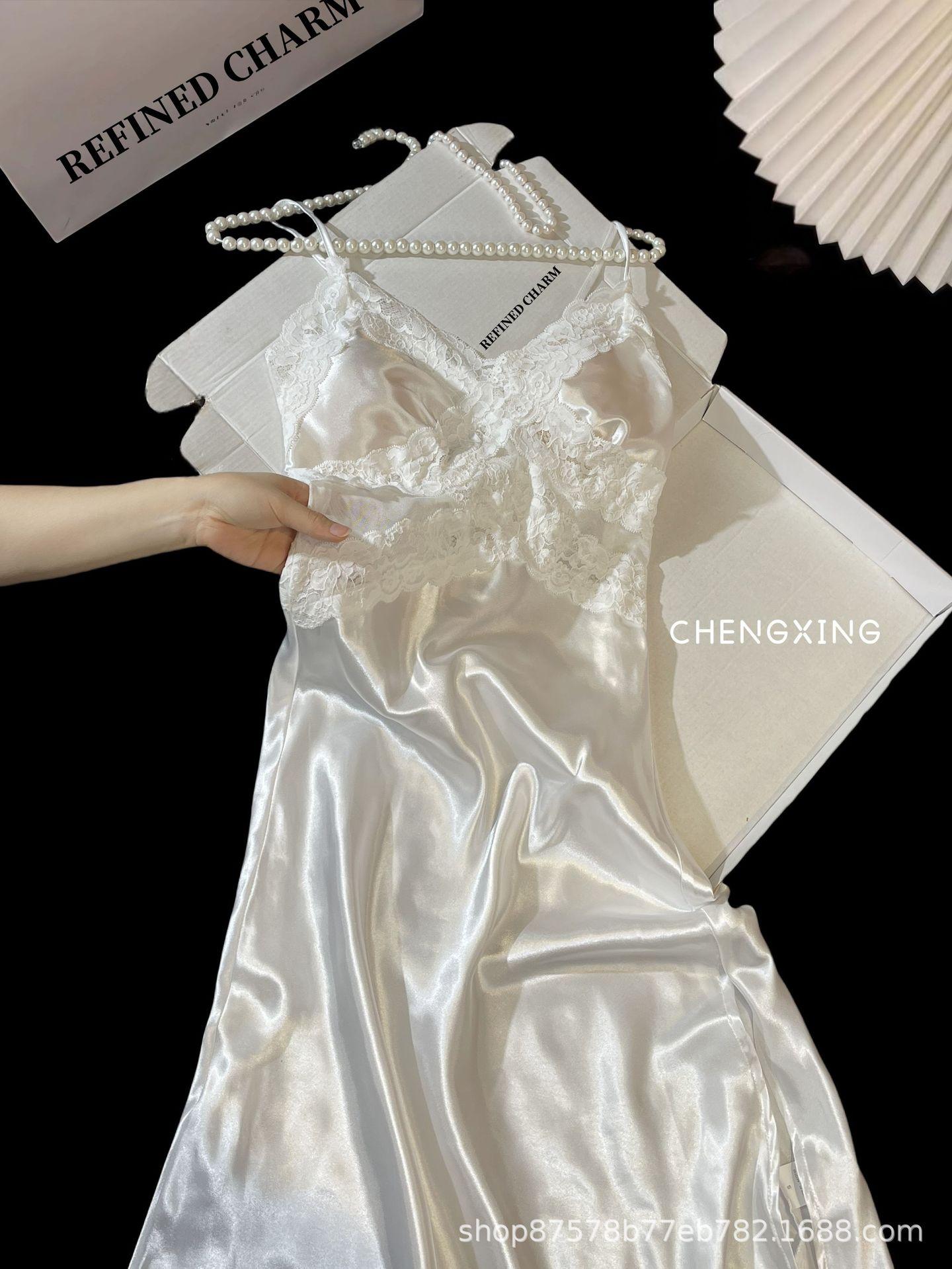 Estilo Boda Camisón de Tirantes Espagueti Mujer 2025 Nuevo Verano Encaje Primavera/Otoño Seda de Hielo Sexy con Almohadillas en el Pecho Pijama de Alta Gama