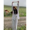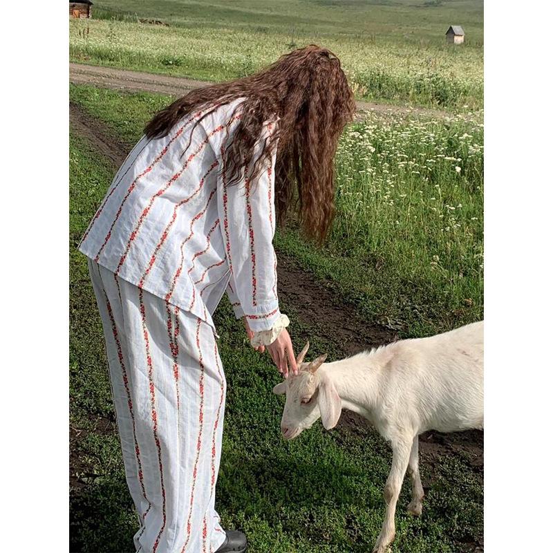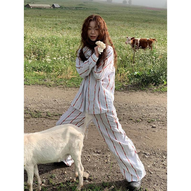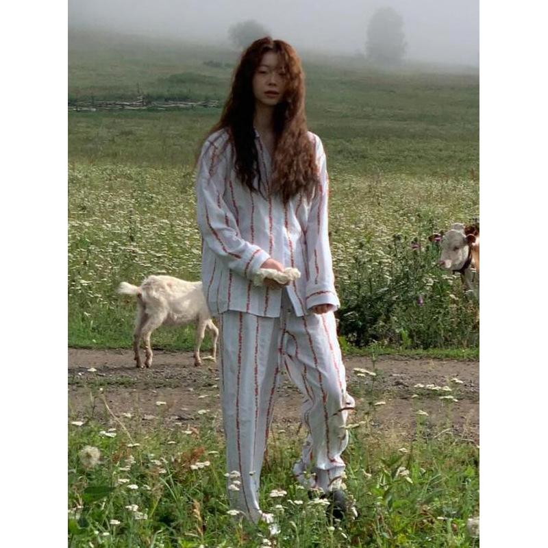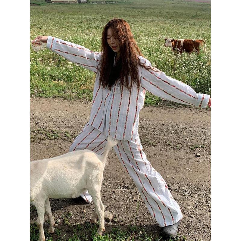 Pijama de manga larga para mujer estilo coreano floral a rayas para mujer primavera y otoño de alta gama talla grande pantalones ropa de casa traje de algodón puro