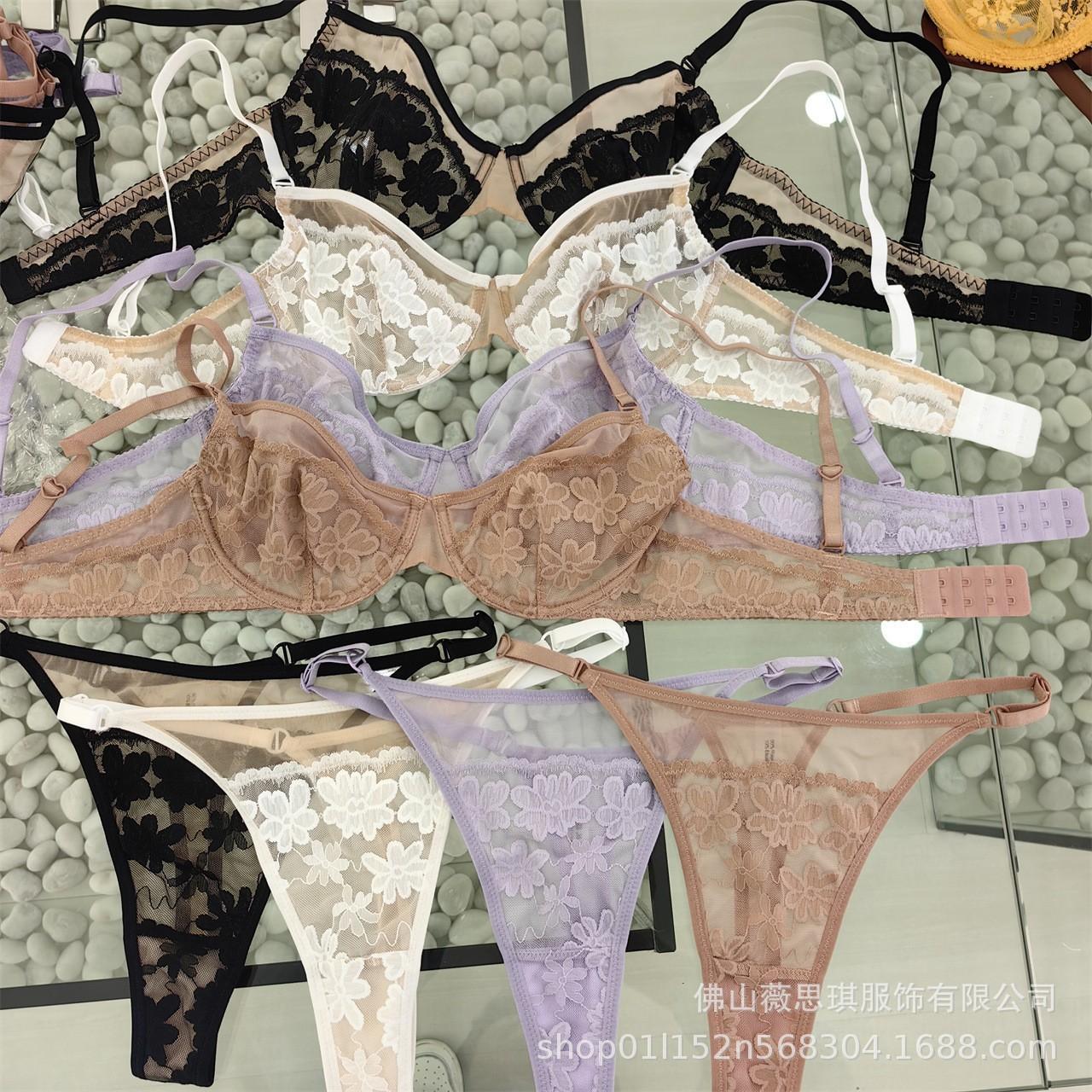Lencería sexy transfronteriza de verano súper delgada de malla transparente con bordado lencería para busto grande hace que se vea más pequeño sujetador anticacique y set de bragas