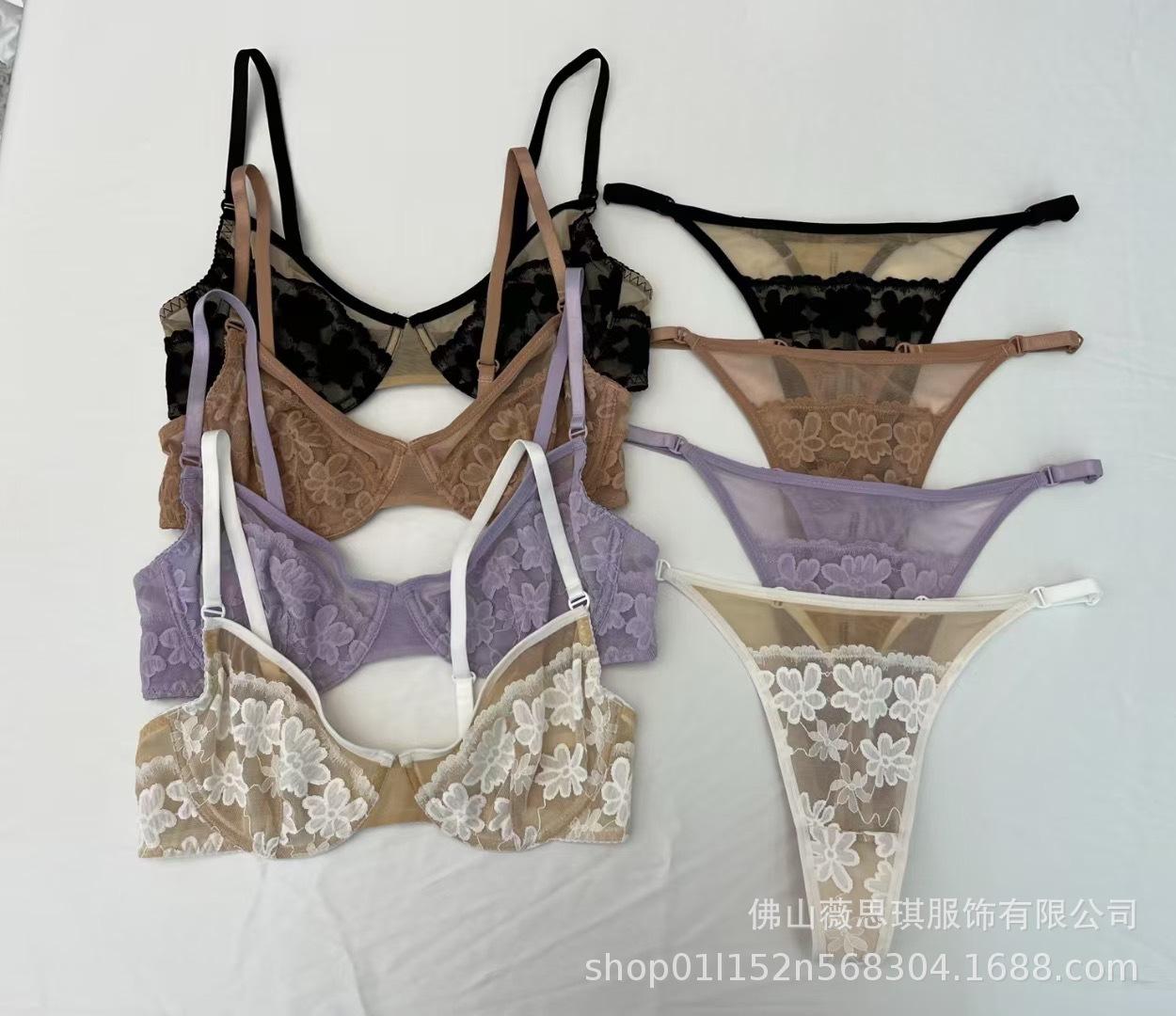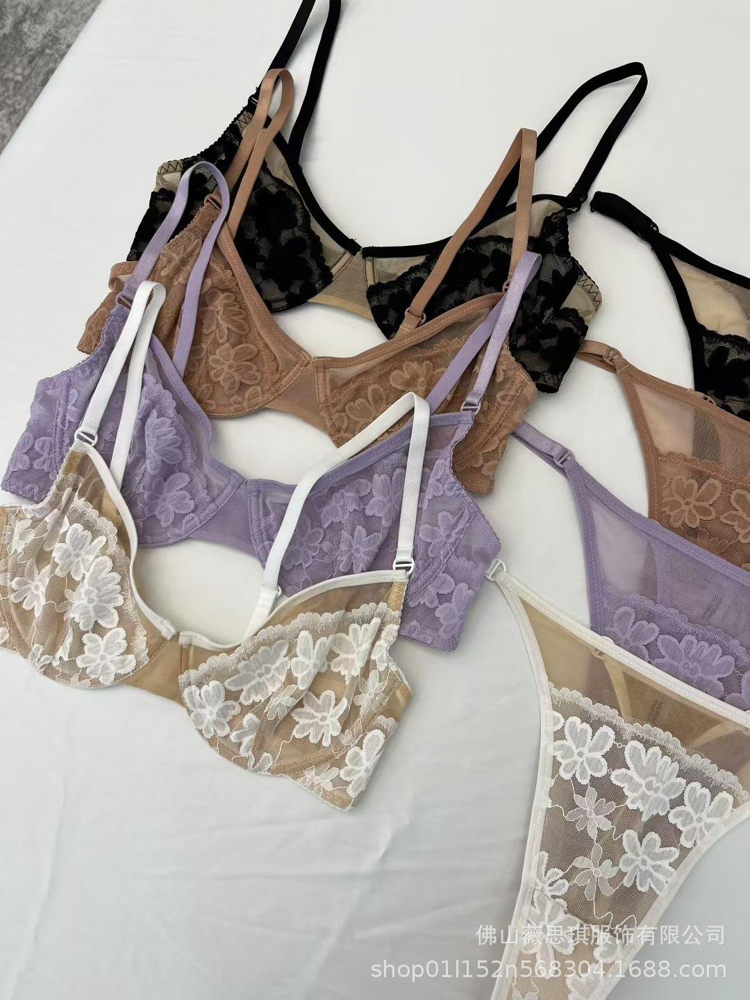Lencería Sexy Europea y Americana Francesa Ultradelgada Transparente Encaje Bordado Brasier Busto Grande Luce Más Pequeño Conjunto de Lencería Talla Grande