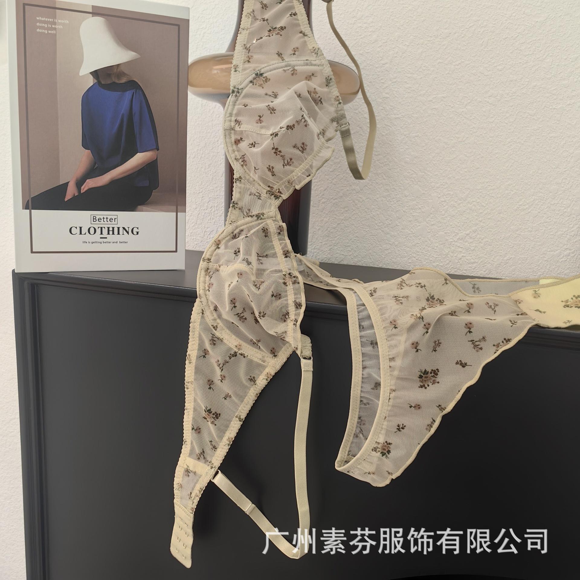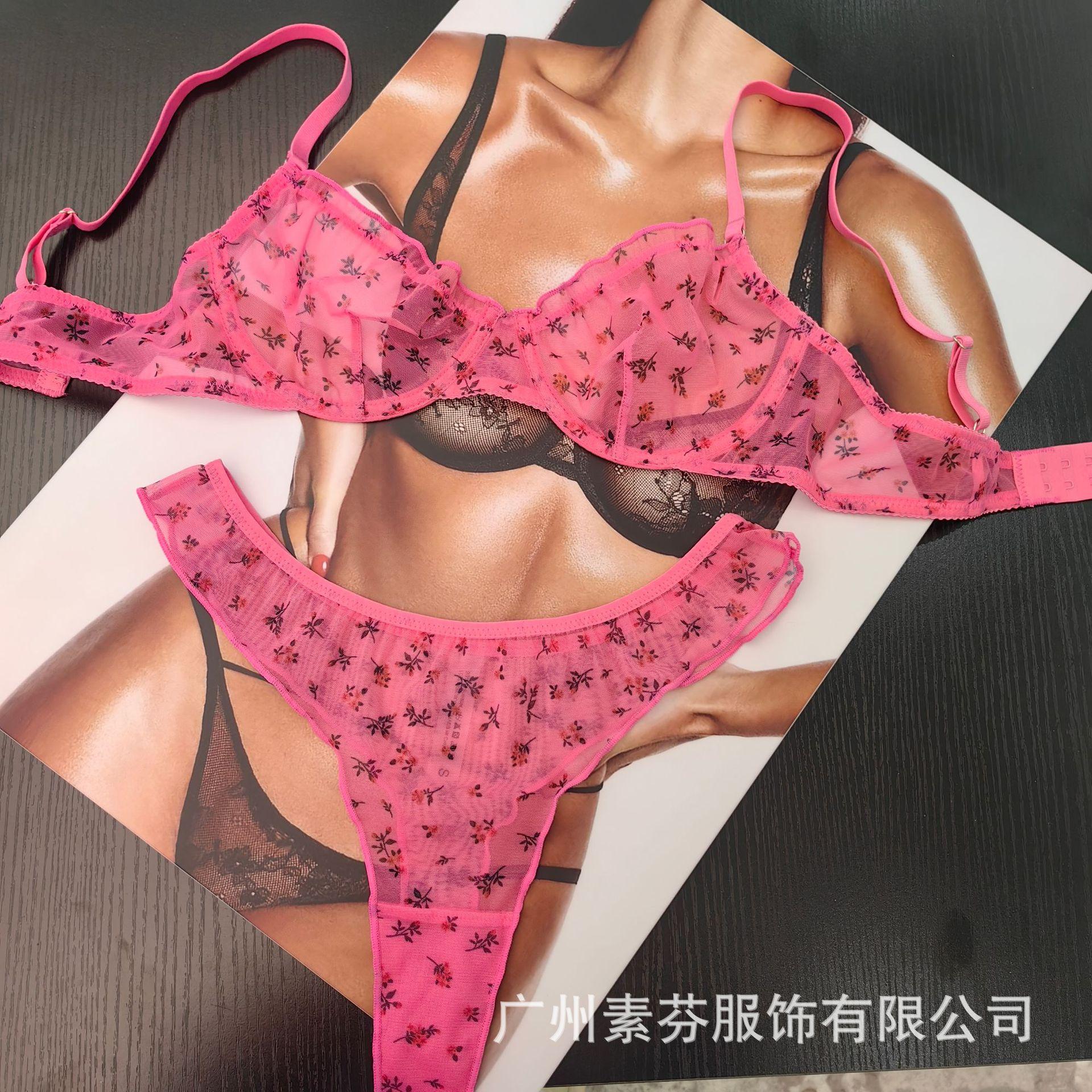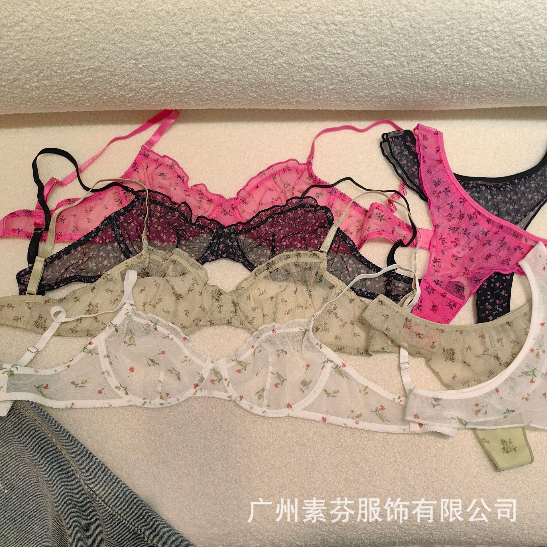 Lencería de Comercio Exterior Encaje Francés Pequeño Floral Estilo Pastoral Adolescente Super Delgado Push-up Cómodo Conjunto de Brasier Tanga