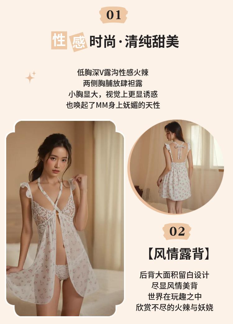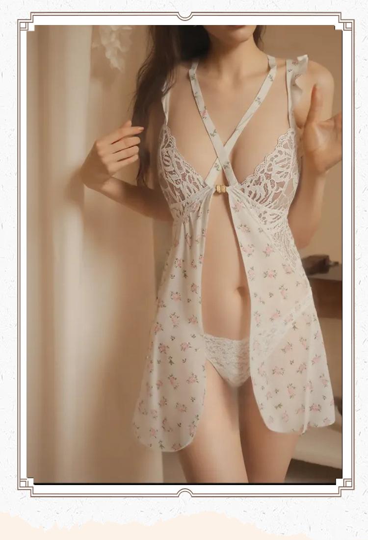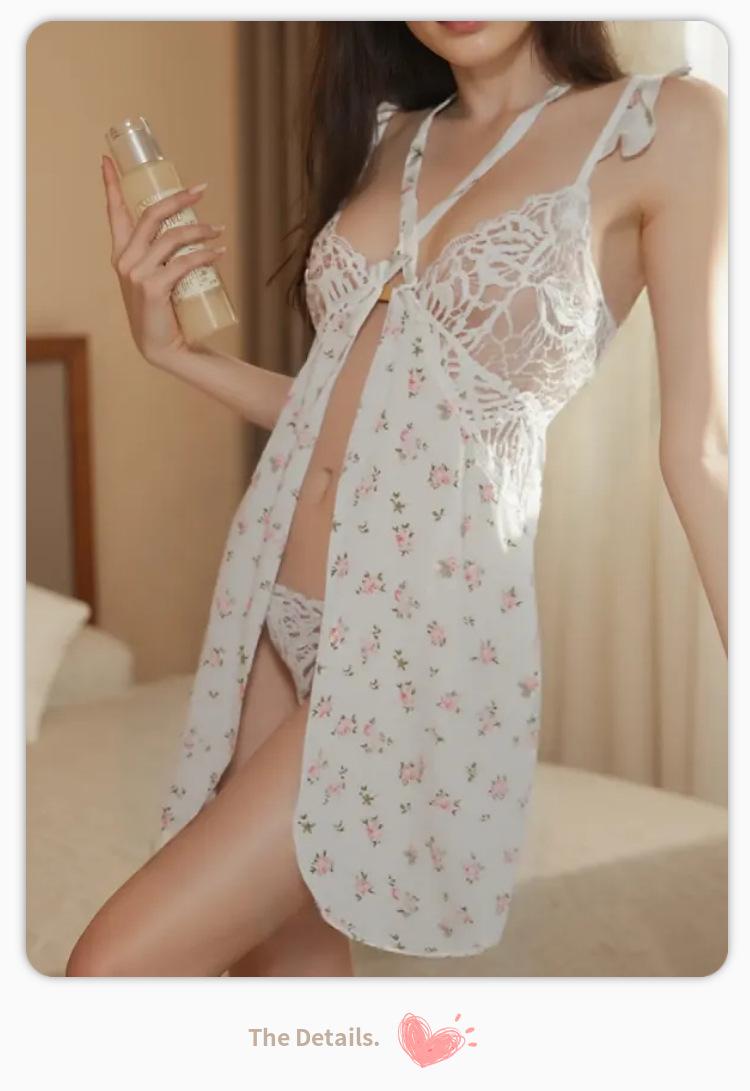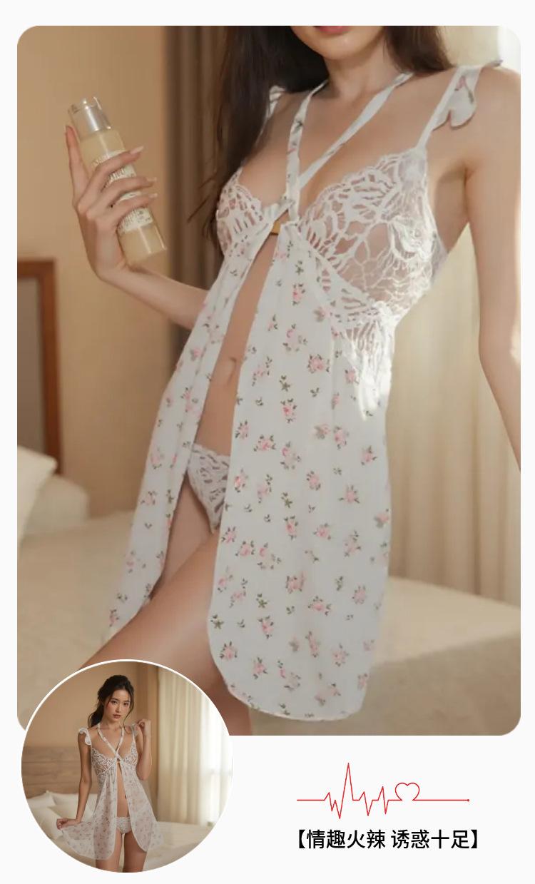 Divertido Camisón Dulce Estampado Floral Malla Encaje Patchwork Profundo V Tentación Sexy Espalda Descubierta Ropa de Dormir para Mujer